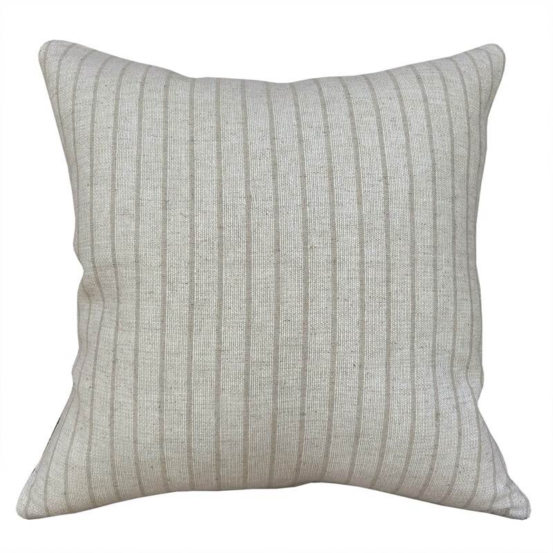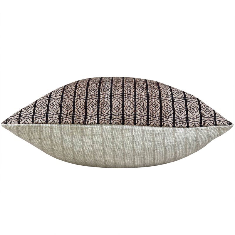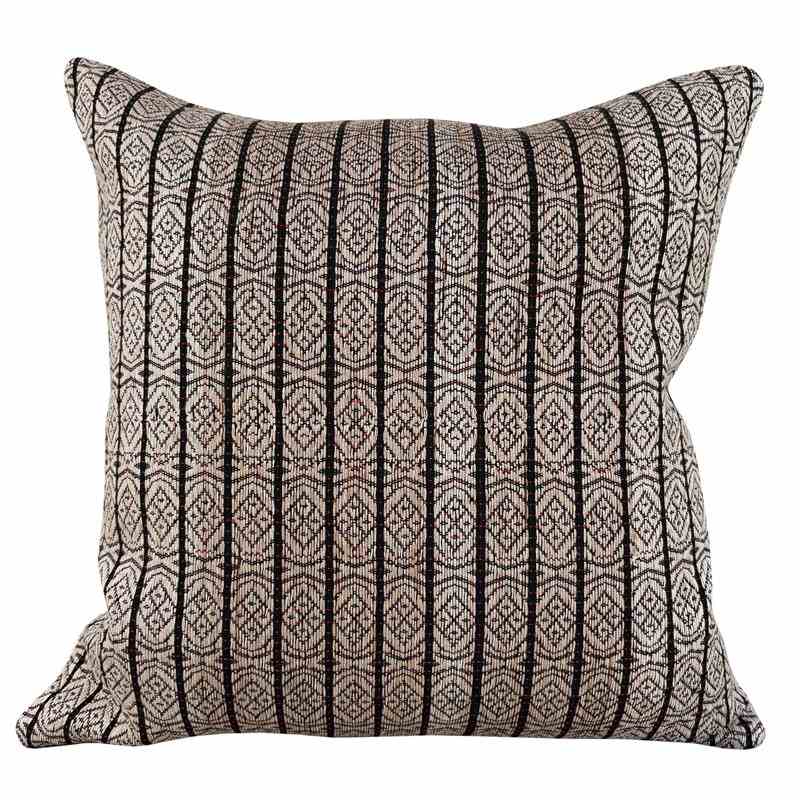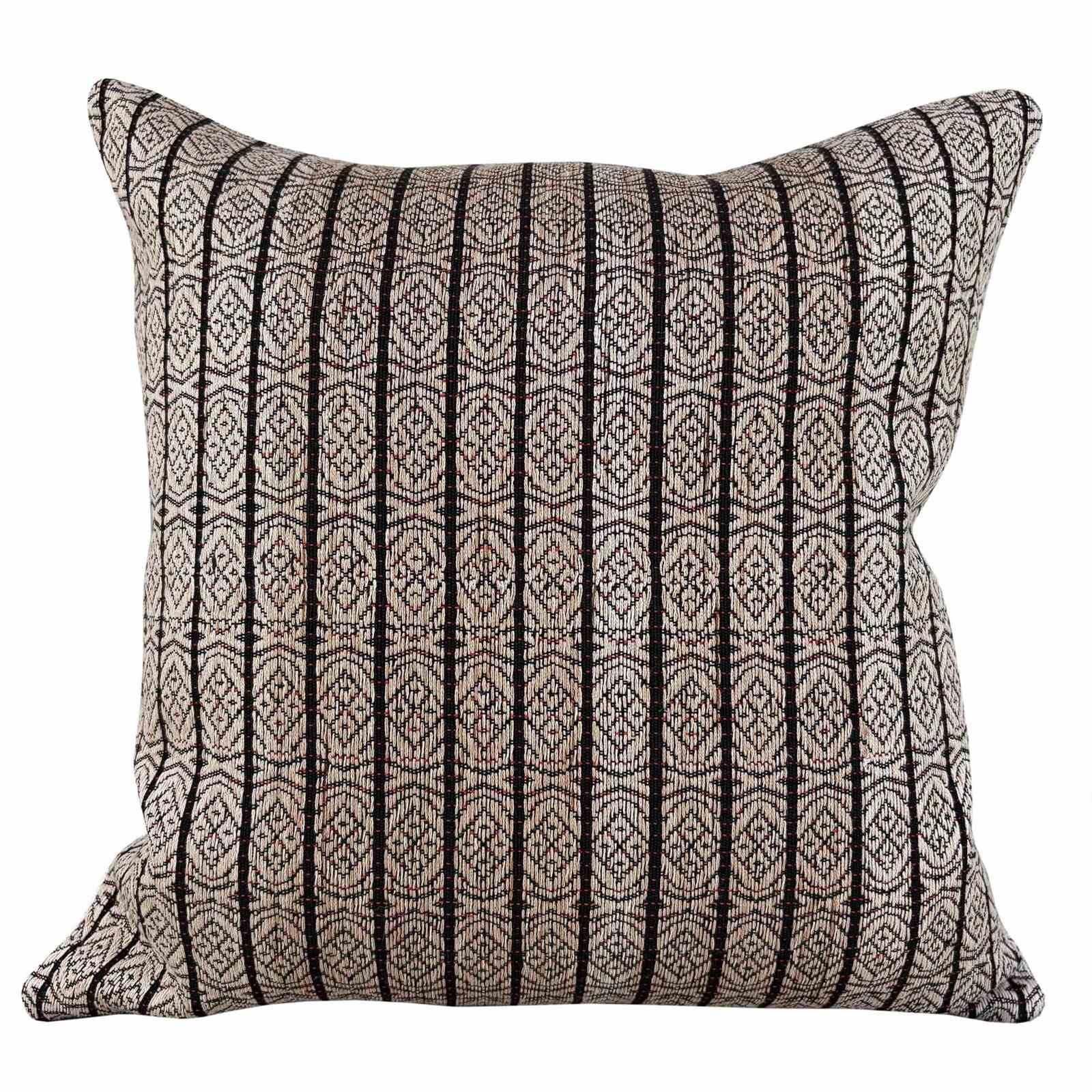 This lovely little cushion is made from a vintage hand woven Chin hilltribe textile. The colours are soft tones of light and dark brown with a tiny red weft stitch running through at intervals. The back is a contemporary hand woven textile in a cream stripe. There is an invisible zip and deluxe feather pad.