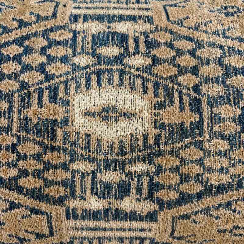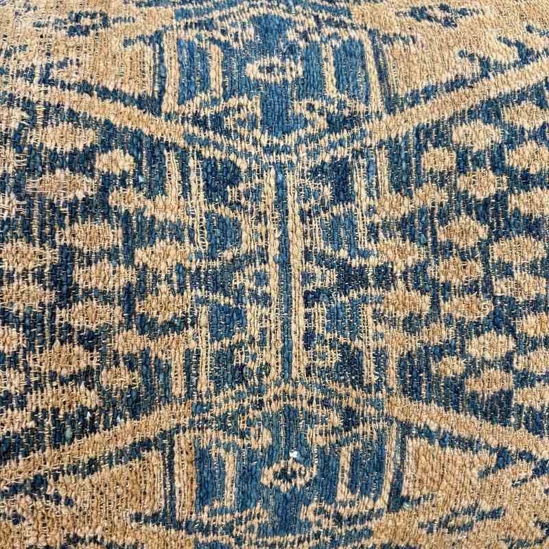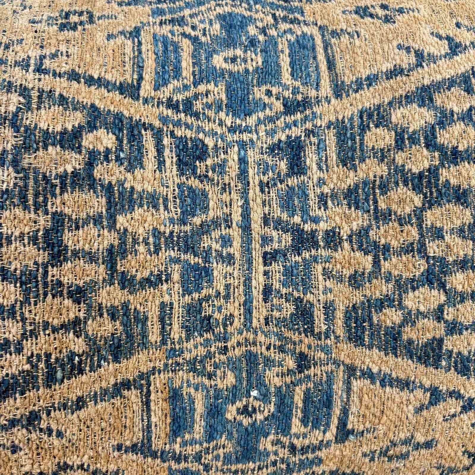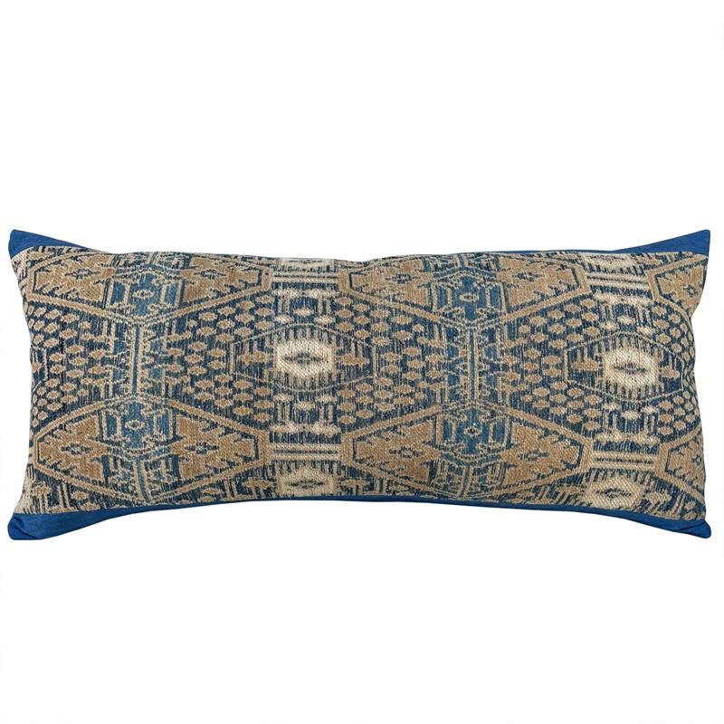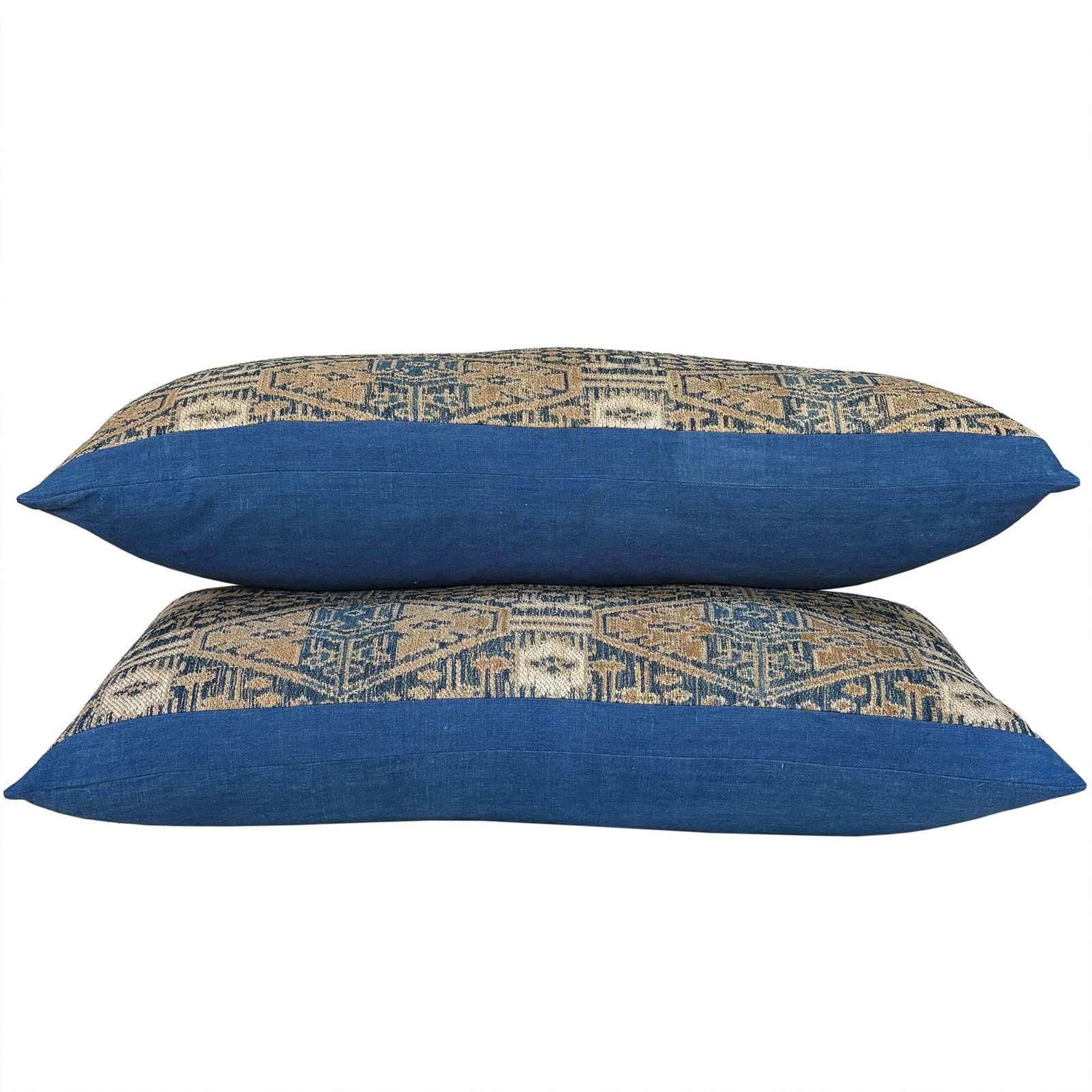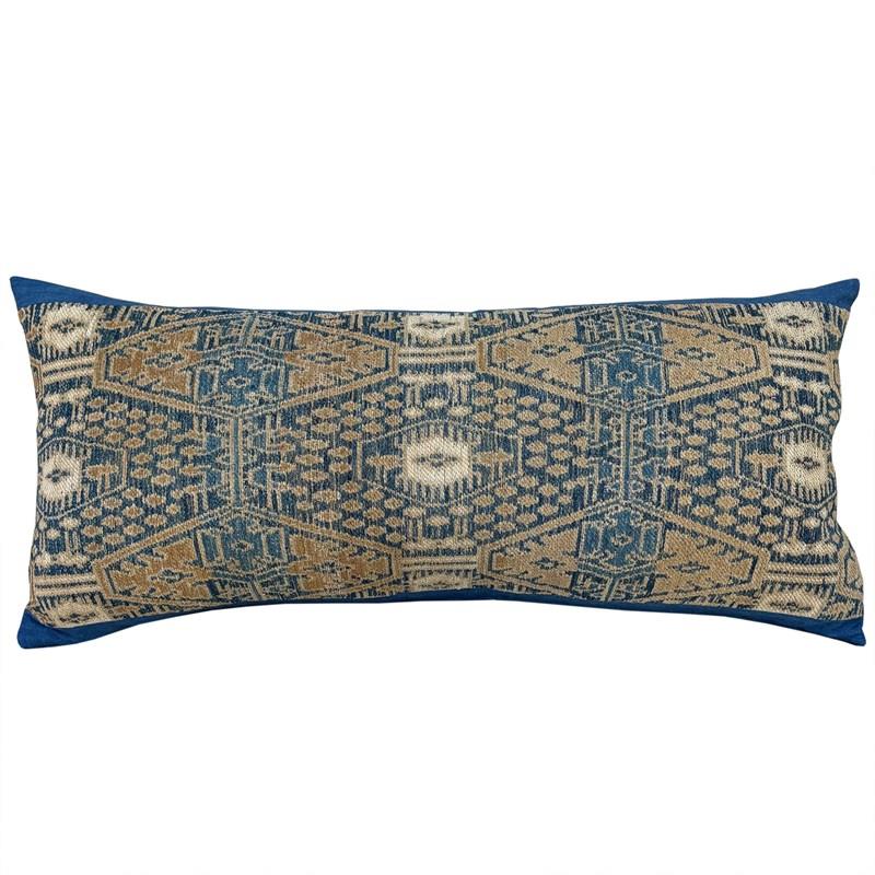 This beautiful long cushion is made from a vintage Dai minority wedding blanket in light and dark indigo, camel and off white. To show off the textile which was woven on a narrow loom, it's been framed with a border top and bottom. The fabric for this border is also taken from a vintage quilt and is an indigo dyed handwoven cotton. I've backed the cushion with indigo dyed vintage hemp and there is a zip fastener and feather pad.