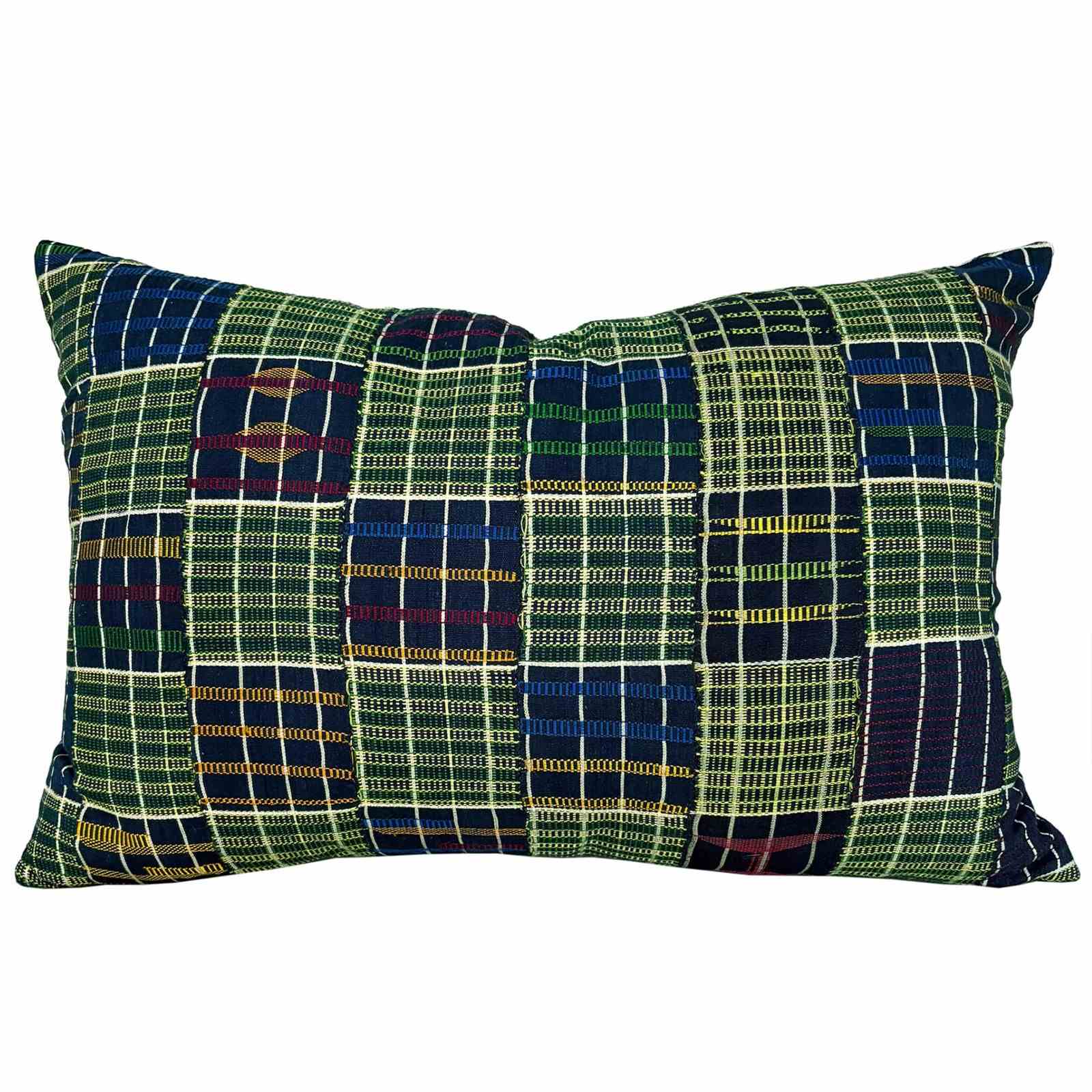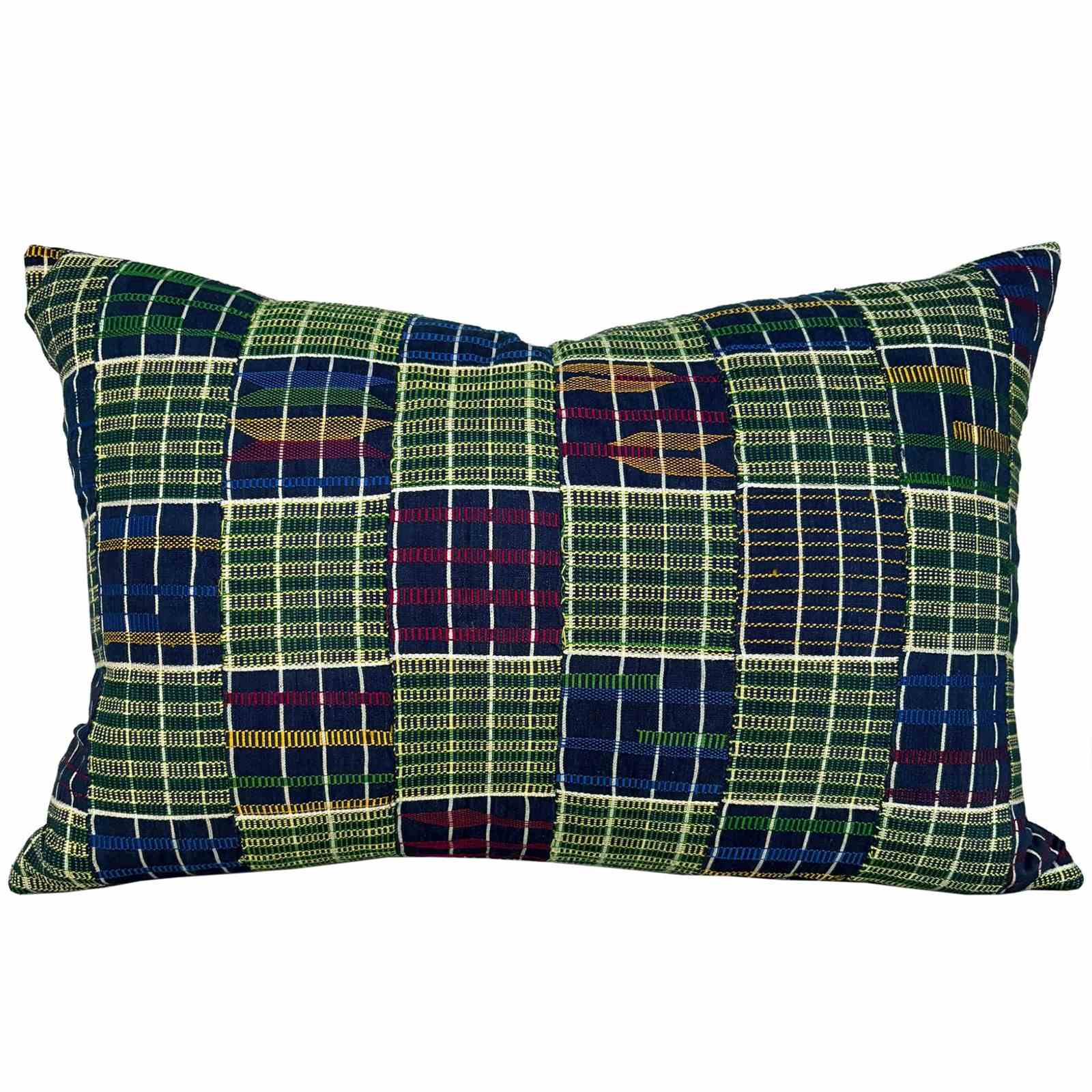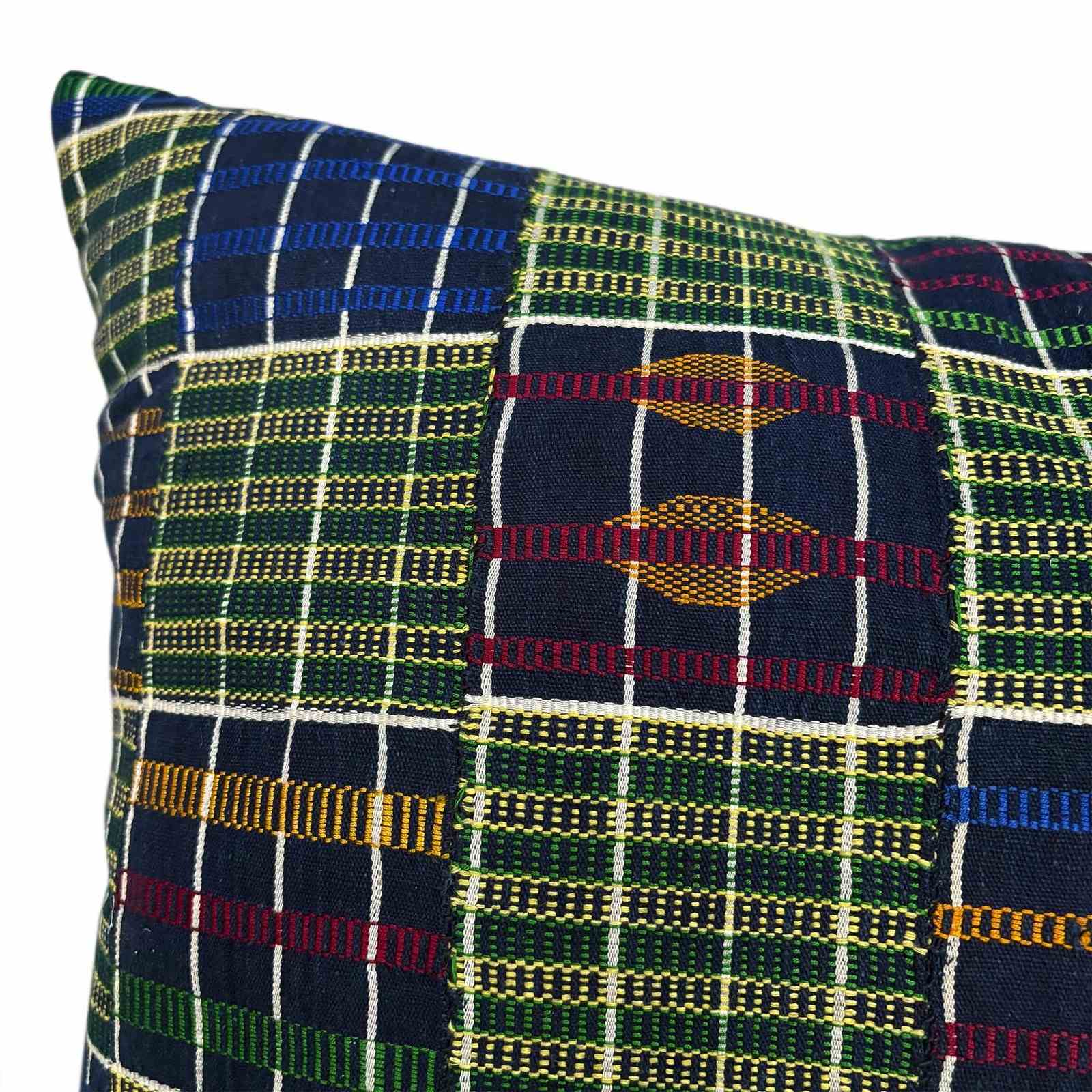 These striking cushions are made from a vintage Ewe kente cloth. The fabric is a dark blue with a white stripe on the warp and regular weft blocks in yellow and green. At intervals there are other weft decorations in yellow, blue and burgundy. I think its a very attractive textile overall. I've backed the cushions in a vintage hand loomed textile from East China in dark blue with a white pinstripe. There are zip fasteners and deluxe feather inserts.