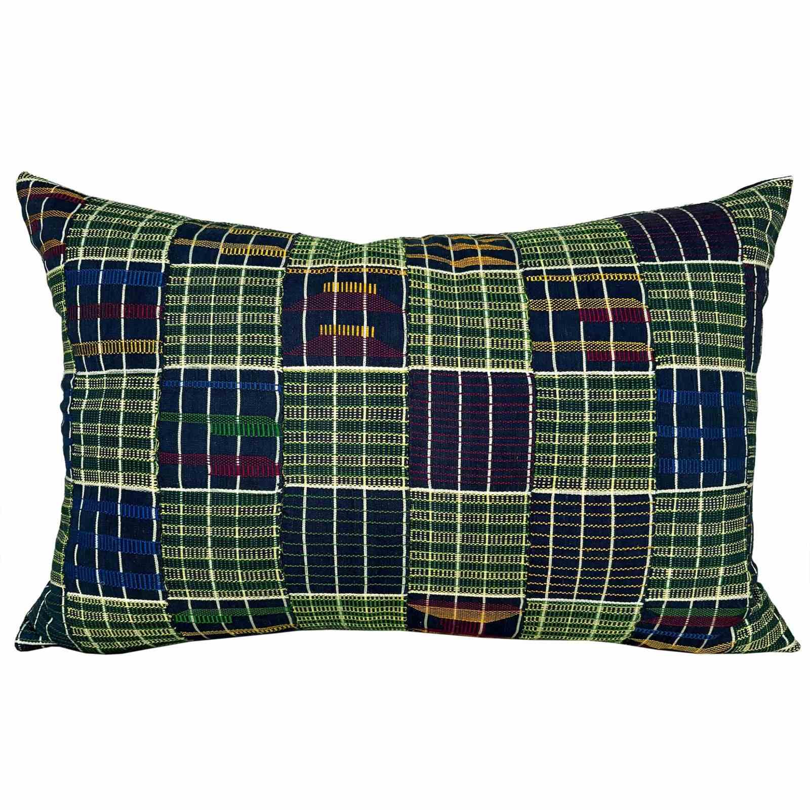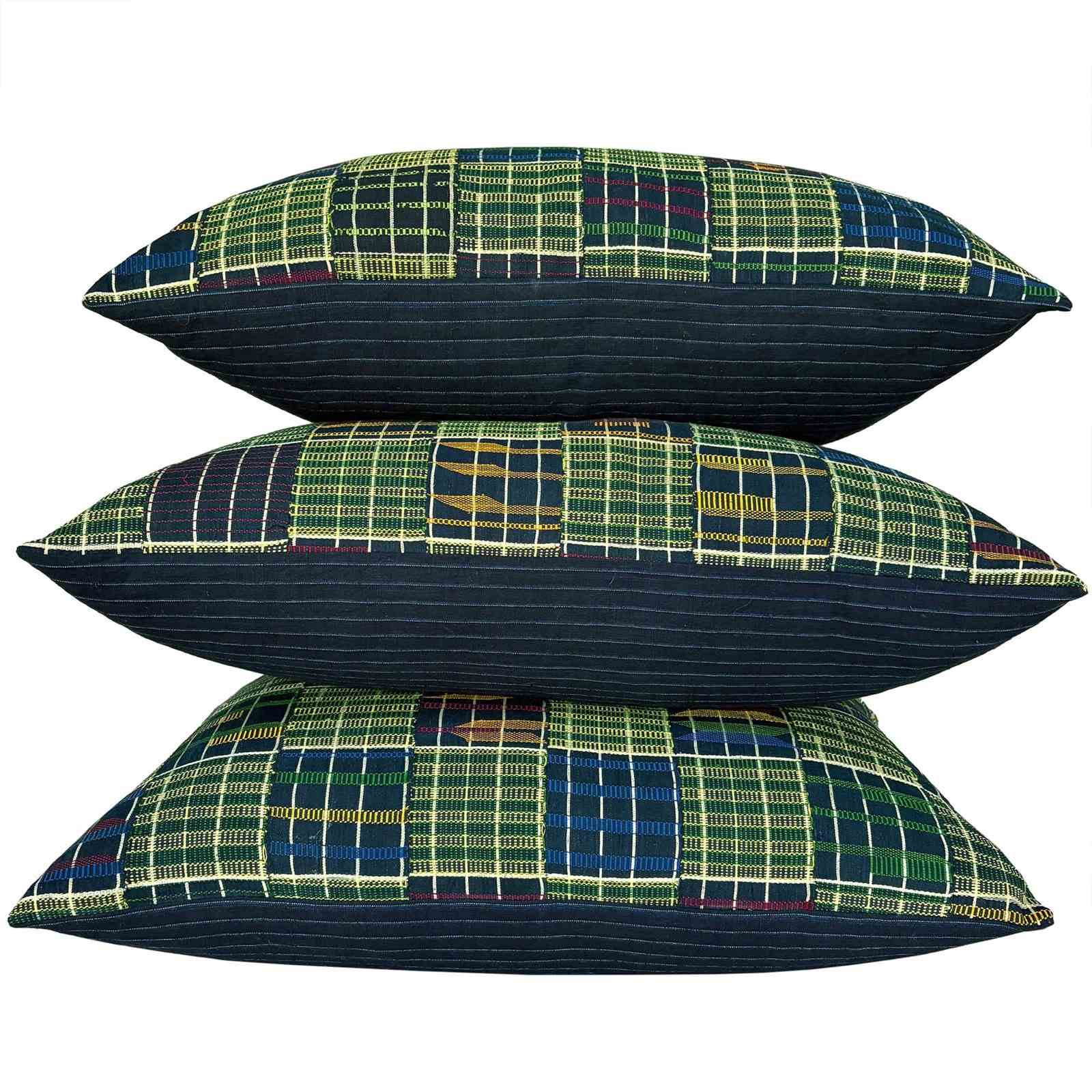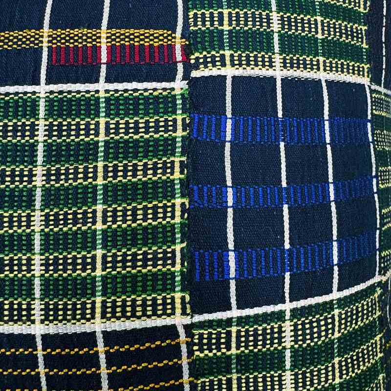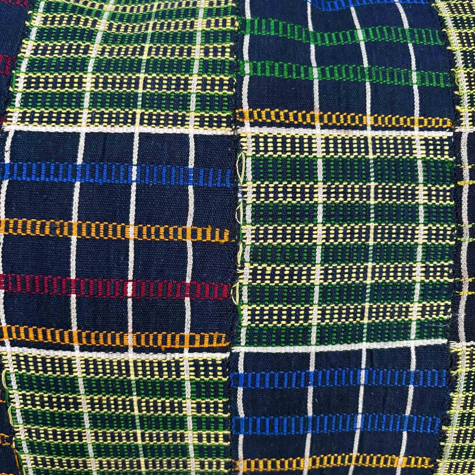 These striking cushions are made from a vintage Ewe kente cloth. The fabric is a dark blue with a white stripe on the warp and regular weft blocks in yellow and green. At intervals there are other weft decorations in yellow, blue and burgundy. I think its a very attractive textile overall. I've backed the cushions in a vintage hand loomed textile from East China in dark blue with a white pinstripe. There are zip fasteners and deluxe feather inserts.