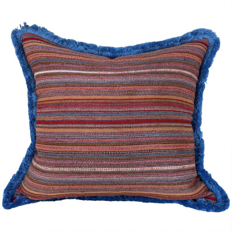 These cushions are made from a finely woven wool jajim. The jajim was woven in mid C20 on a loom about 10 inches wide and you can see the width, as the selvedges are the white strips. The colours are mainly tones of red and yellow with some light blue. I've backed the cushions with a heavyweight linen in natural, and added a blue cotton fringe. There are invisible zips and deluxe feather inserts.