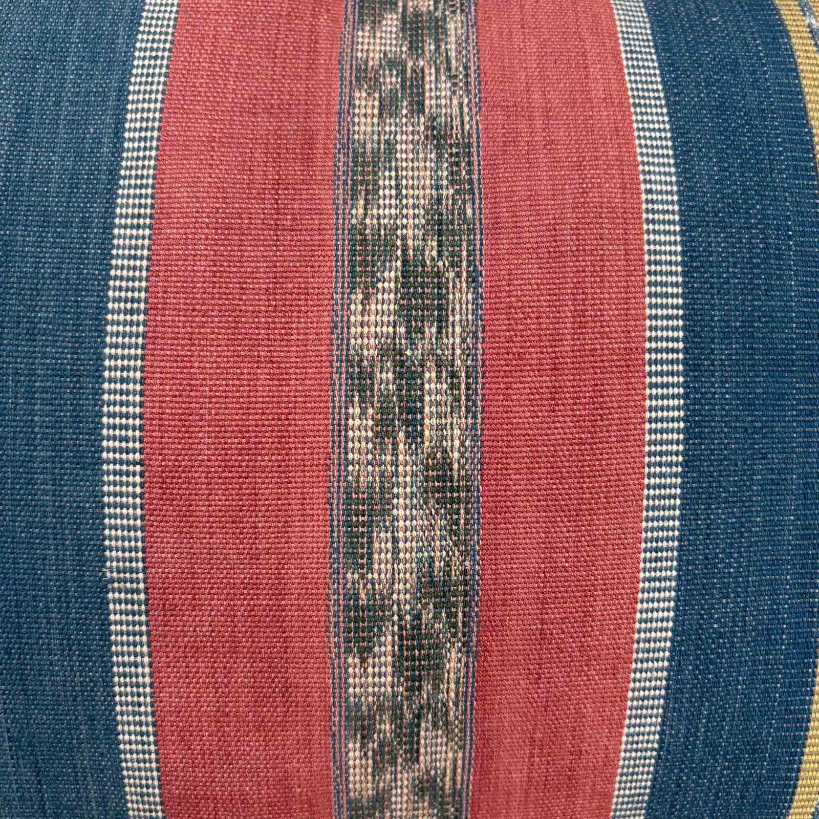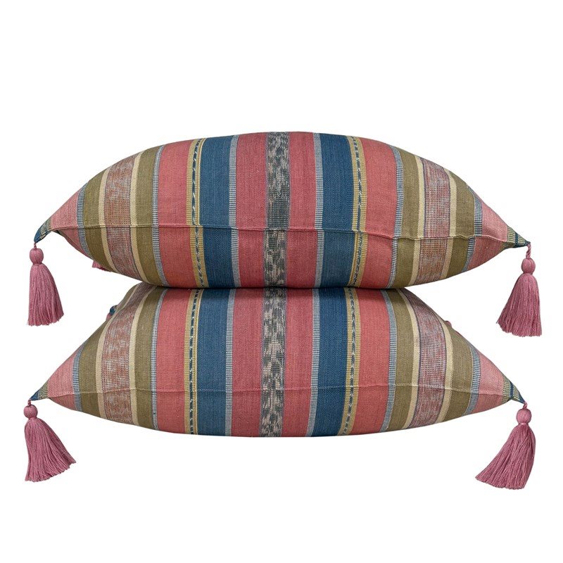 These beautiful cushions are made from a contemporary cotton shawl from the Sikka Regency, Flores, Indonesia. The shawl was woven in thick cotton using the ikat technique. The colours are all natural and are a soft palette of pink, olive green and blue. There are hand made tassels at the corners, invisible zips and deluxe feather pads.