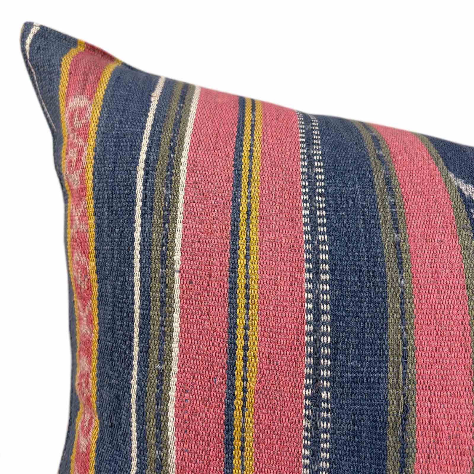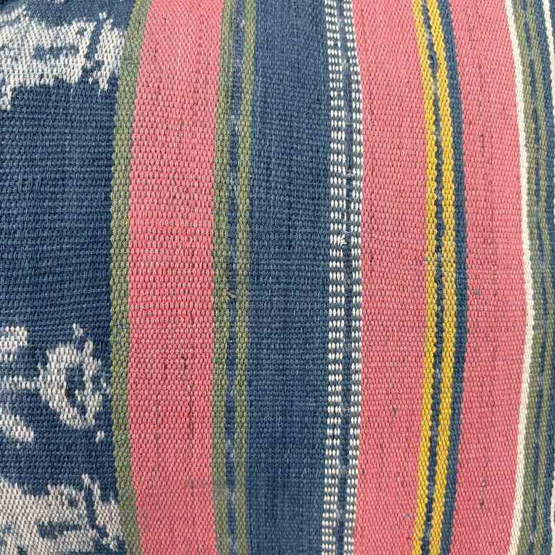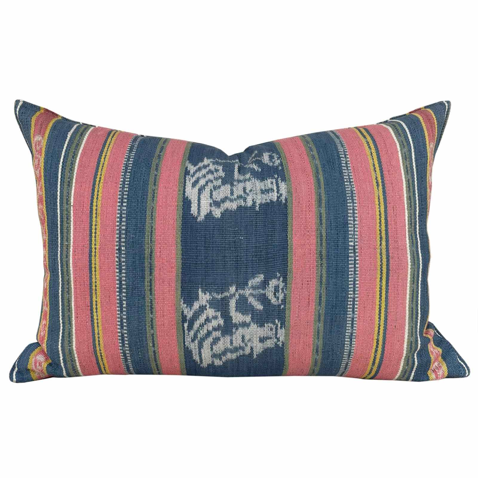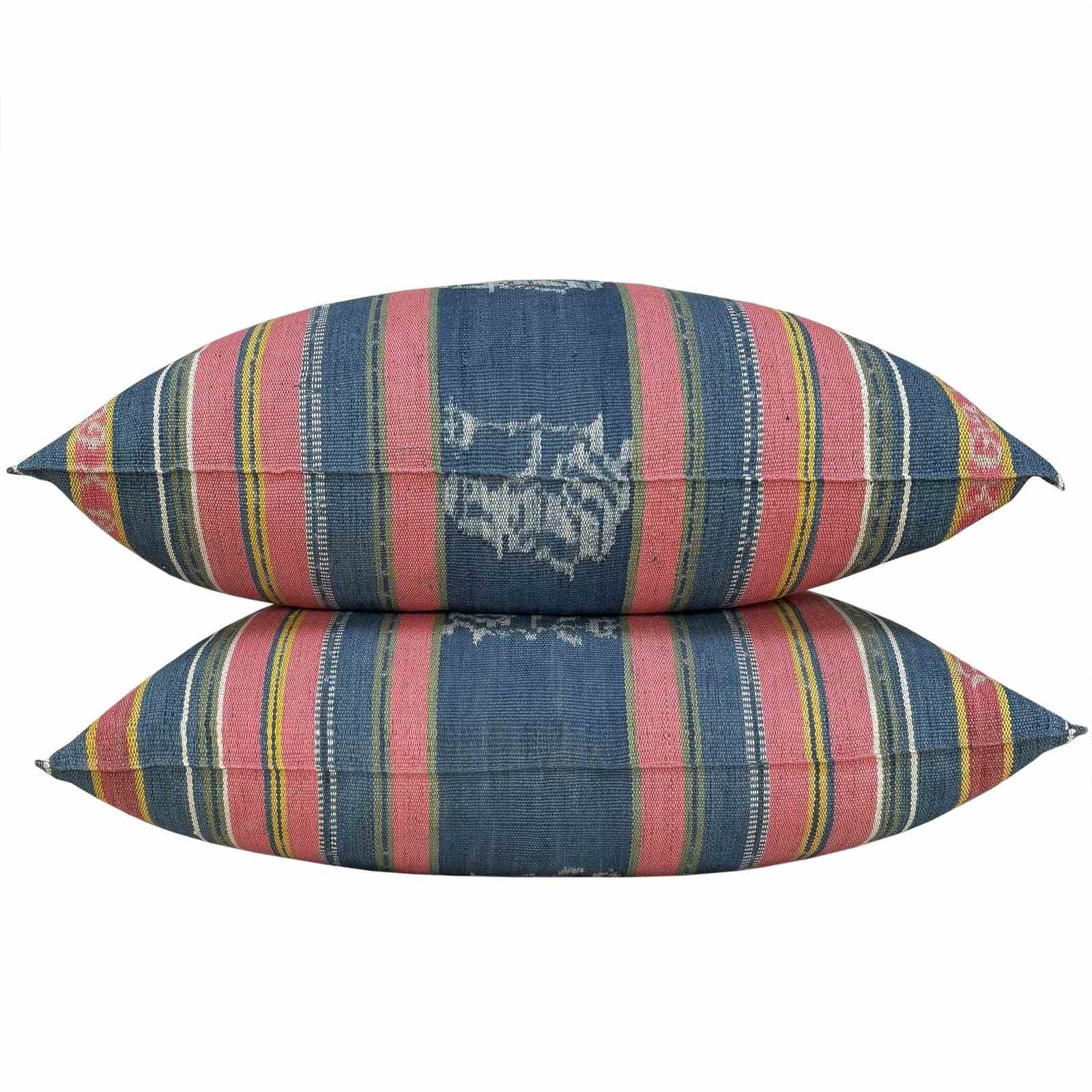 These beautiful cushions are made from a contemporary cotton shawl from the Sikka Regency, Flores, Indonesia. The shawl was woven in thick cotton using the ikat technique. The colours are all natural and are a soft palette of blue and pink with a yellow pinstripe. Having invisible zips and deluxe feather pads.