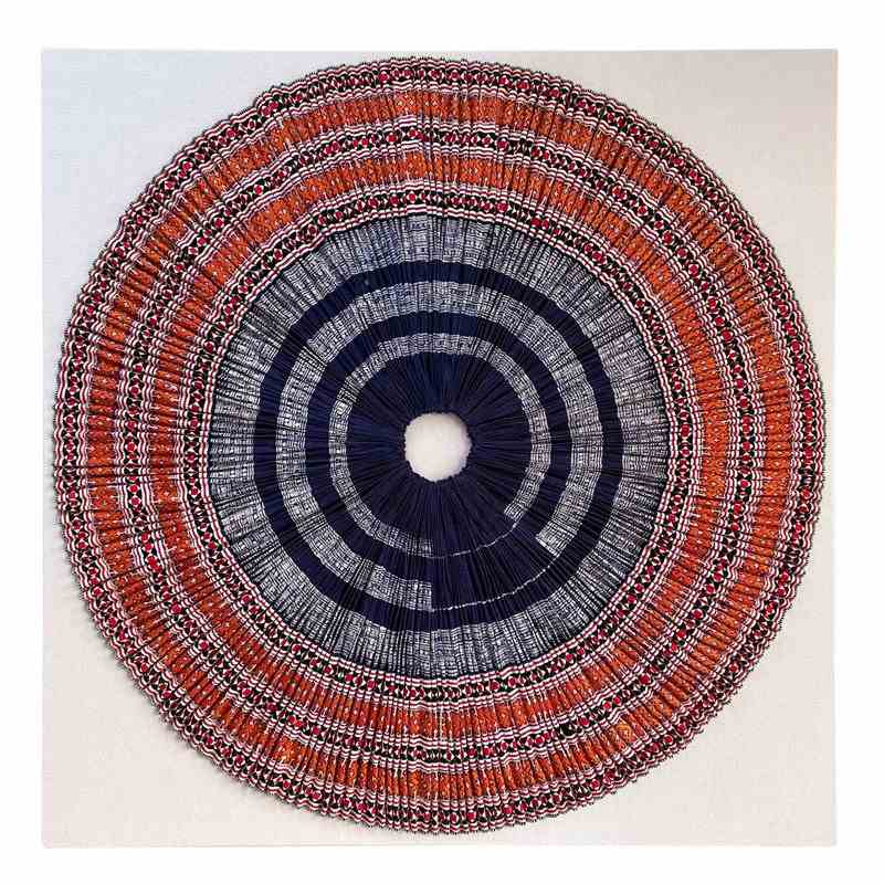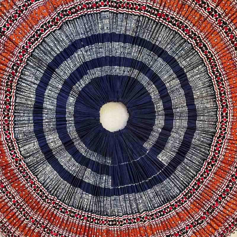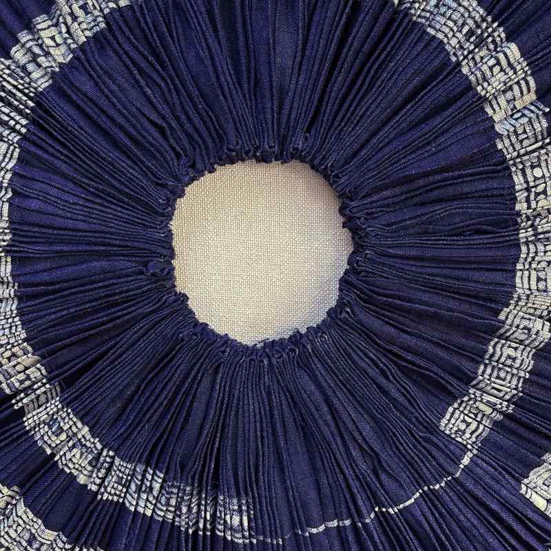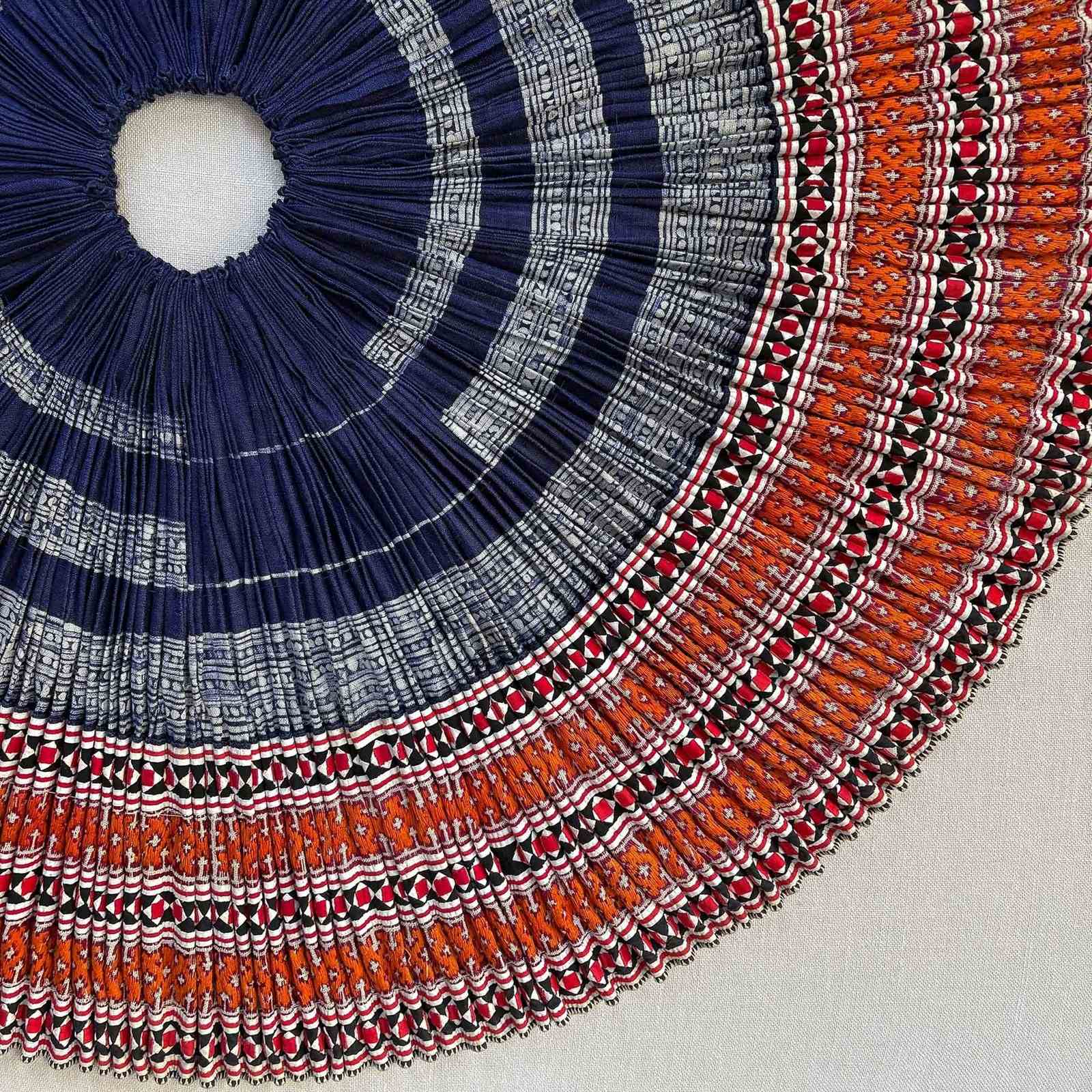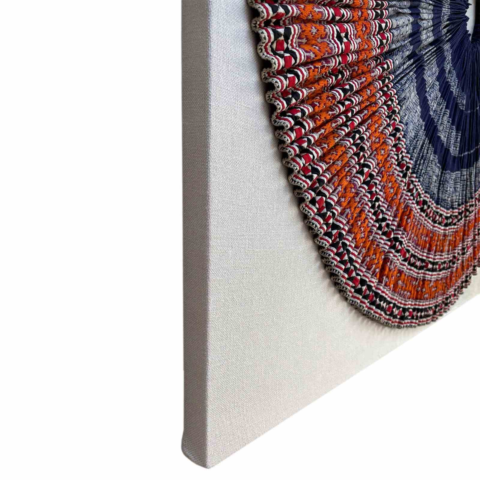I've mounted the skirt on heavy linen over a stretched canvas frame. The pleating gives a wonderful sculptural character to the piece.