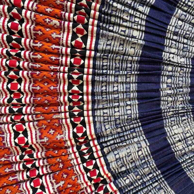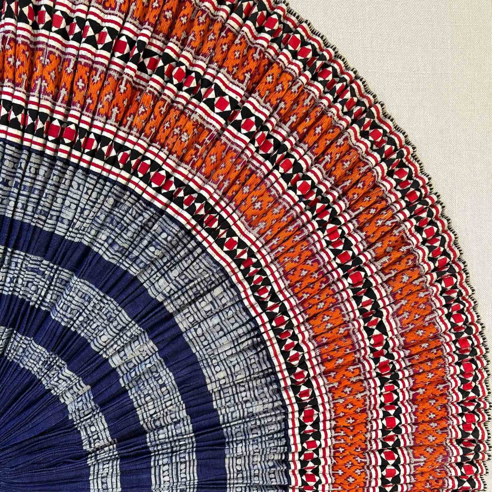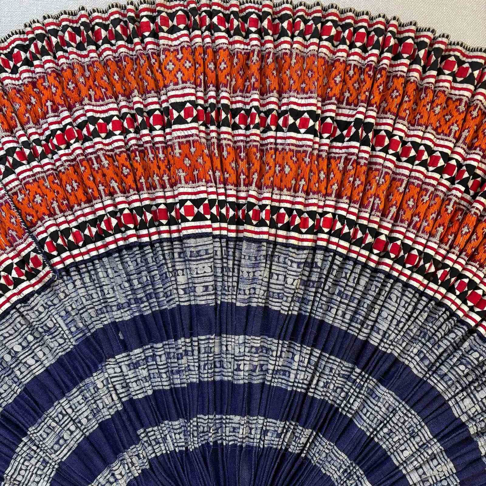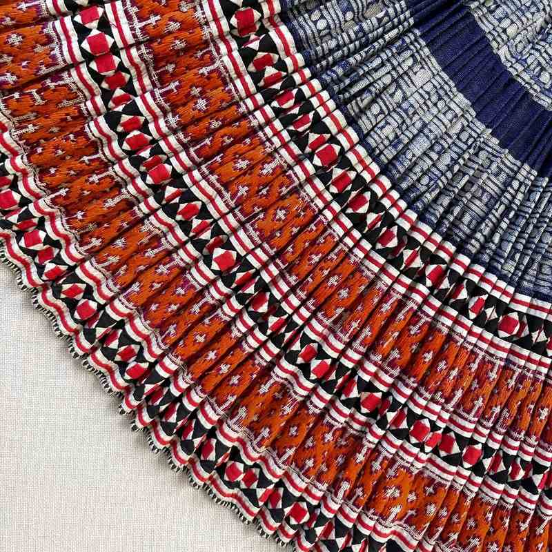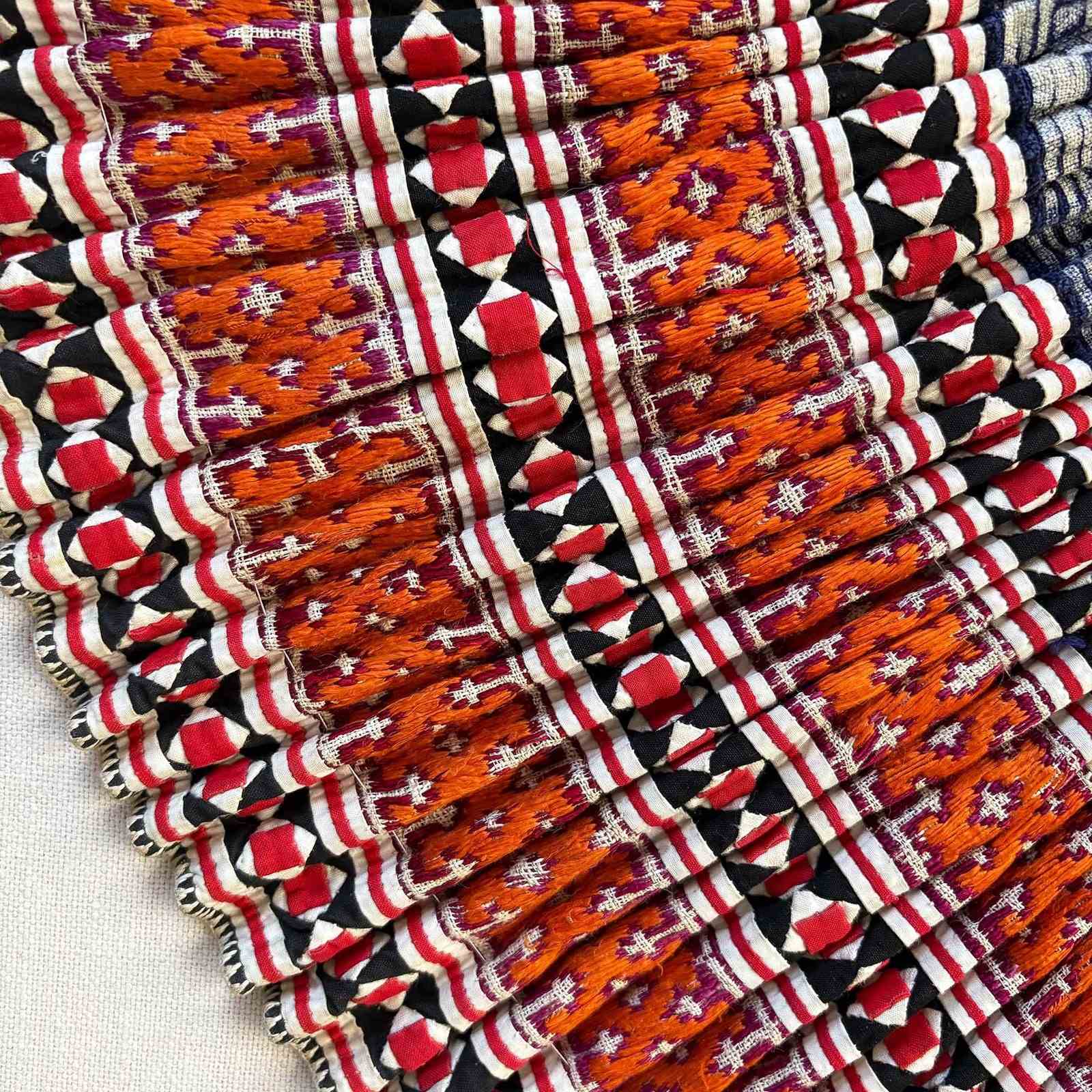 This heavily pleated skirt is by the Miao ethnic minority from Sichuan, SW China. The skirt dates to the first half of the C20. It is made from hemp with an indigo batik pattern to the main body of the skirt and a deep border with embroidery in pink and orange silk and applique in black, white and red cottons. The needlework skills are exquisite and considering that there is over 4.5m of skirt, it would have taken a very long time to do. The skirt was finally pleated and it would have sashayed wonderfully as the wearer moved.