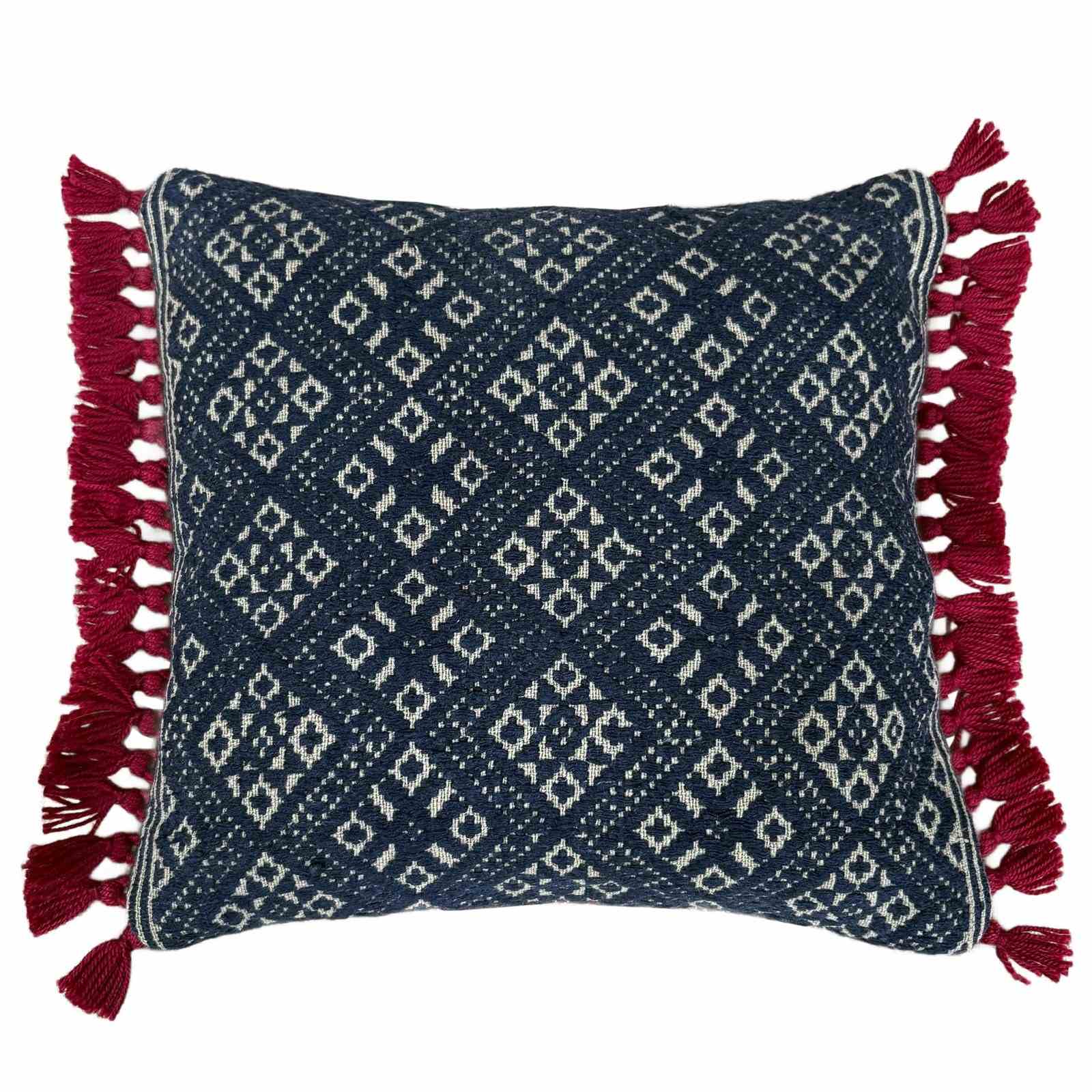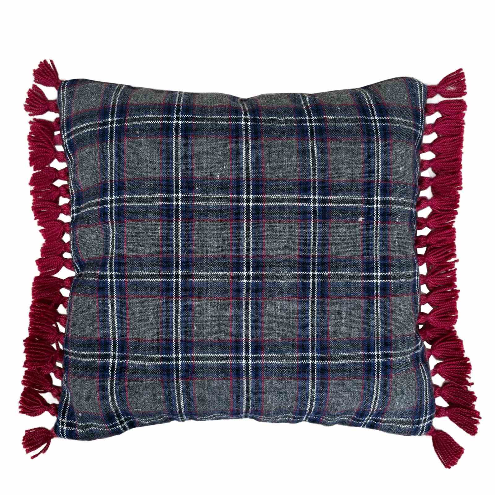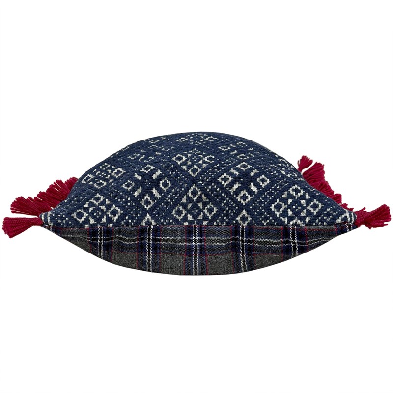 This pillow is made from a fragment of a vintage Dong hill tribe wedding blanket. The blanket was hand woven using hand spun yarn and dates to mid C20. The cotton ground is a pale grey and the pattern in supplementary floating weft, is a dark blue. I've added a vintage tasselled fringe in red and backed the pillow with another vintage hand loomed textile which is an attractive grey and blue plaid with pinstripes in white and red. The pillow is filled with Provencal lavender selected for its long lasting scent.