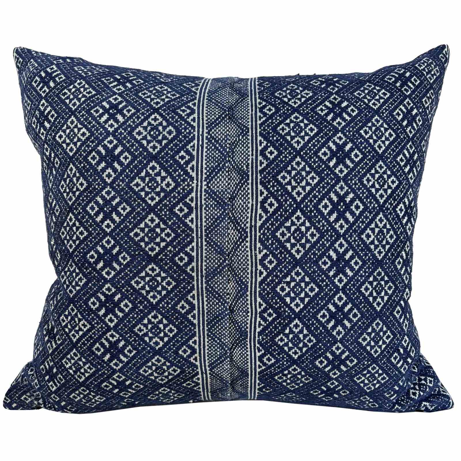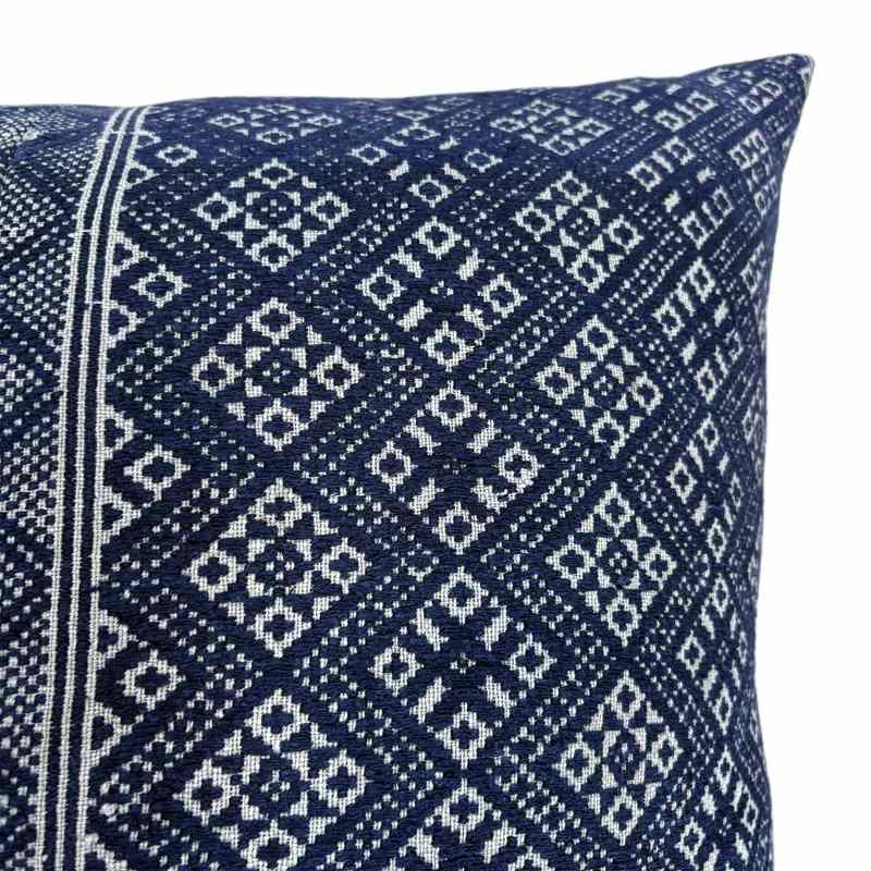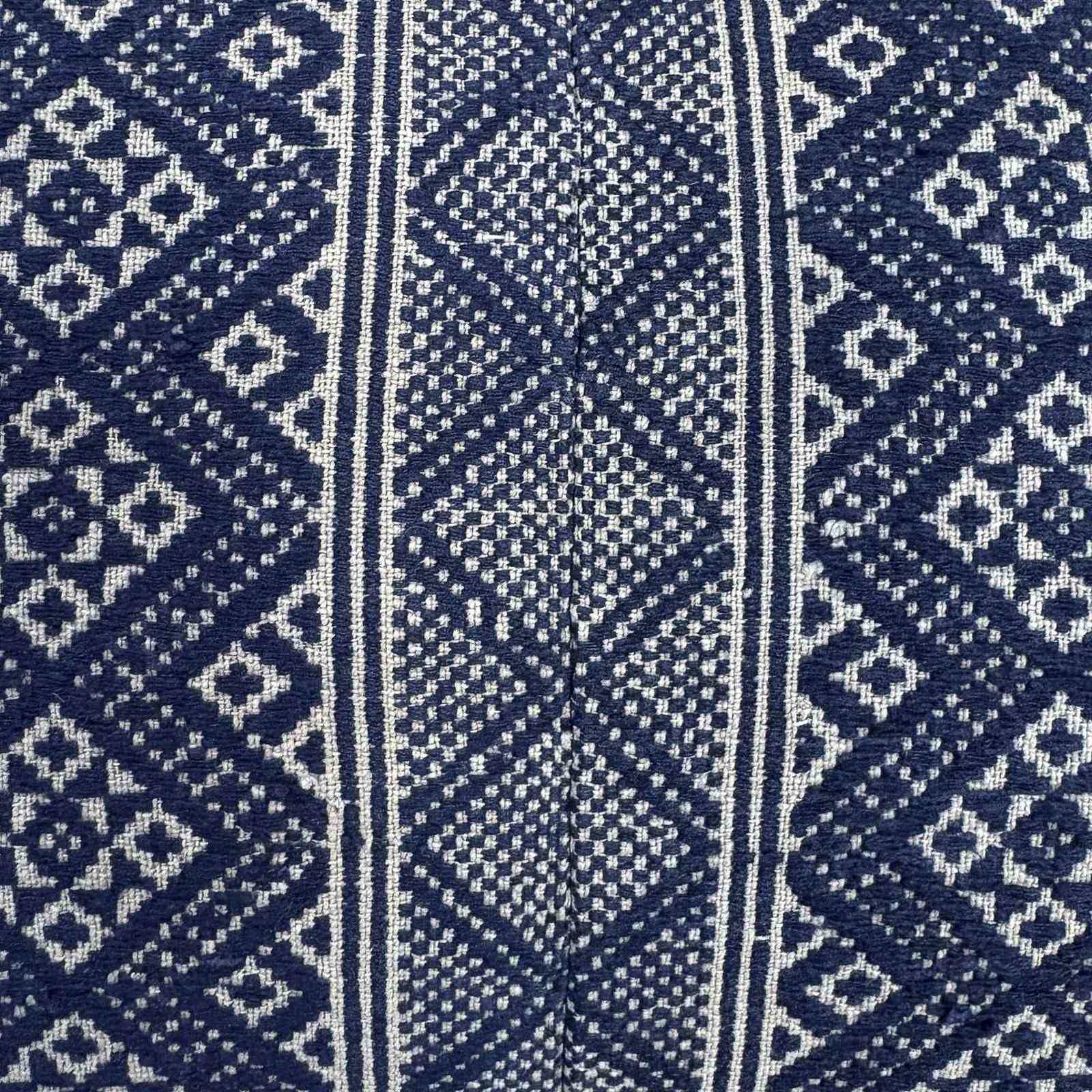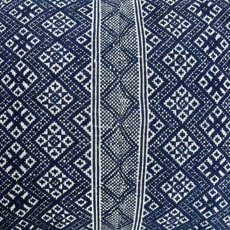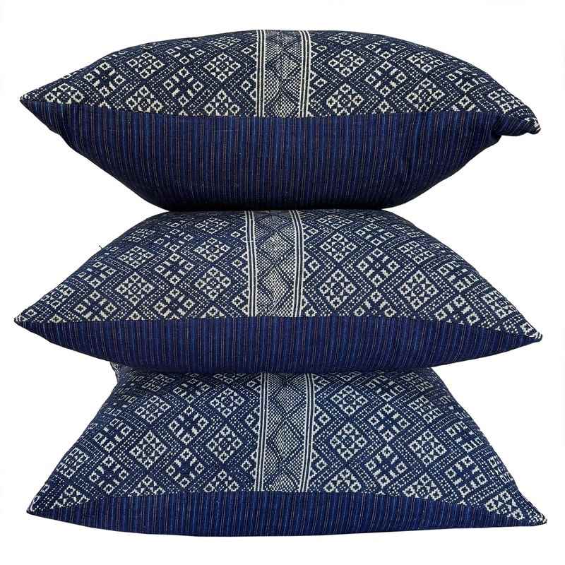 These cushions are made from a vintage Dong wedding blanket. The blanket was handwoven on a narrow loom, about 11" wide. Two pieces have therefore been joined together to get a wider cushion. The ocolour is a dark indigo with a grey cotton ground. I've backed the cushions with a vintage indigo striped textile from Shanghai, which works beautifully. There are invisible zip fasteners and feather pads.