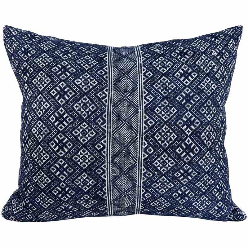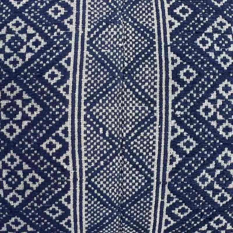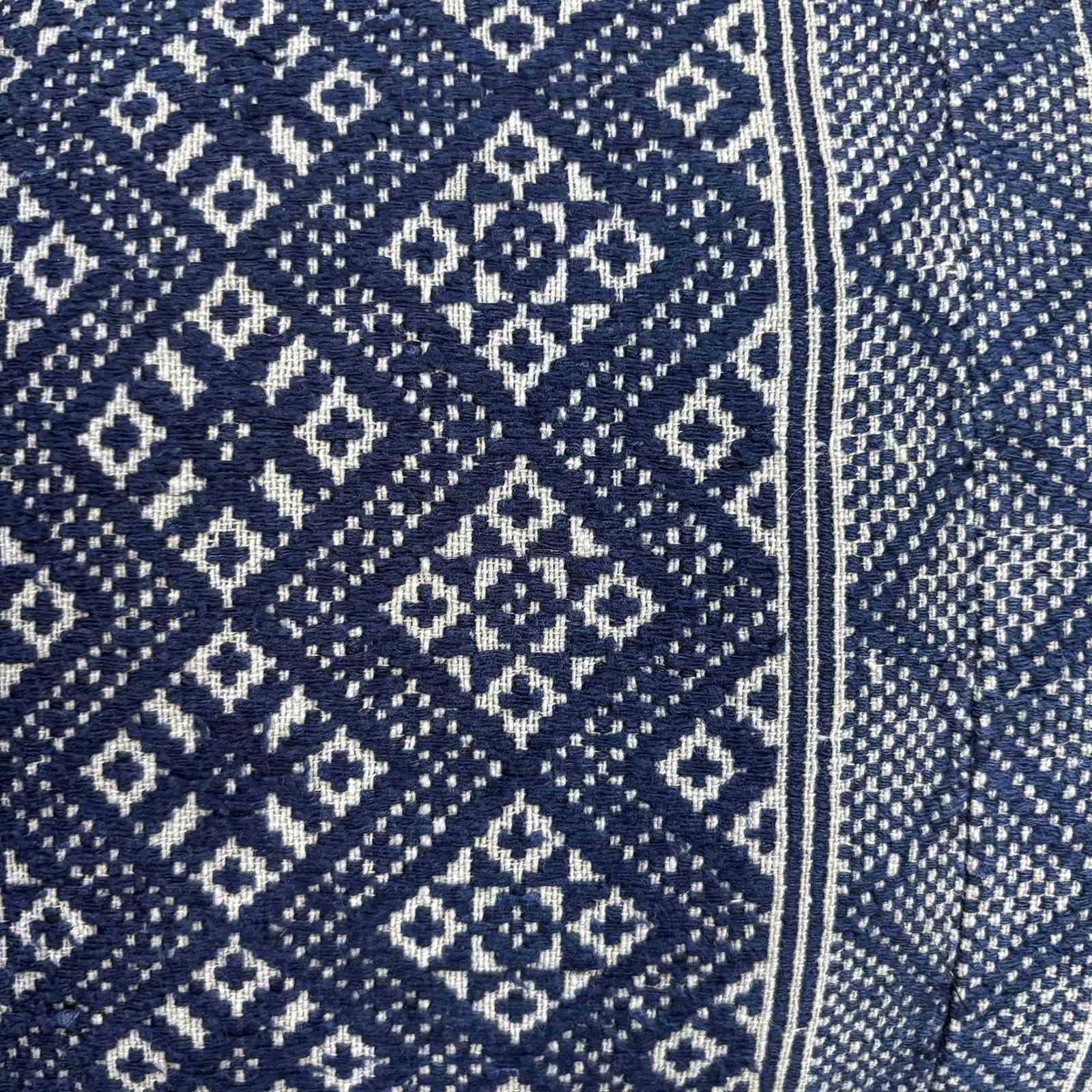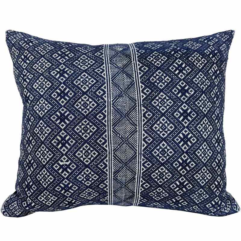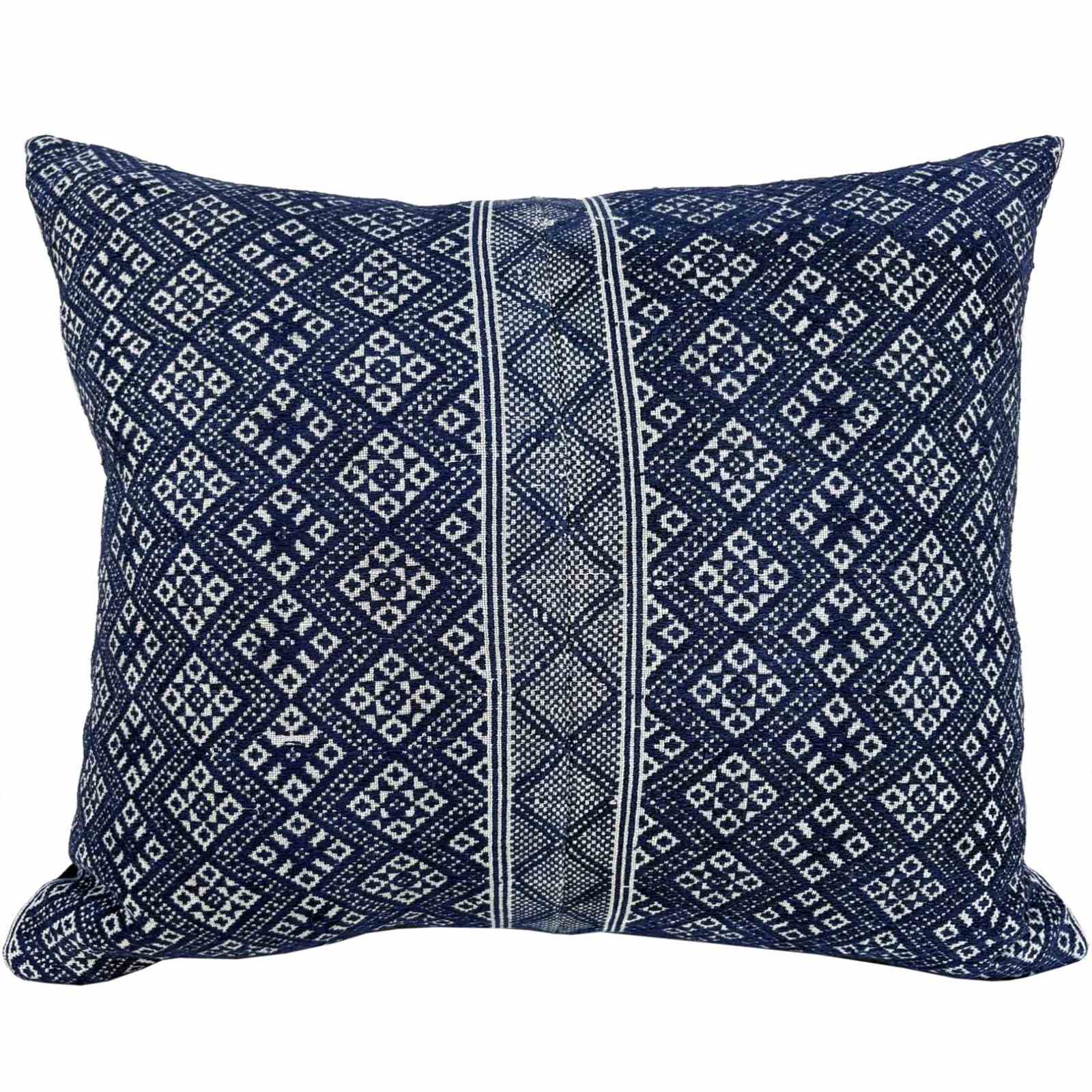 These cushions are made from a vintage Dong wedding blanket. The blanket was handwoven on a narrow loom, about 11" wide. Two pieces have therefore been joined together to get a wider cushion. The ocolour is a dark indigo with a grey cotton ground. I've backed the cushions with a vintage indigo striped textile from Shanghai, which works beautifully. There are invisible zip fasteners and feather pads.