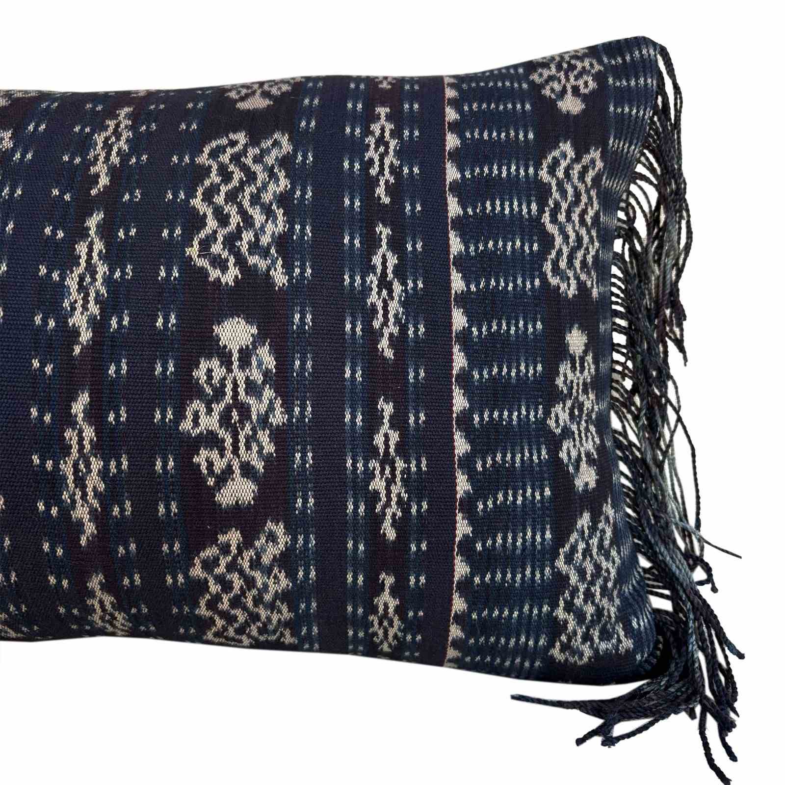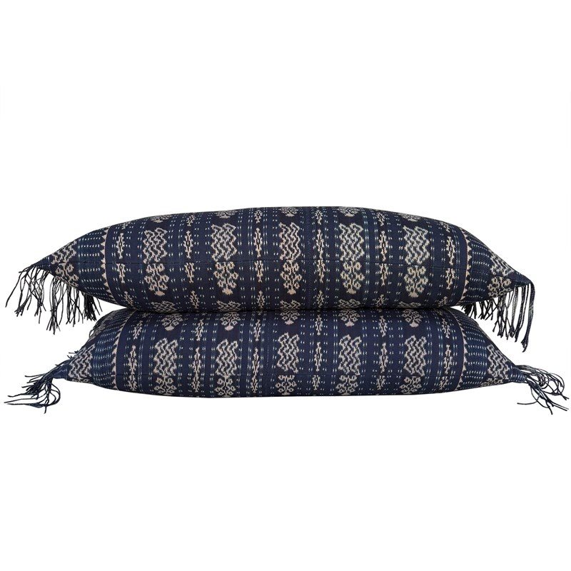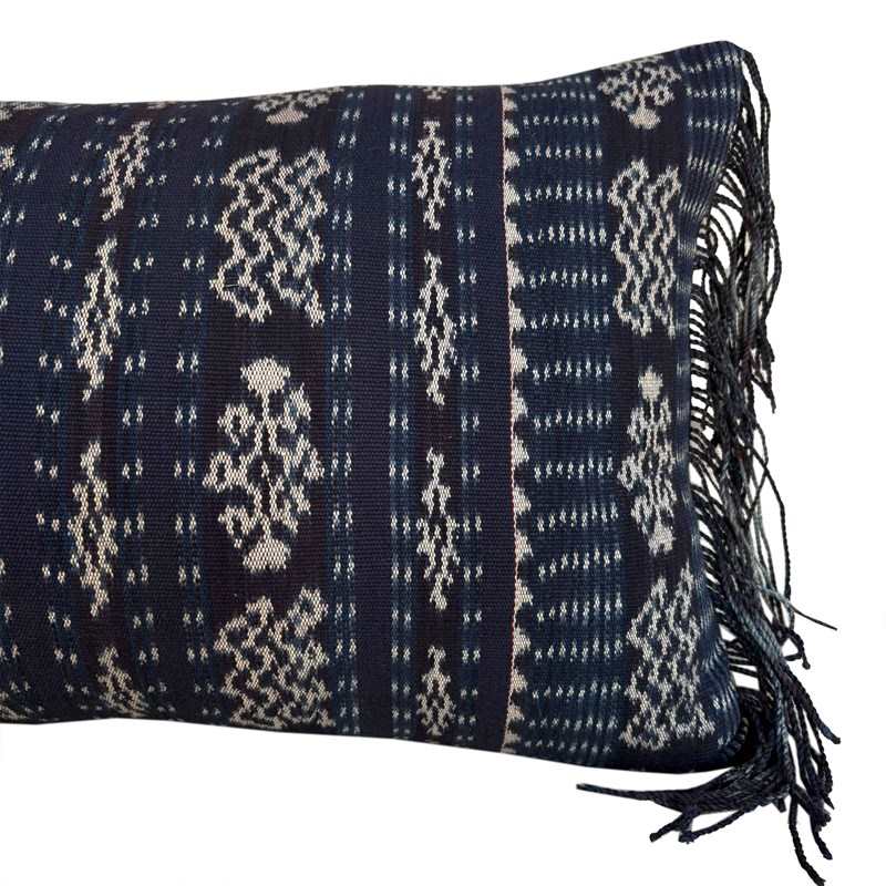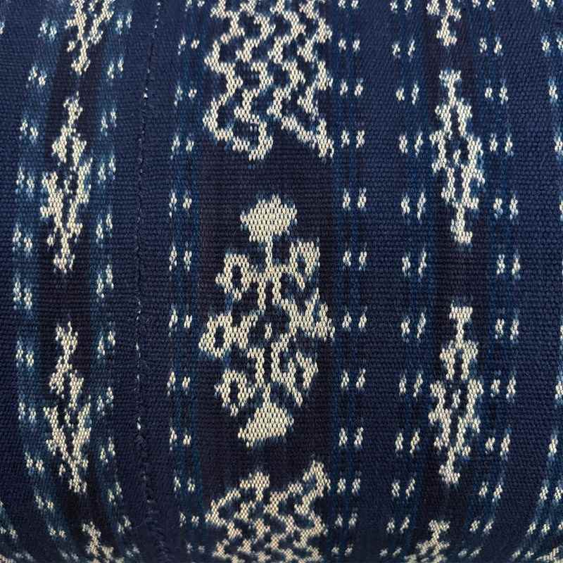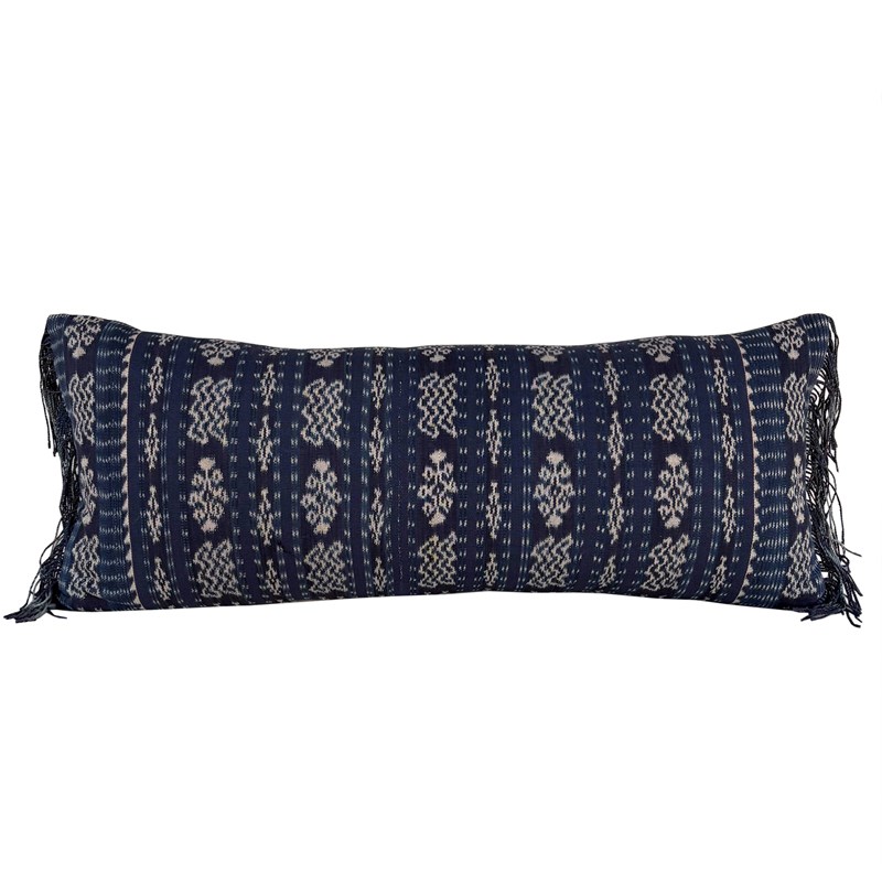 These long cushions are made from a thick hand loomed cotton shawl from Savu, Indonesia. The shawl is an ikat weave and the colours are different tones of indigo. I've used the fringed ends of the shawl for the ends of the cushions. There are invisible zips and deluxe feather inserts.