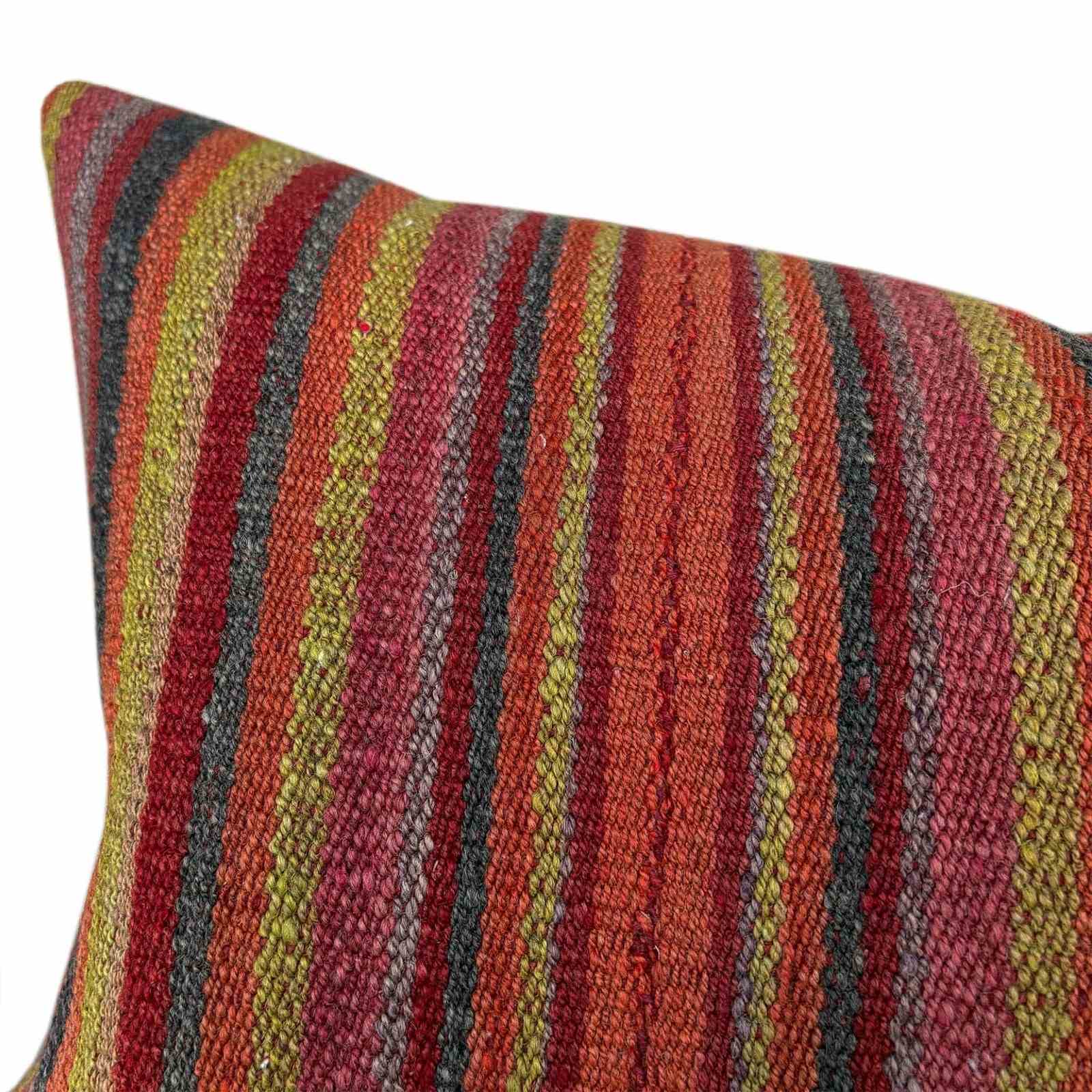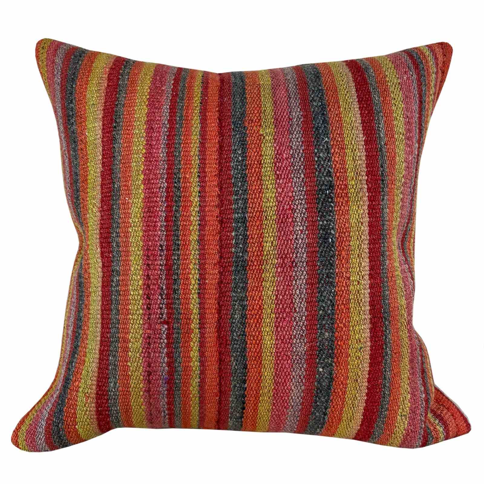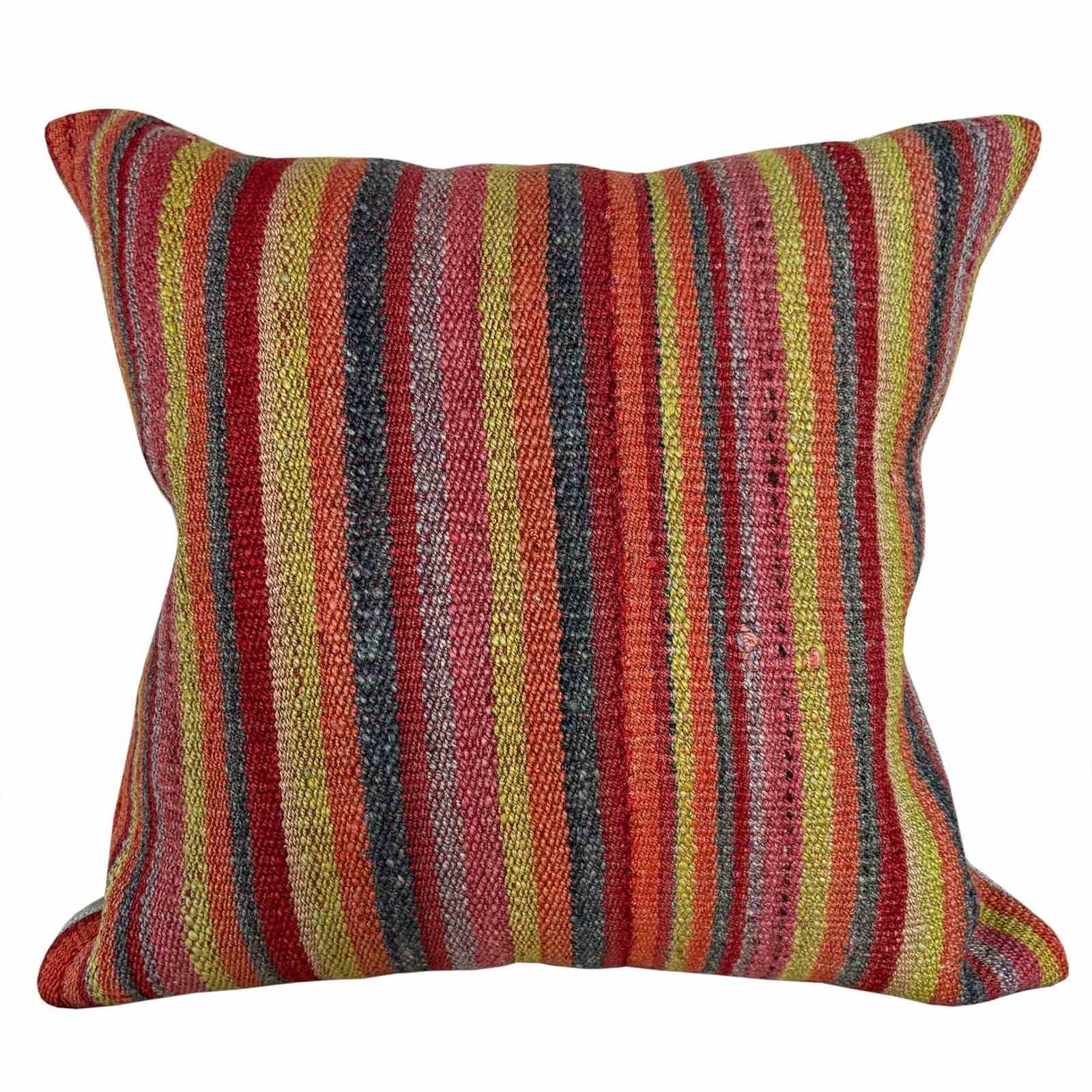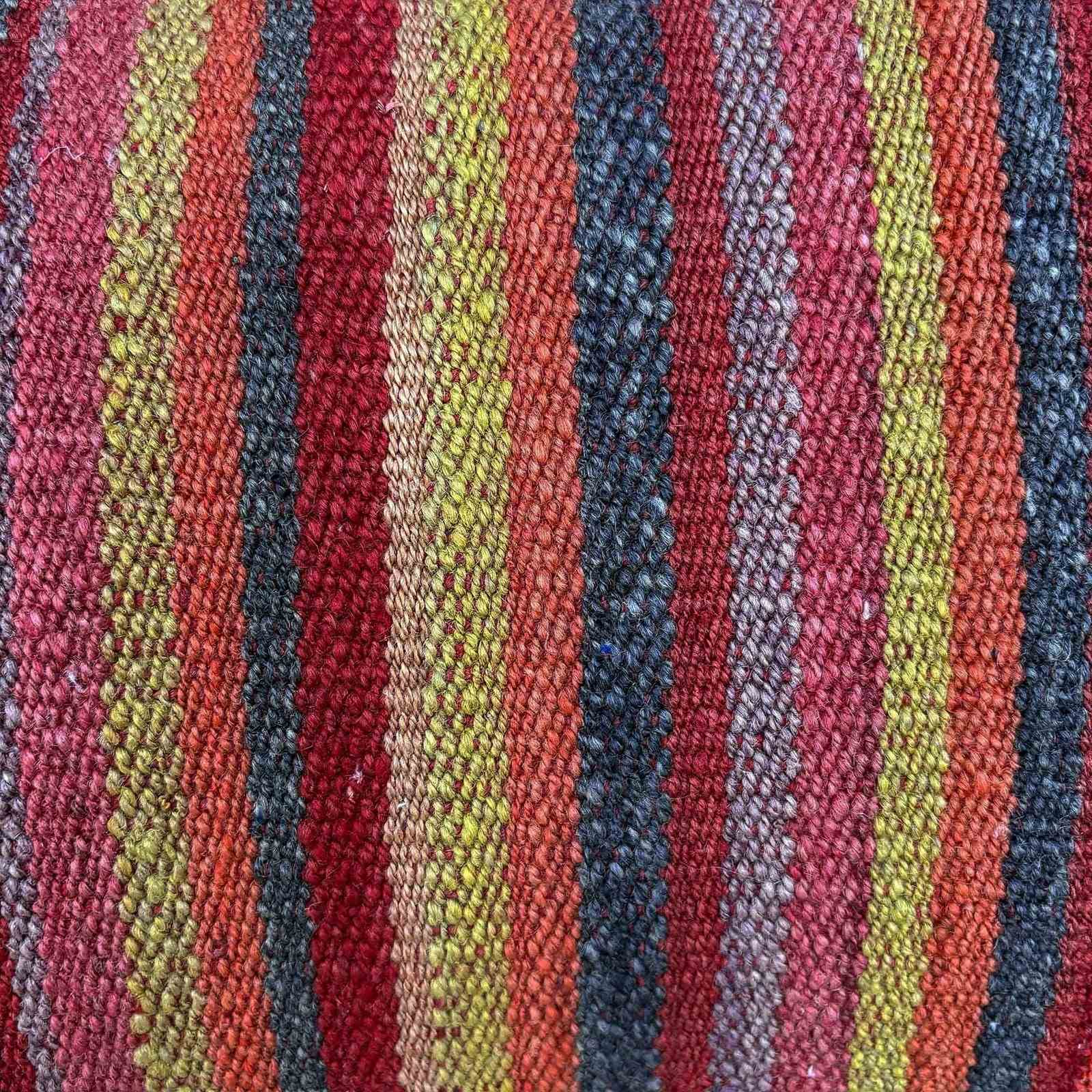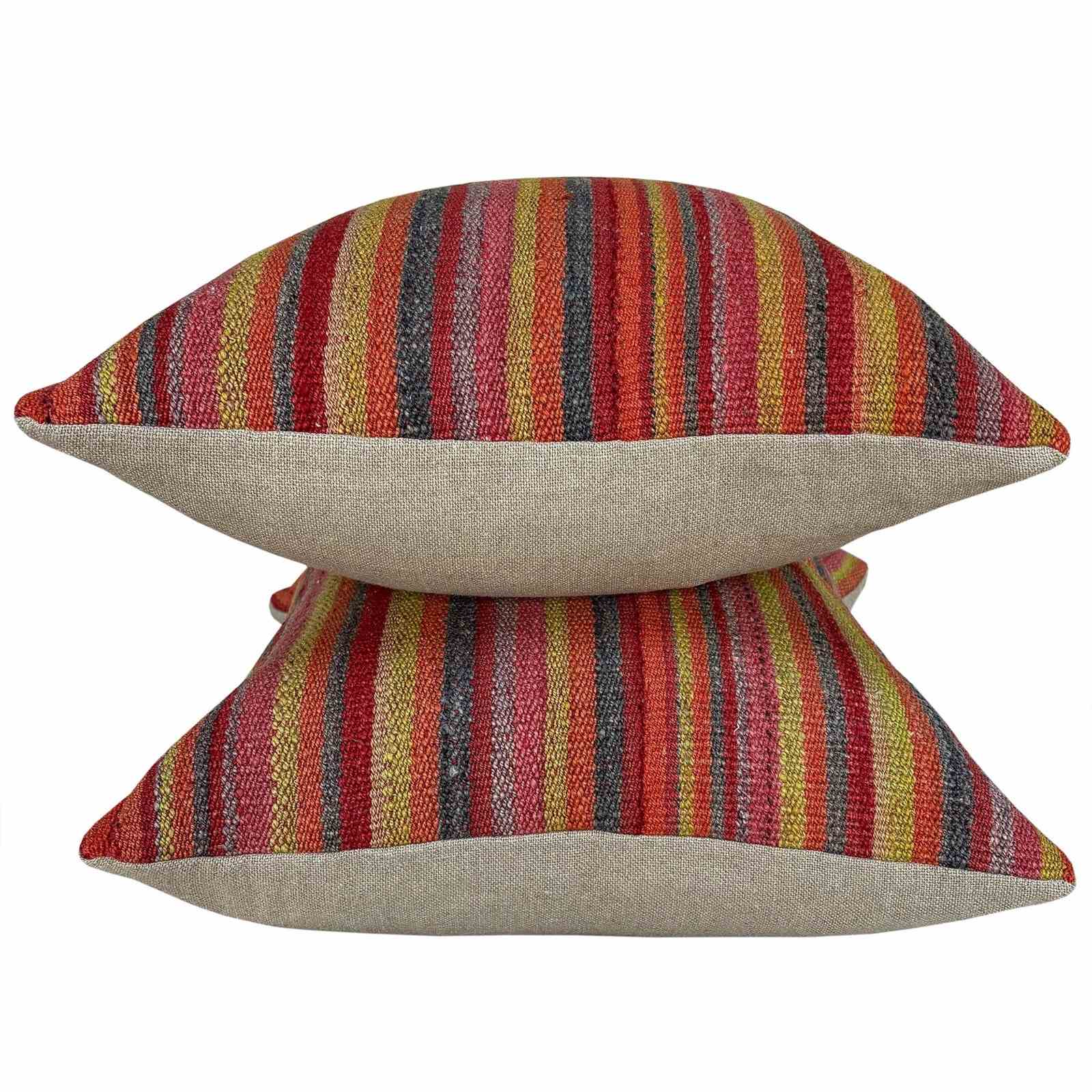 These cushions are made from a vintage Kermanshah jajim from west Persia. Jajims have a wonderful drape and were traditionally used in nomadic households to cover or store belongings. They were hand loomed on narrow looms and the panels sewn together to make a larger textile. This jajim is woven from coarse wool with a really lovely palette of natural colours and makes beautiful and robust cushions. The colours are various tones of pink and orange with an amazing citrine yellow. I've backed the cushions with a heavy natural coloured linen and there are zip fasteners and deluxe feather pads.