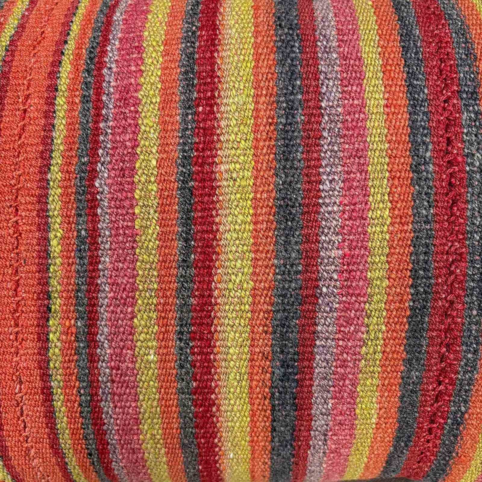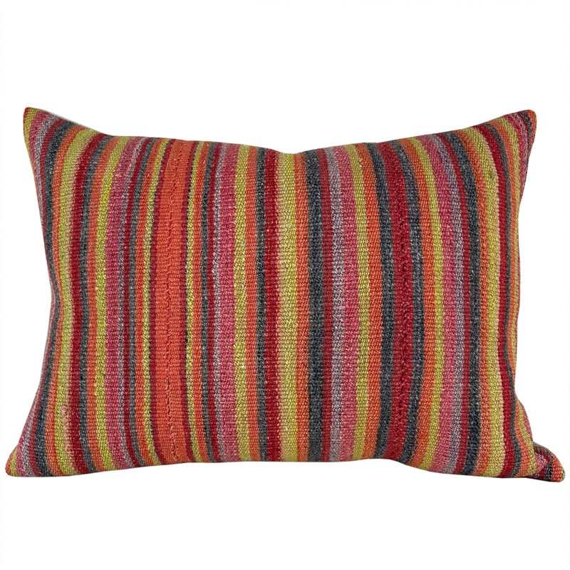 These cushions are made from a vintage Kermanshah jajim from west Persia. Jajims have a wonderful drape and were traditionally used in nomadic households to cover or store belongings. They were hand loomed on narrow looms and the panels sewn together to make a larger textile. This jajim is woven from coarse wool with a really lovely palette of natural colours and makes beautiful and robust cushions. The colours are various tones of pink and orange with an amazing citrine yellow. I've backed the cushions with a heavy natural coloured linen and there are zip fasteners and deluxe feather pads.
