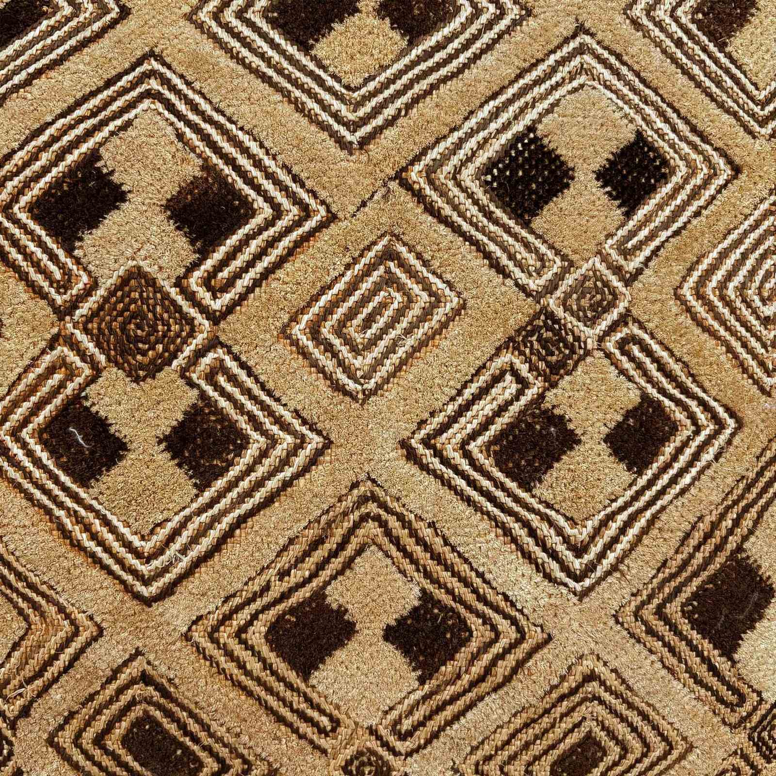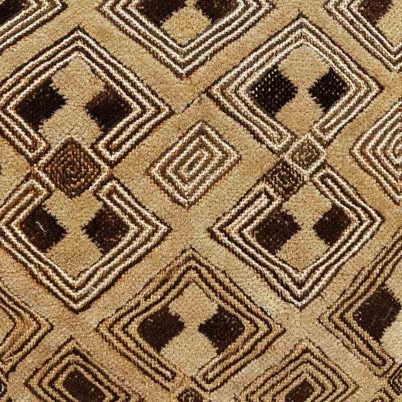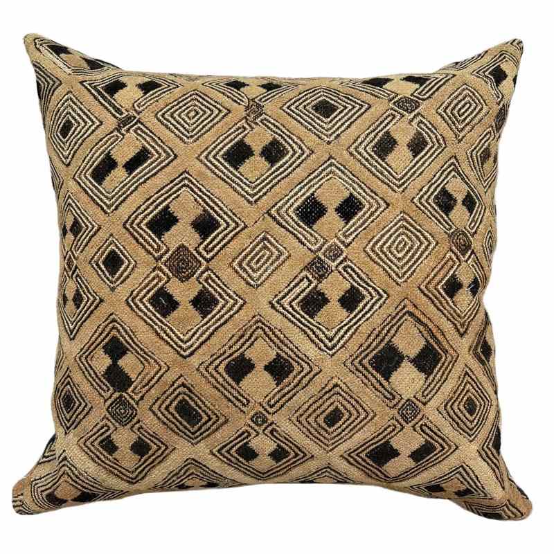 This cushion is made from a vintage Kuba cloth. Kuba cloth is made by the Kuba (Shoowa) people from the Democratic Republic of Congo. Kuba cloth is handwoven using the strands from raffia palm leaves. The raffia strands are dyed in a variety of earth tones using vegetable dyes. There are 2 finishes, either a flat weave finish or a cut pile (faux velvet). This graphic cushion is a flat weave. It is backed with a heavy slate brown linen and has a zip fastener and feather pad.