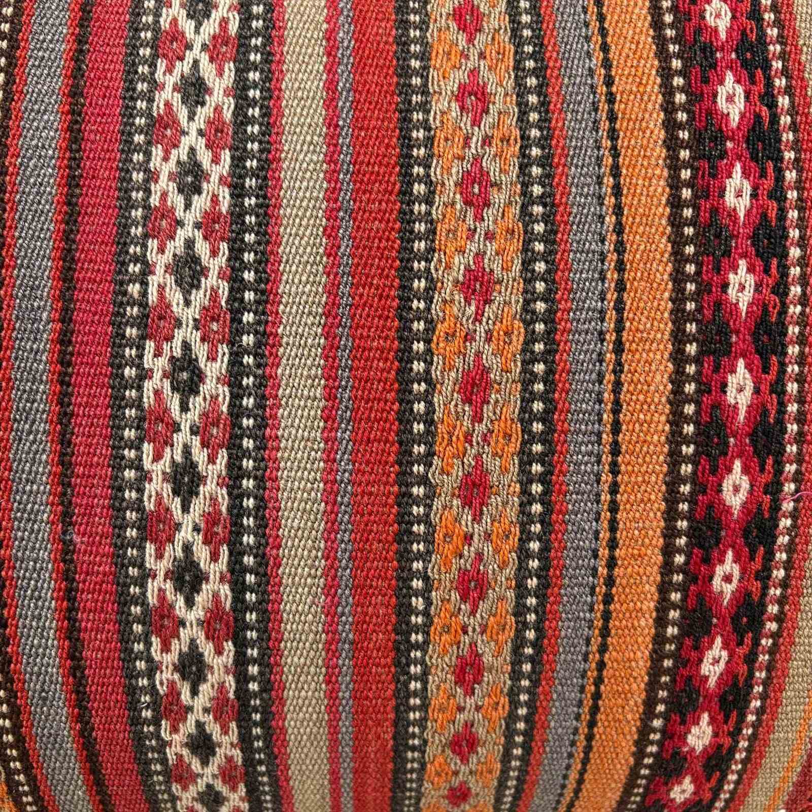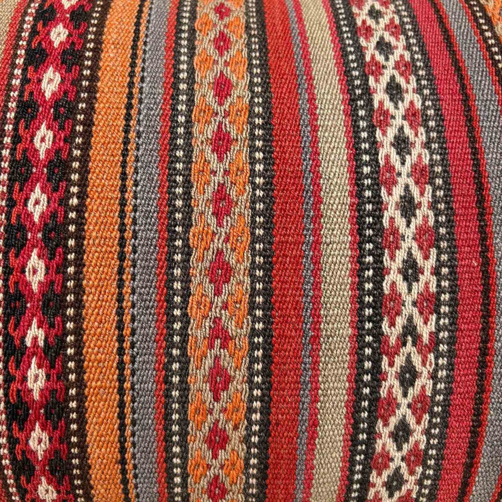 These gorgeous big cushions are made from a vintage Persian jajim from the Loshan area of Iran. The textile is hand loomed in coarse wool that has been coloured with natural dues. The weave is really pretty with decorative floating weft stitches and would have been done by a very skilled weaver. I've backed the cushions with a heavy linen in a natural colour and there are zip fasteners and deluxe feather inserts.