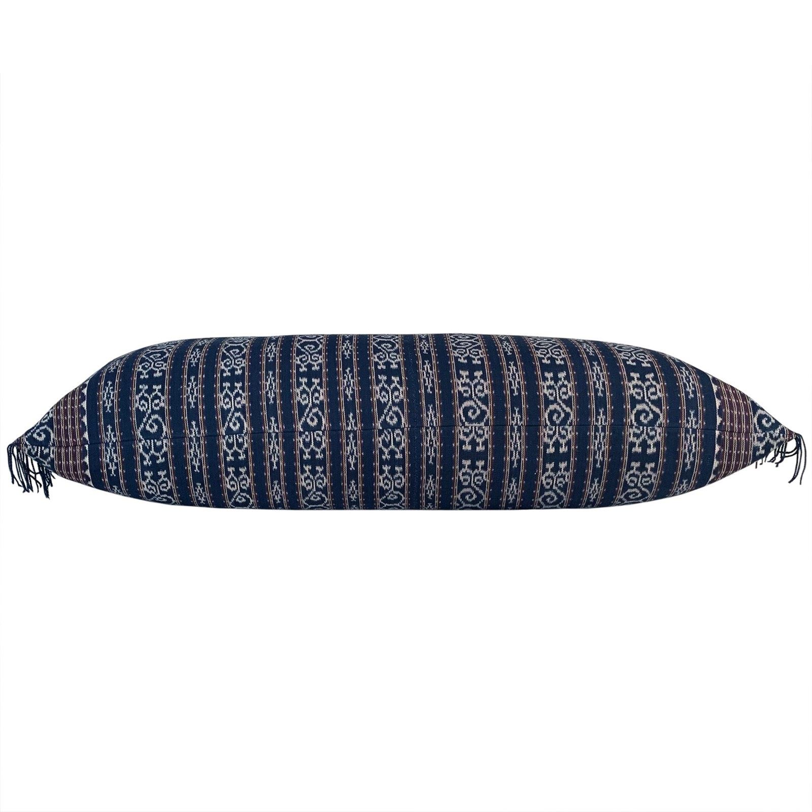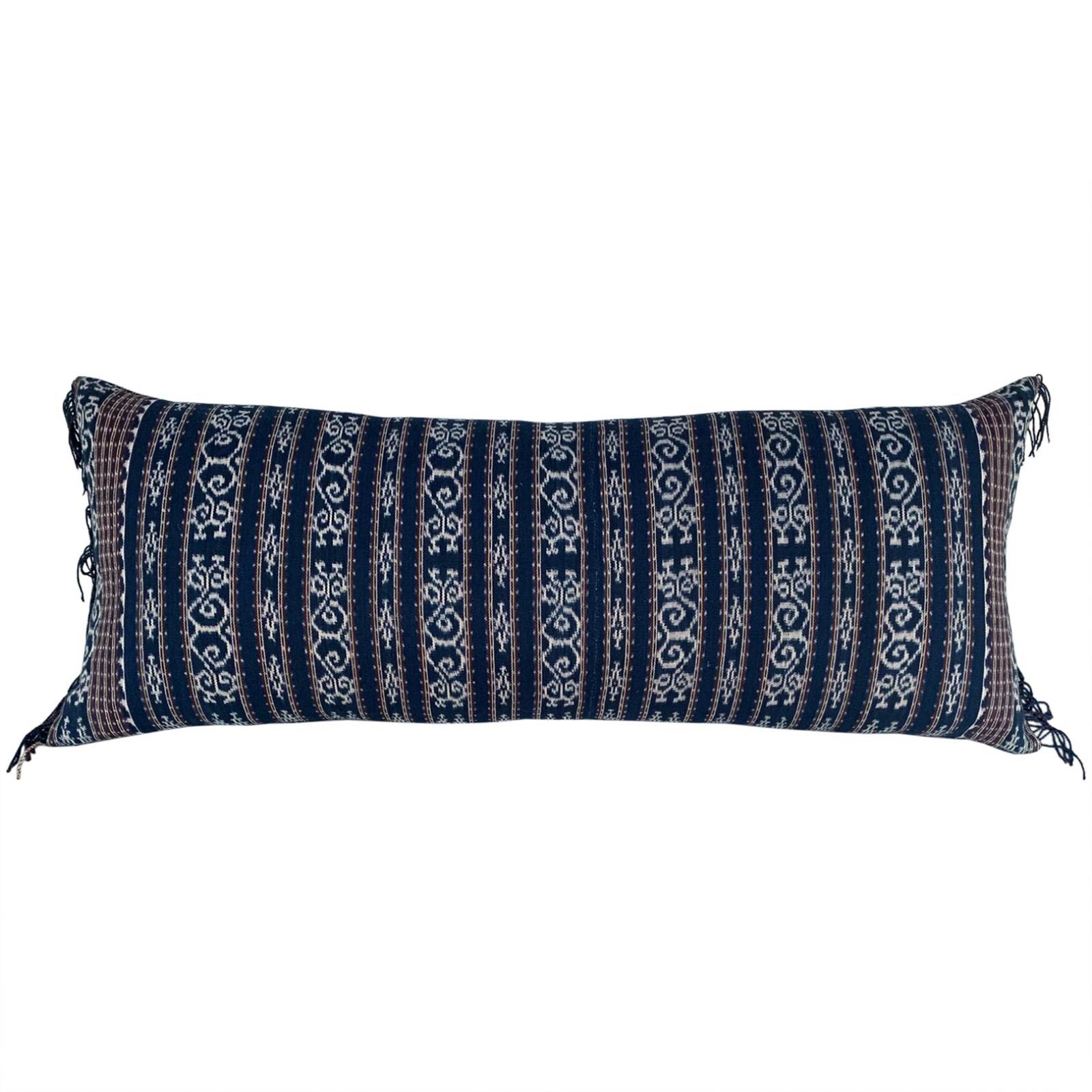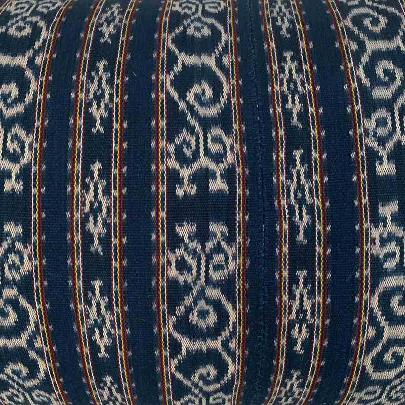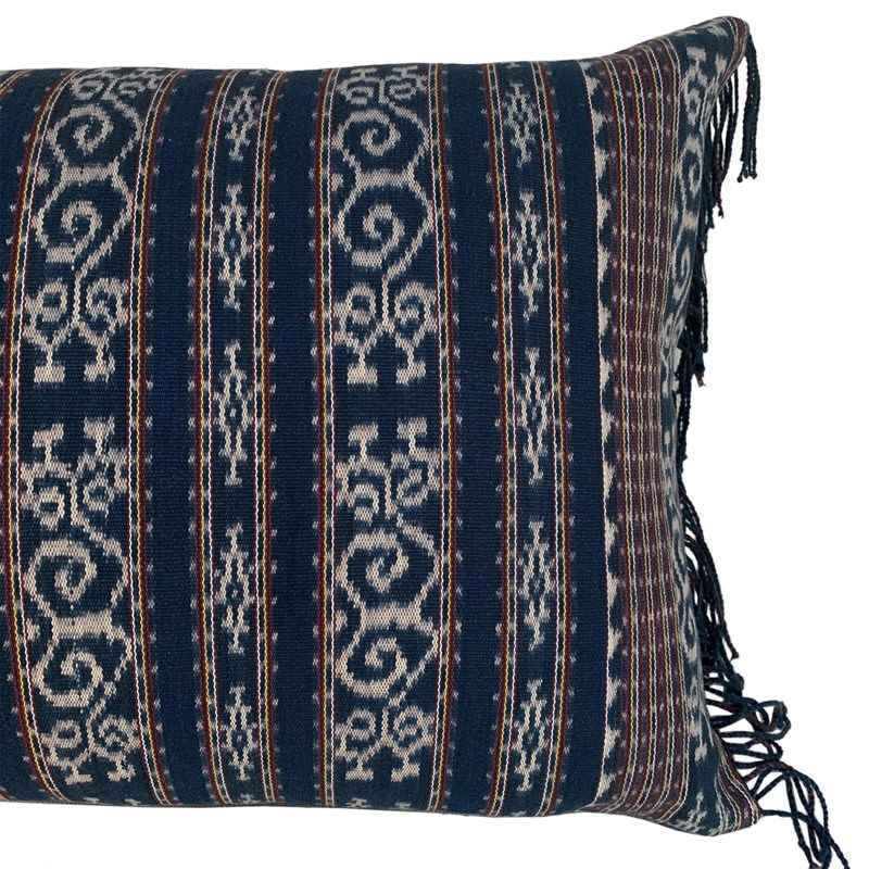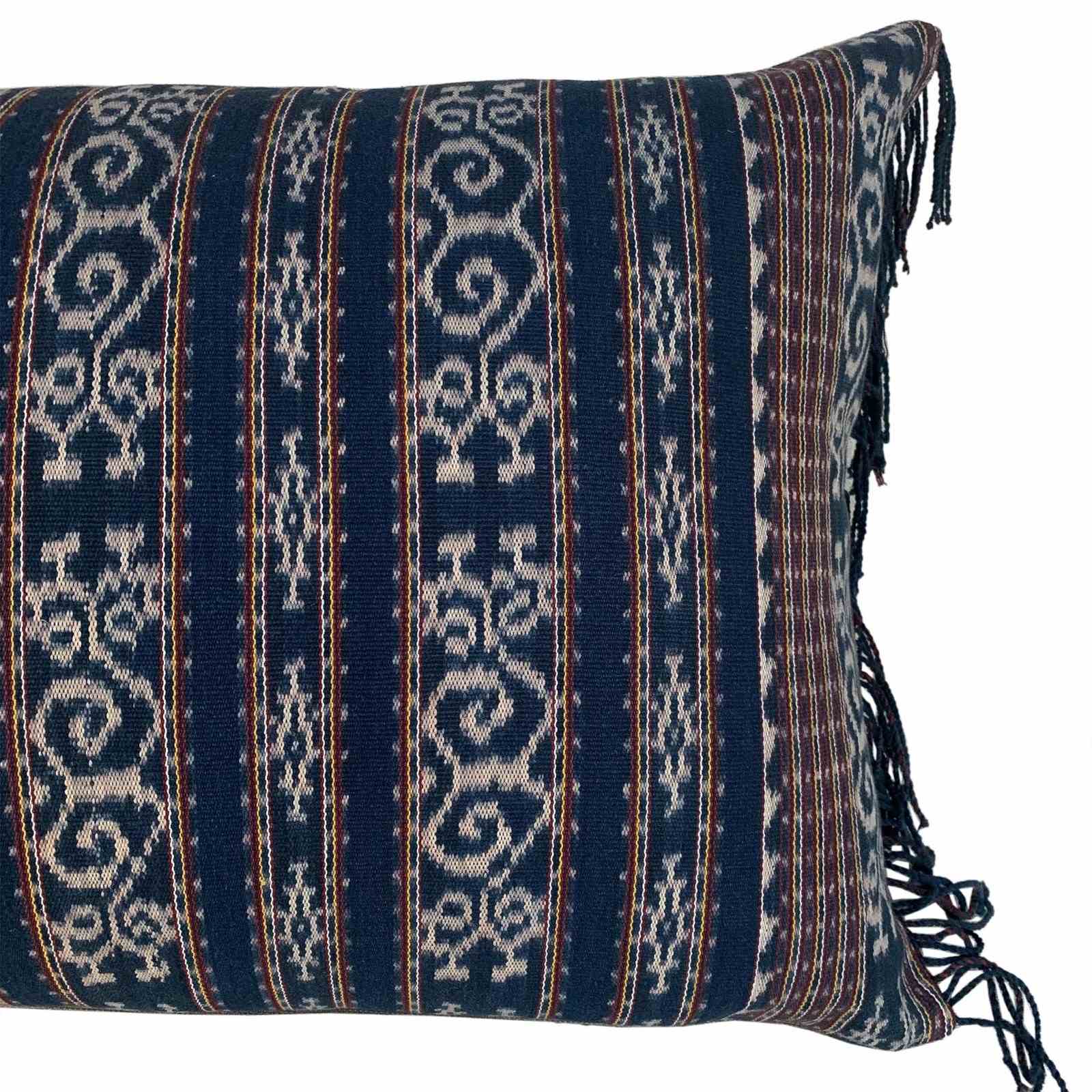 These magnificent and huge cushions are made from a hand loomed ikat shawl from Savu, Indonesia. The shawl is woven in thick cotton yarn that is coloured with natural dye. The predominant colour being a lovely deep indigo. I've used the fringed ends of the shawl to make decorative ends on the cushions. There are invisible zips and deluxe feather pads. These cushions would be stunning on large beds or low backed sofas.