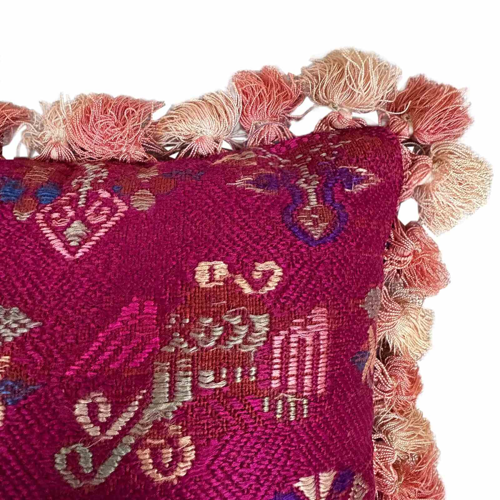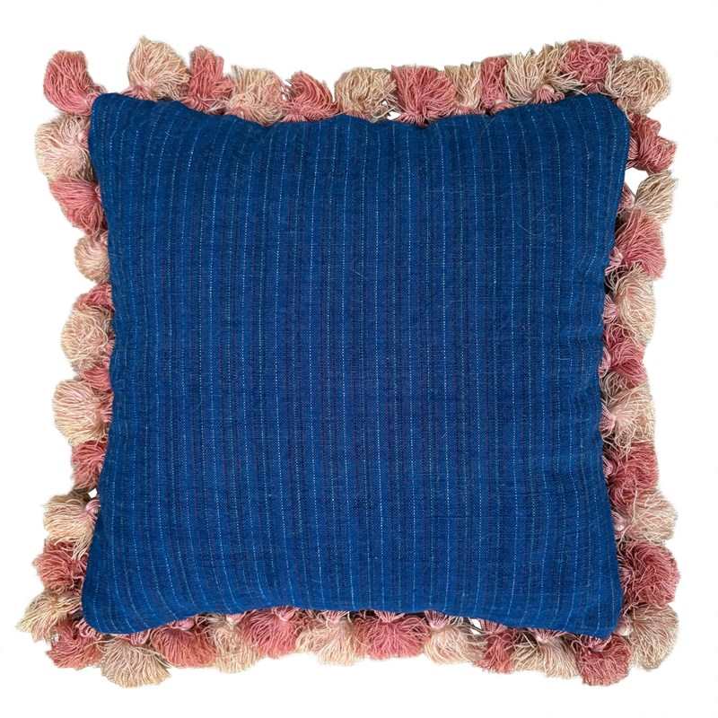 This sumptuous little pillow is made from a fragment of a Maonan hilltribe wedding blanket. The blanket was hand woven in cotton and silk, and the colours are natural. It dates to mid C20 and in some places the silk has worn to expose the terracotta coloured ground textile. The silk weaving is a supplementary weft, so any wear is superficial. I've backed the cushion with a vintage hand loomed textile, in a blue stripe. The tassels is vintage and i think works beautifully with the rich colours on the pillow. The pillow is filled with Provencal lavender selected for its long lasting scent.
