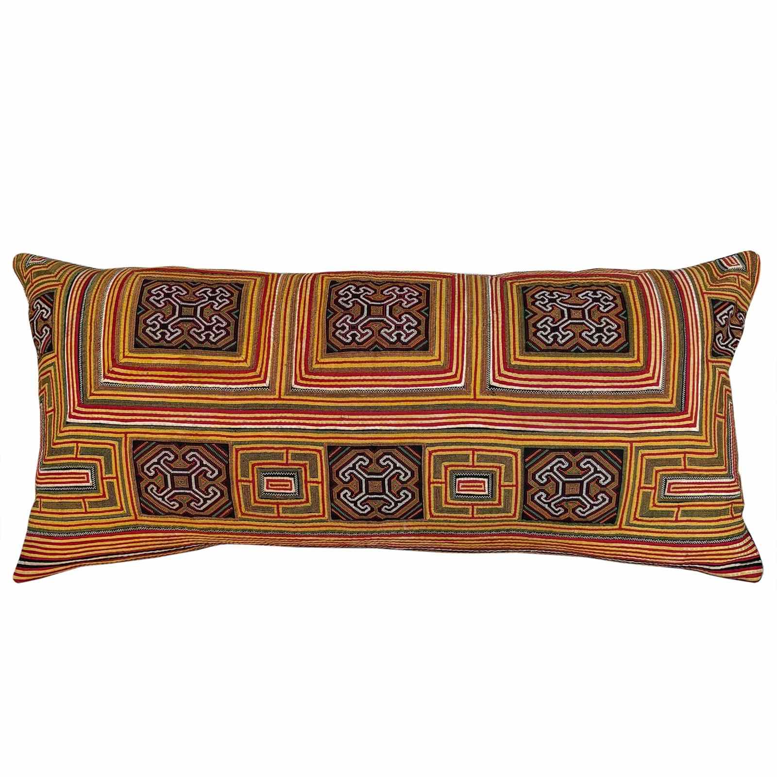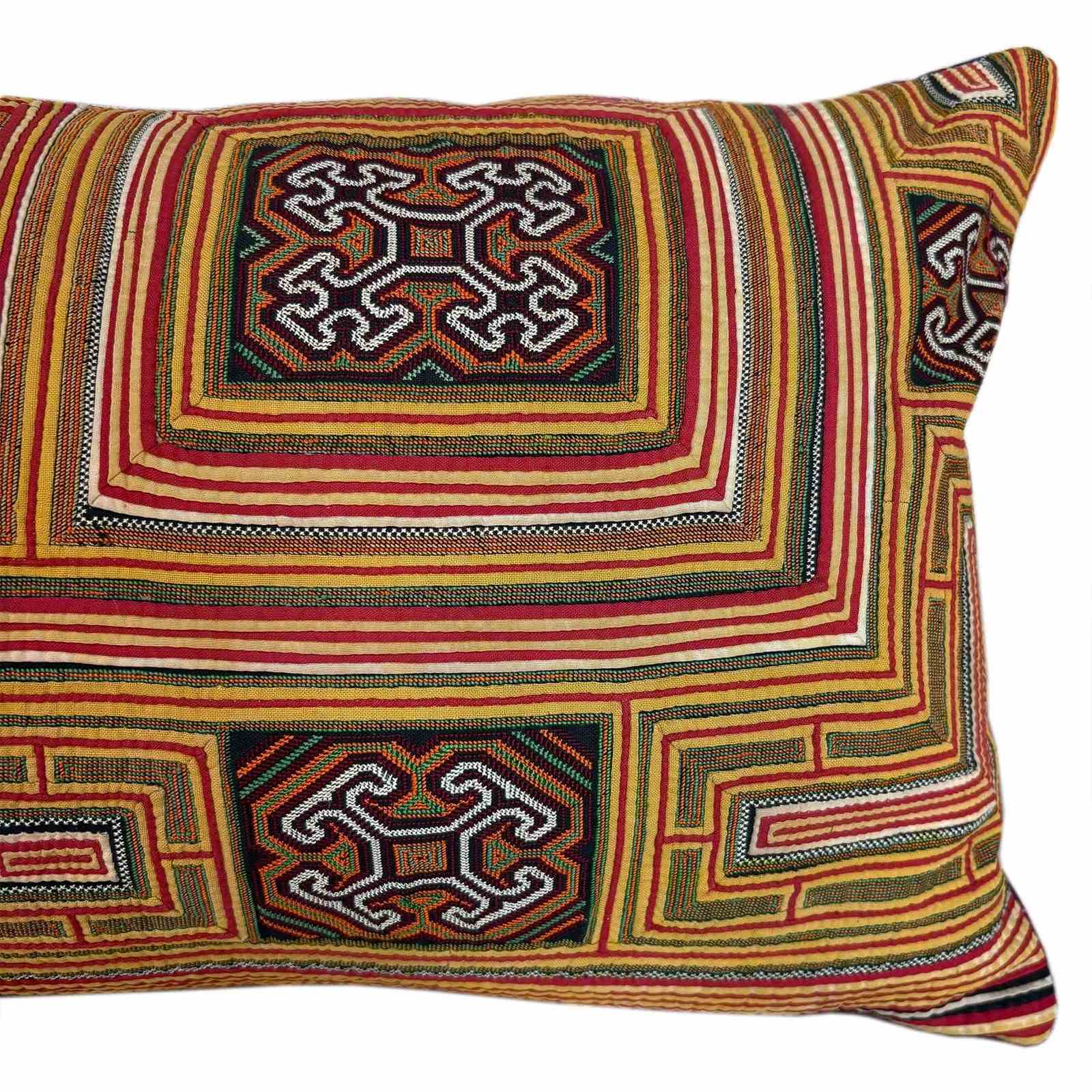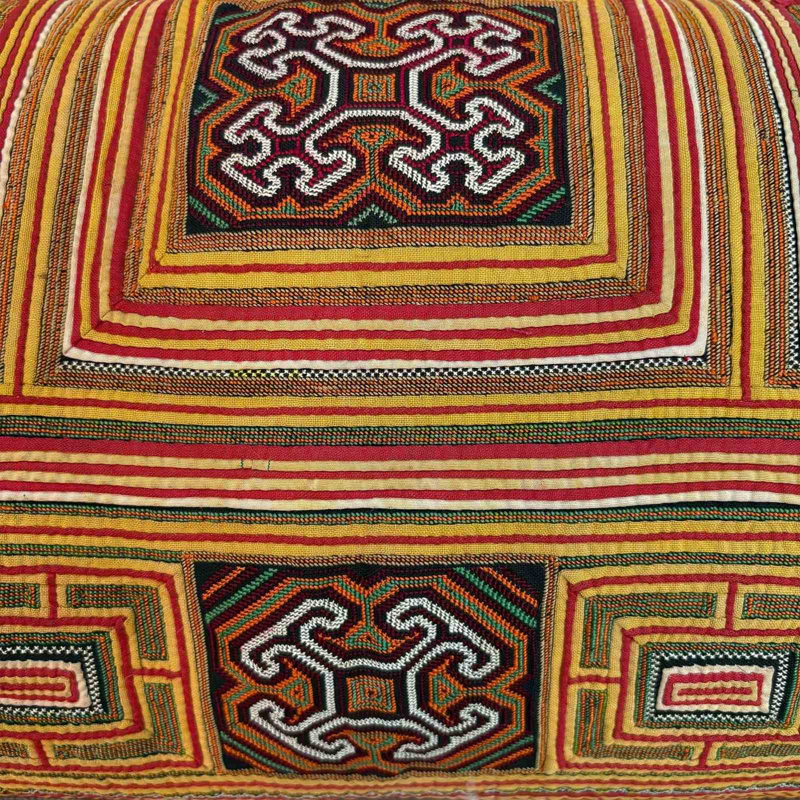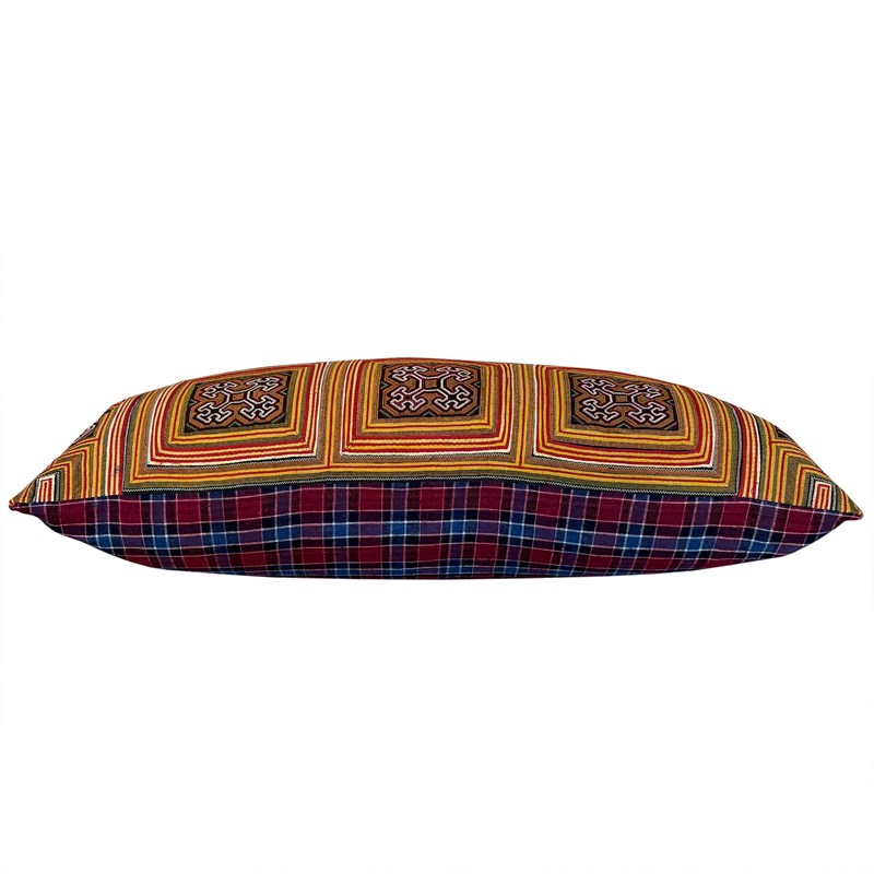 This cushion is very special. It is made from one half of a Miao festival collar and is hand stitched applique and fine embroidery. It would have taken well over a year to make. The pattern depicts a map of the 5,000 year old Capital Chisou which was the home of the Miao's ancestors. I've backed the cushion with a vintage handloomed claret and blue checked textile from the Songjiang area of Shanghai which was a reknown textile district. I think the colour works beautifully with the yellow and red of the collar. There is a zip fastener and feather pad.