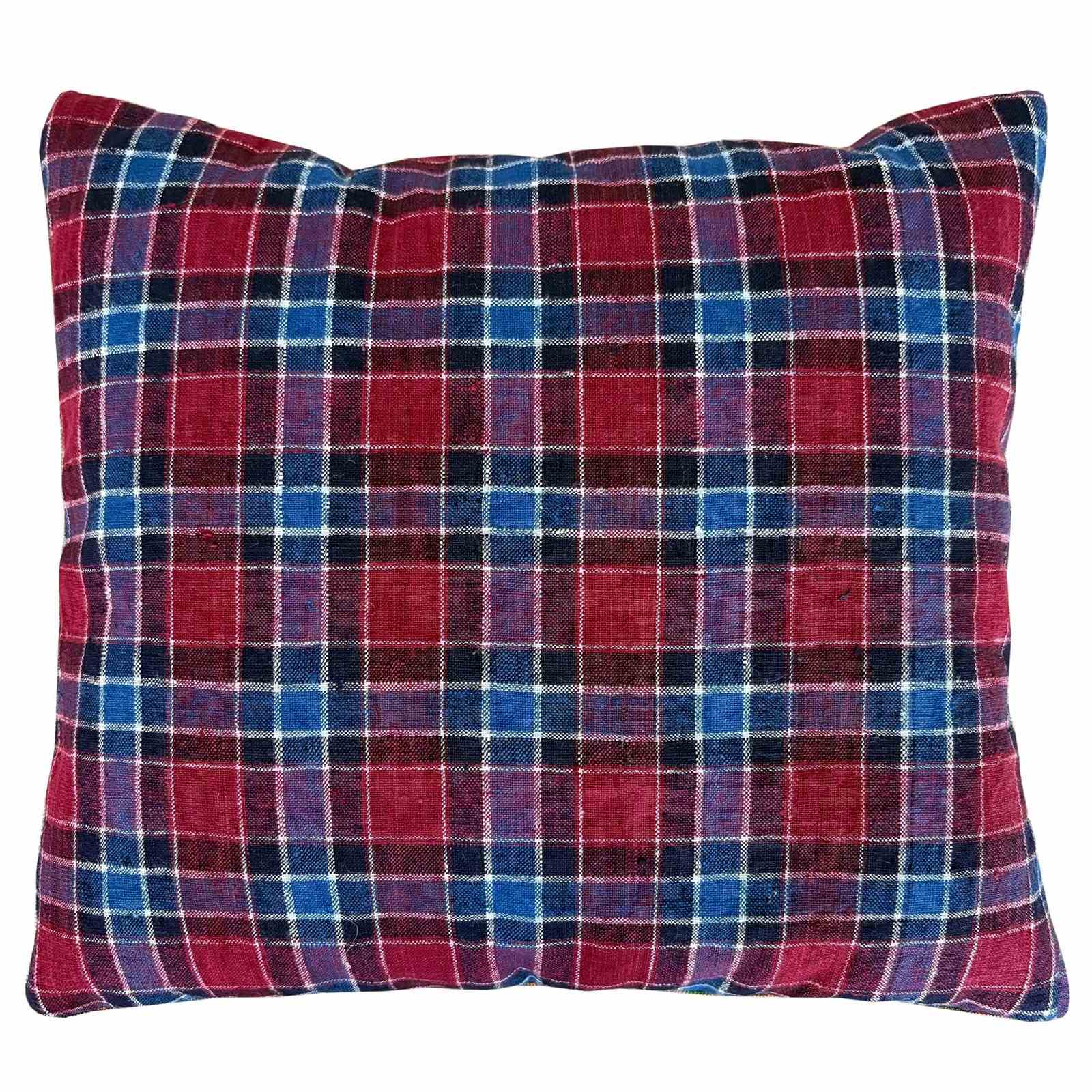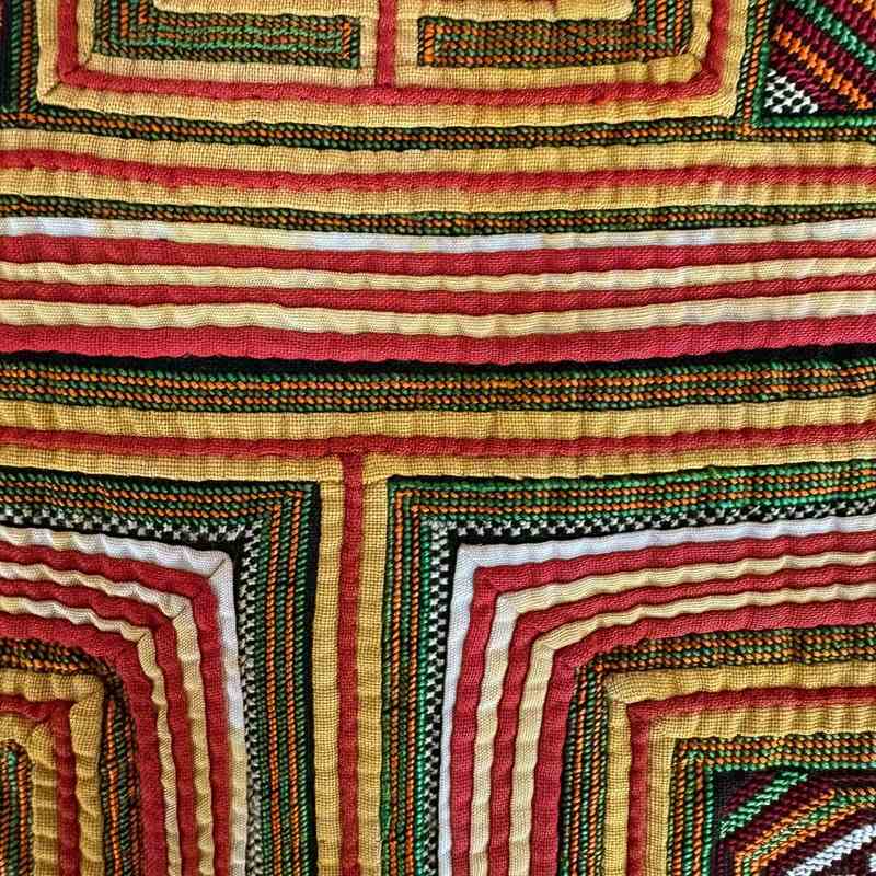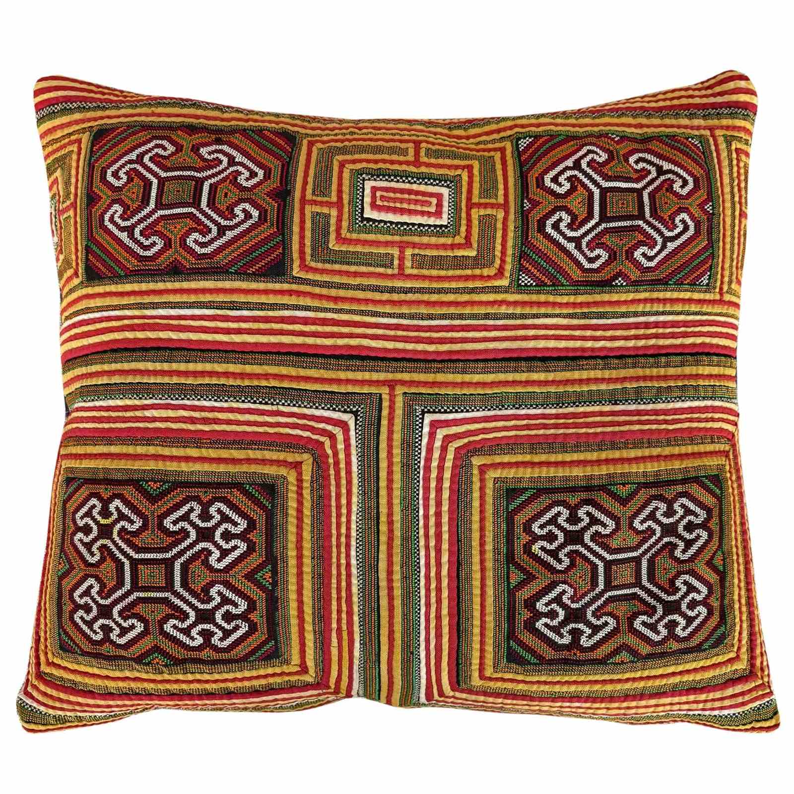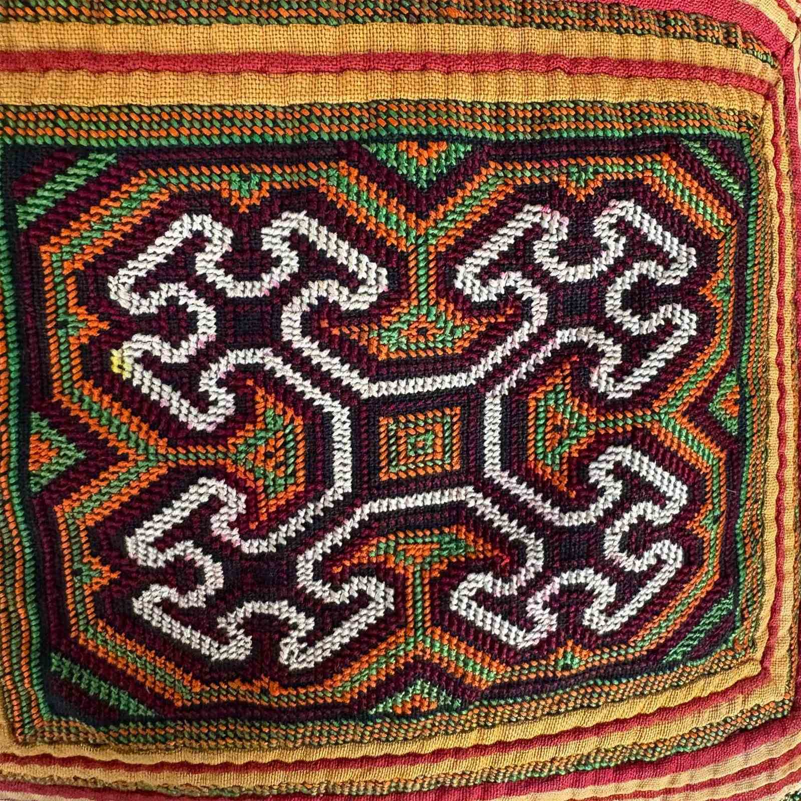 This pillow is very special. It is made from a Miao festival collar and is hand stitched applique and fine embroidery. The pattern depicts a map of the 5,000 year old Capital Chisou which was the home of the Miao's ancestors. I've backed the cushion with a vintage handloomed claret coloured textile from the Songjiang area of Shanghai which was a reknown textile district. I think the colour works beautifully with the yellow and red of the collar. The pillow is choc full of Provencal lavender selected for its long lasting scent.