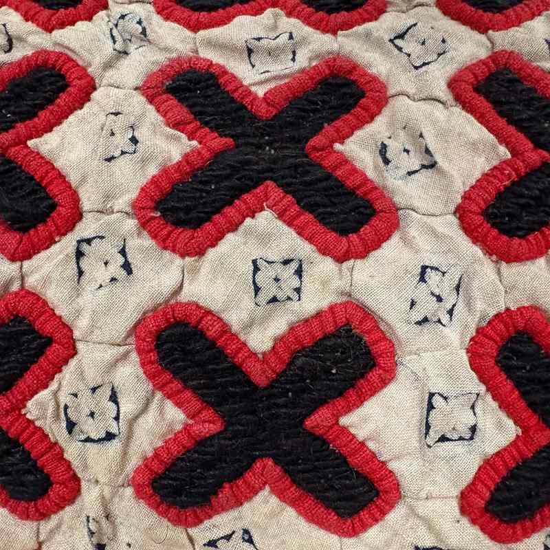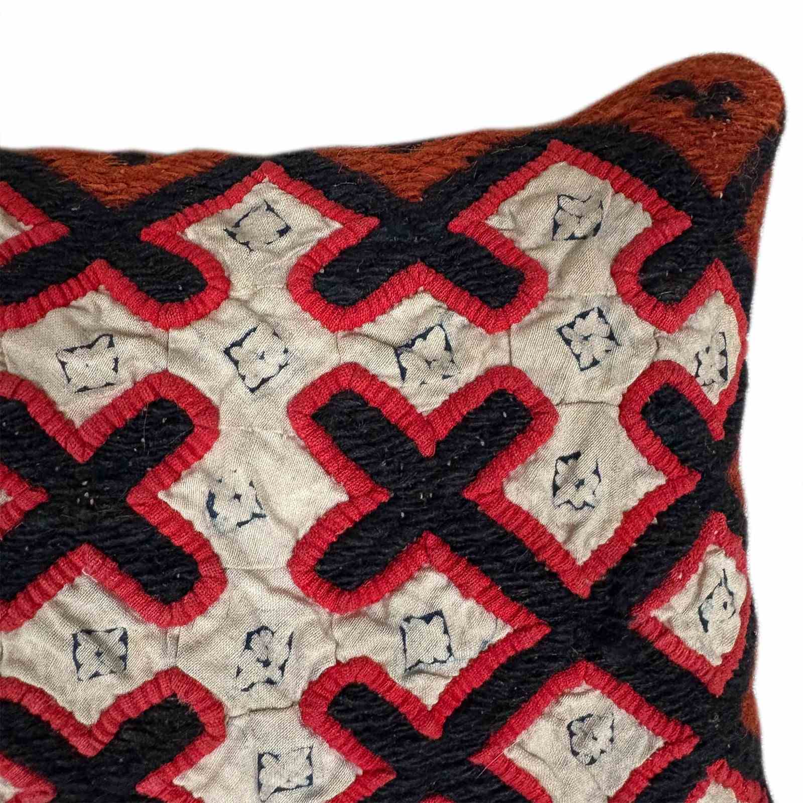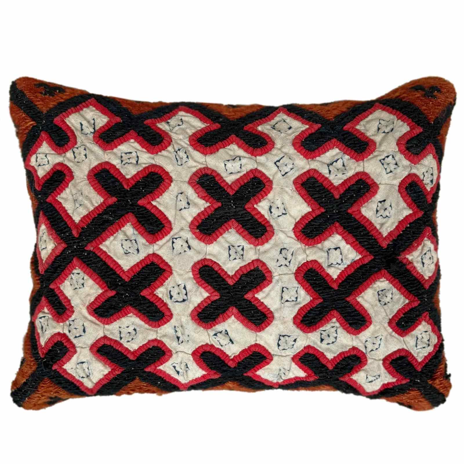This fabulous big fat lavender pillow is made from fragment of a Miao ceremonial cape from the Weining region of Guizhou Province. The materials are cotton, hemp and a coarse thick wool reflecting the areas cold temperatures. I've backed the pillow with a hand loomed, hand spun, slate black coloured cotton. It's stuffed with Provencal lavender selected for its long lasting scent.