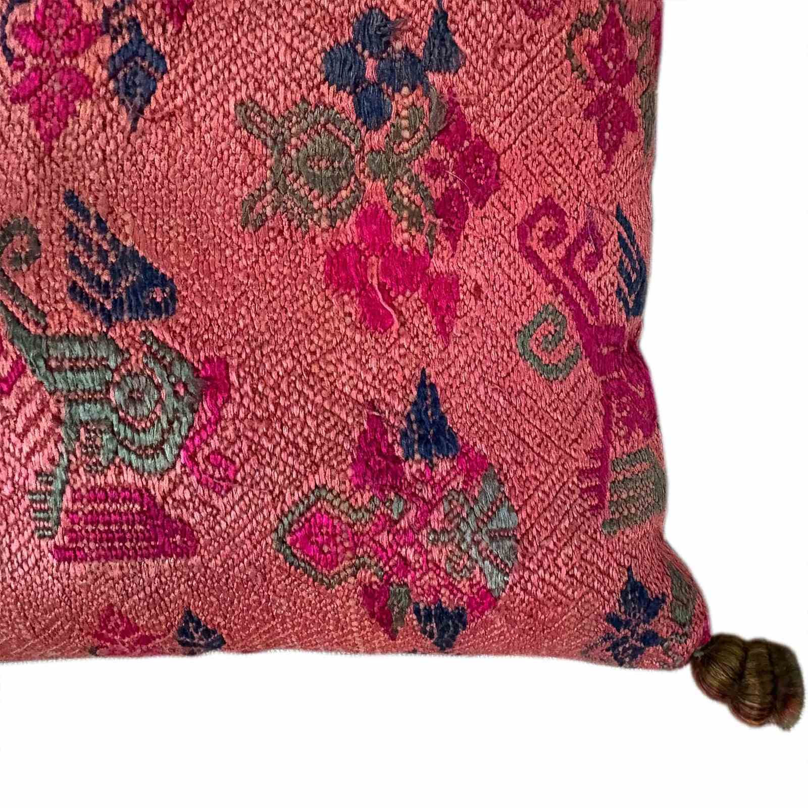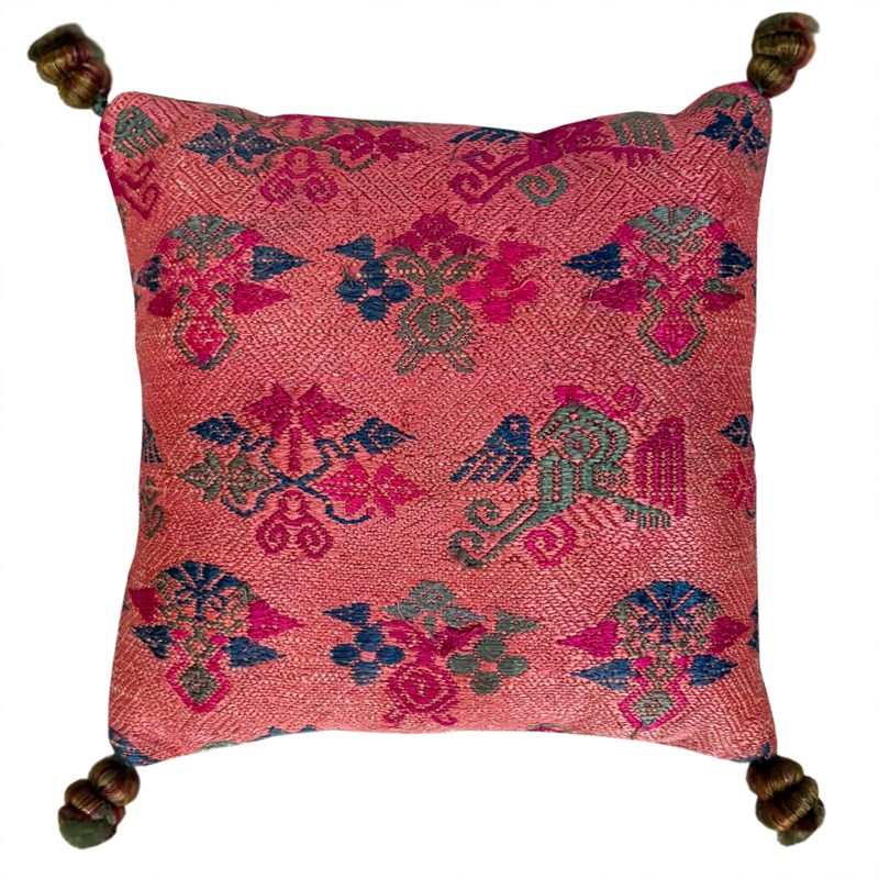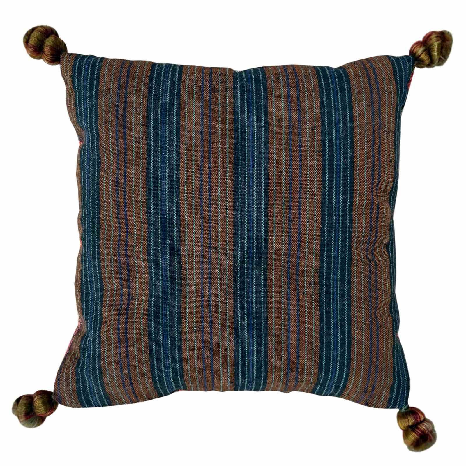 This little cushion is made from a fragment of an old Maonan silk wedding blanket. The blanket is woven in a lovely orange colour with auspicious symbols picked out in pink, green and blue. All the colours are natural. I've backed the cushion in another vintage hand loomed textile, and this is a brown and back stripe. The pillow is stuffed full of Provencal lavender selected for its long lasting scent.