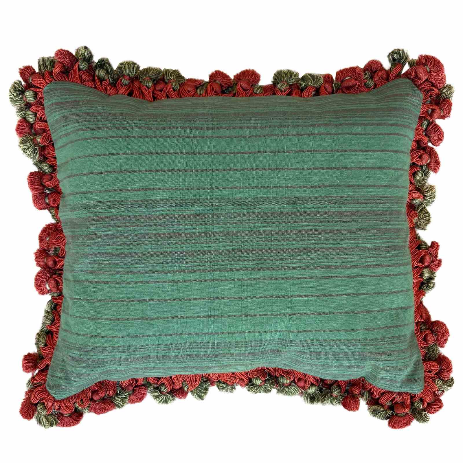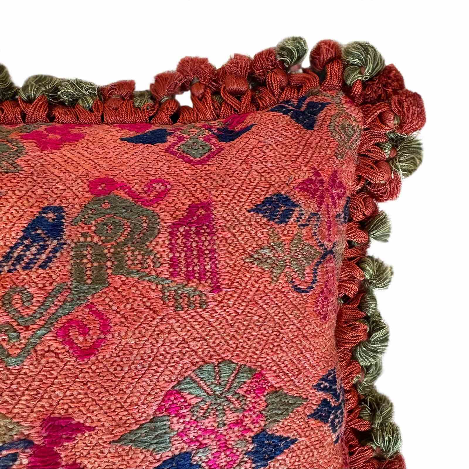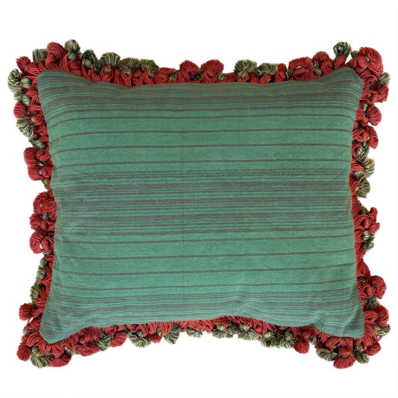This little cushion is made from a fragment of an old Maonan silk wedding blanket. The blanket is woven in a lovely orange colour with auspicious symbols picked out in pink, green and blue. All the colours are natural. I've backed the cushion in another vintage hand loomed textile, and this is a green stripe. I've edged the pillow with a pretty tassel fringe and stuffed it full of Provencal lavender selected for its long lasting scent.