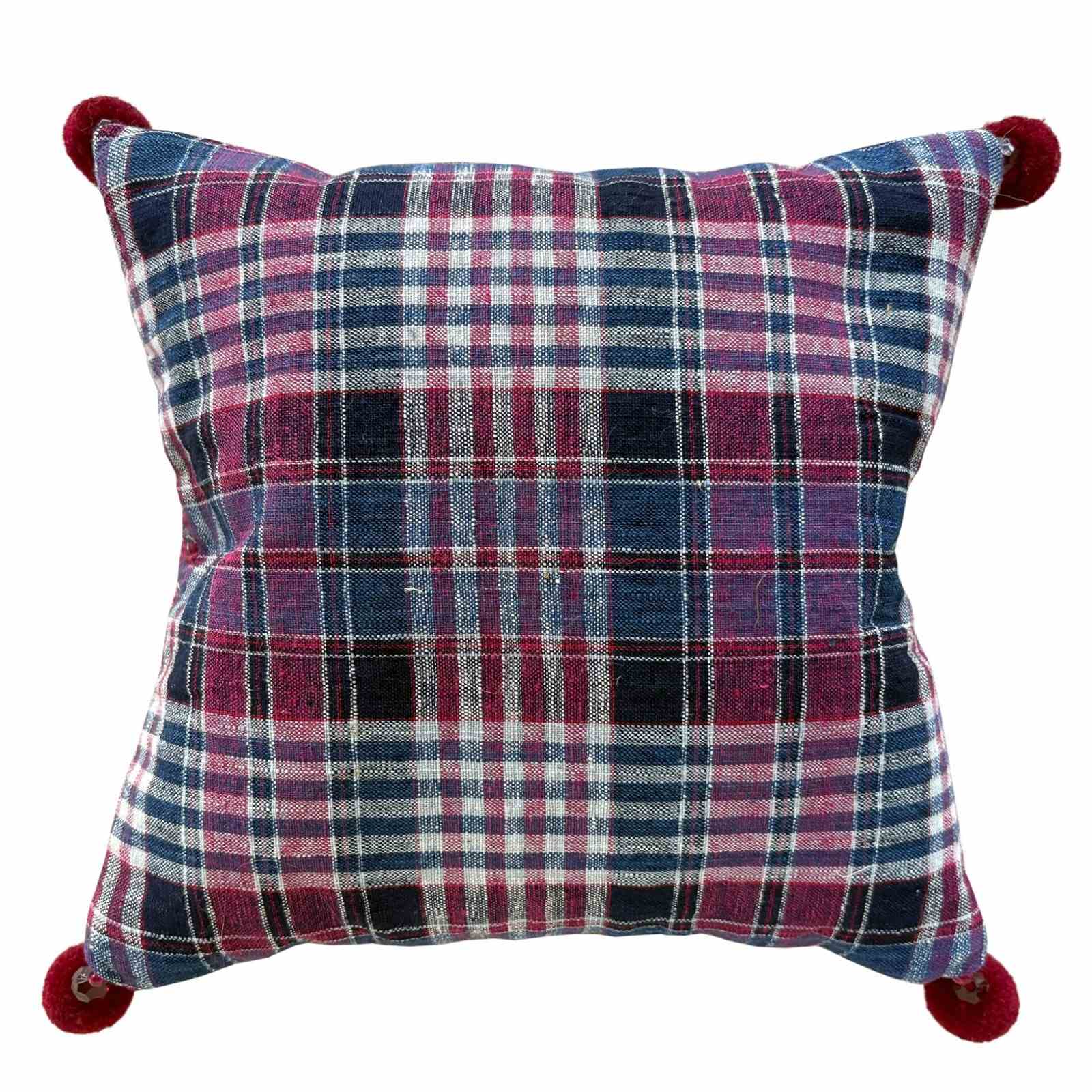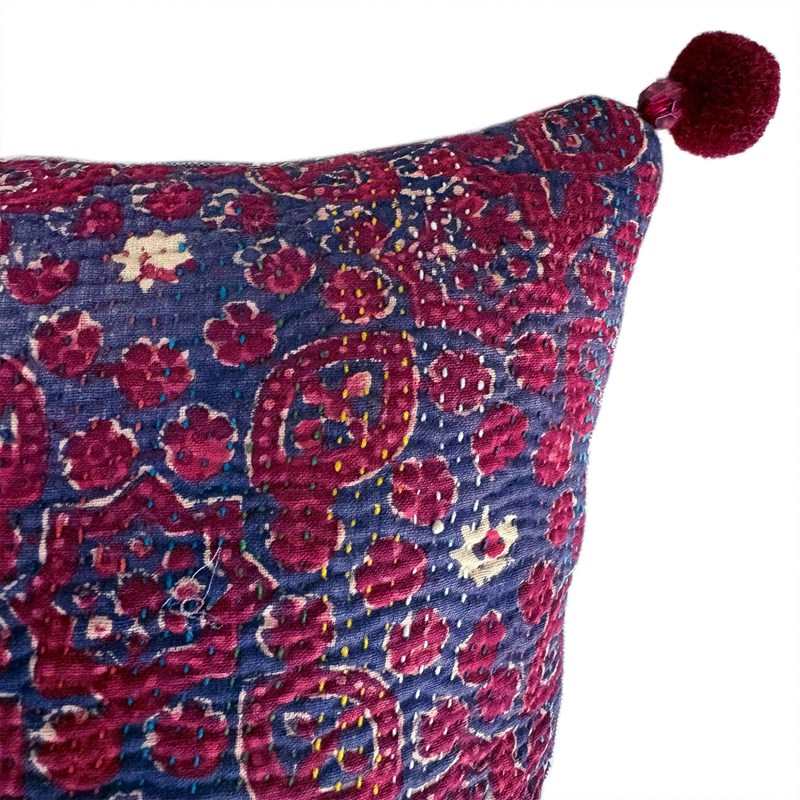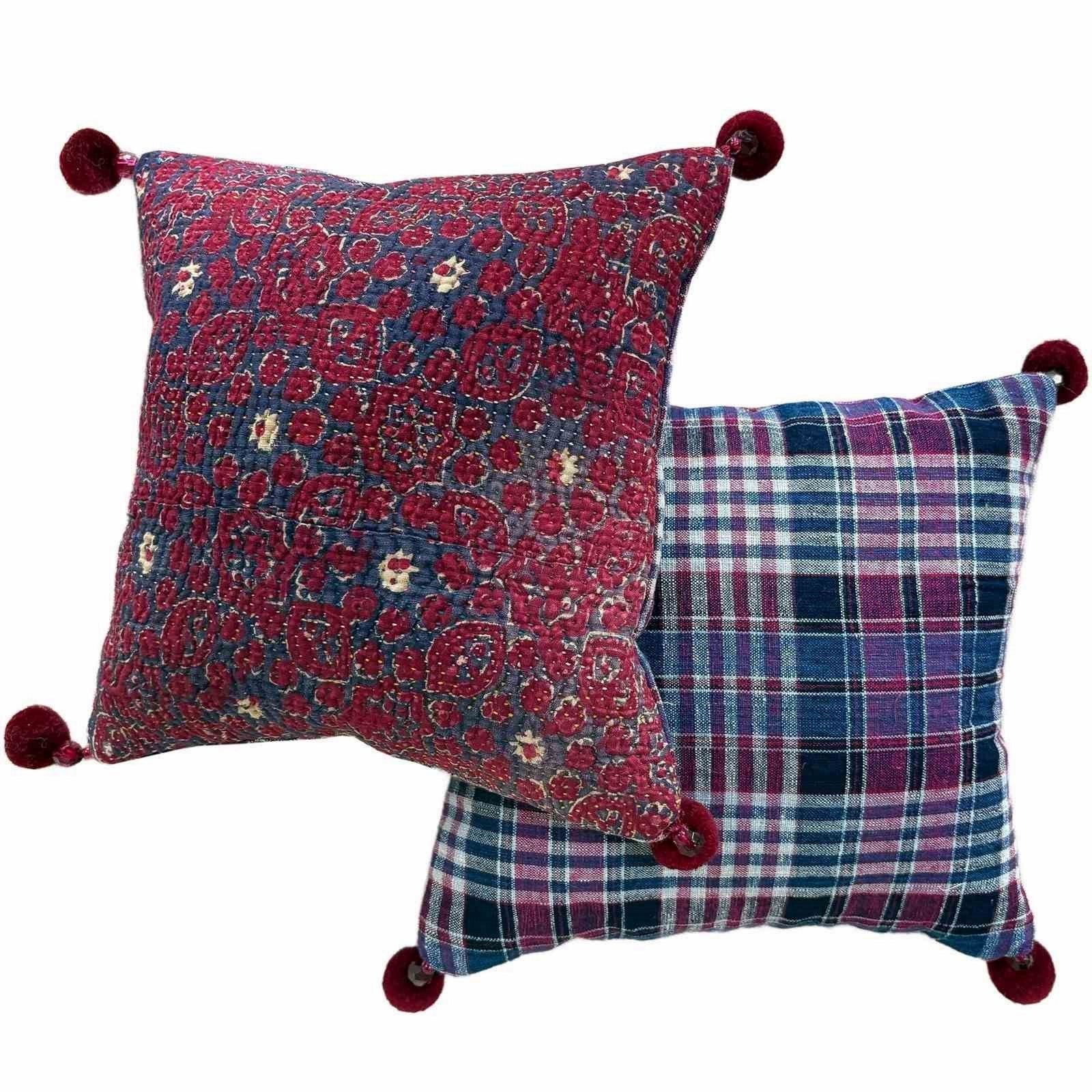 These little pillows are made from a vintage quilt by the Sami ethnic group, from Northern India. The quilt is formed from several layers of cotton quilted together in tiny stitches 2 or 3 mm long. The top layer of the quilt is lovey block print in raspberry and blackcurrant colours. Not to be confused with the ubiquitous kantha quilts made from recycled saris. I've backed the cushions with a vintage handloomed textile in a blue and raspberry plaid and there are little pom poms at the corners. The pillows are stuffed full of Provencal lavender selected for its long lasting scent.