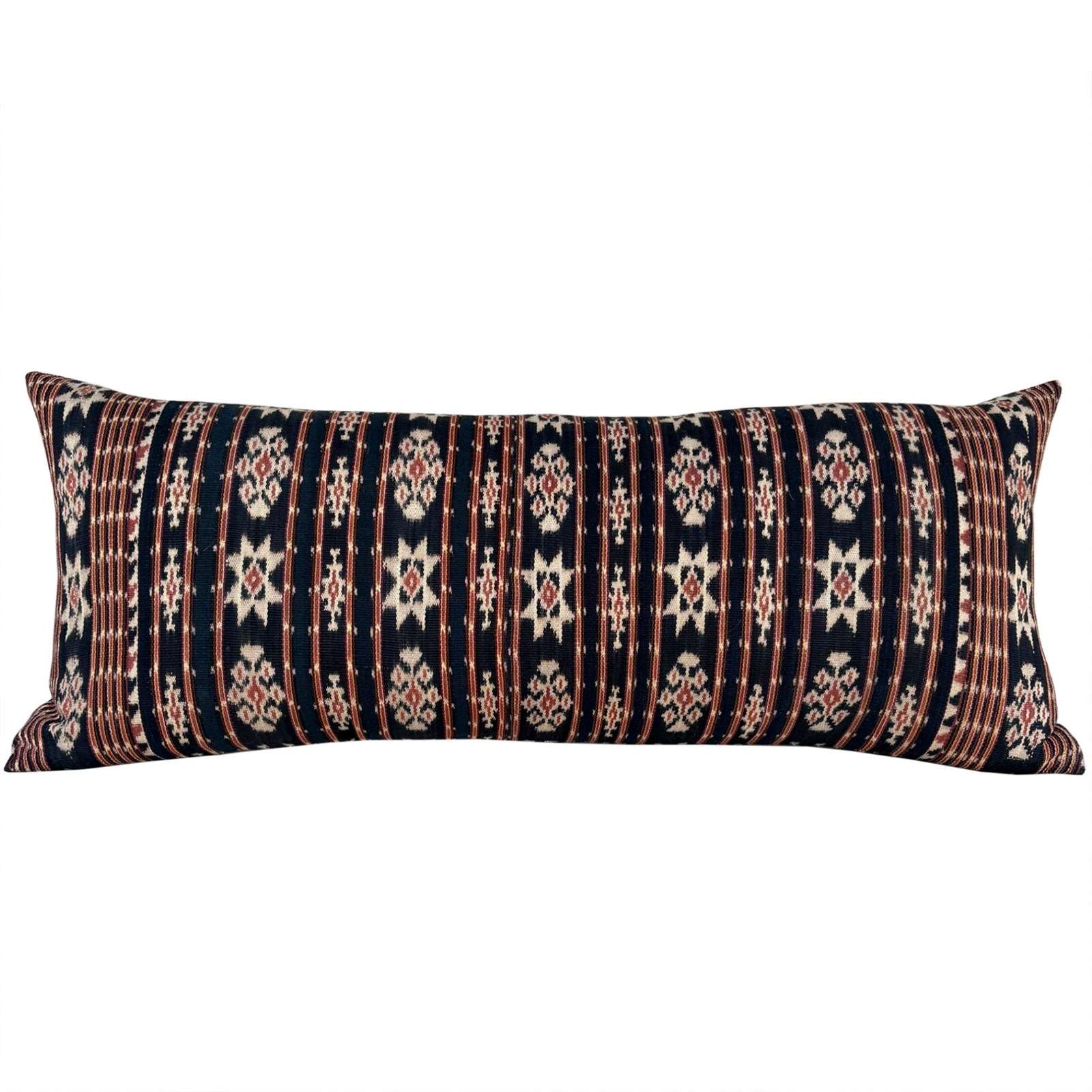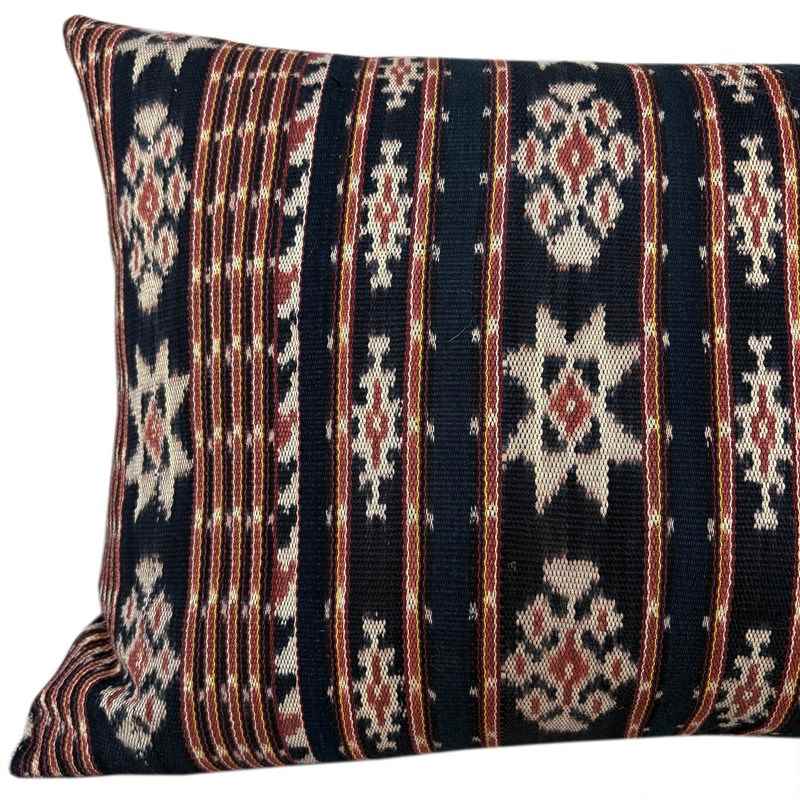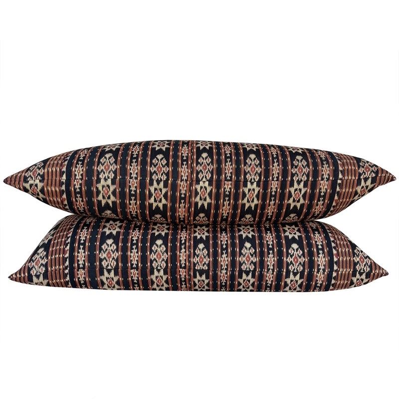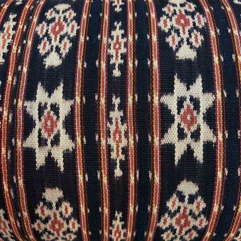 These long cushions are made from a thick hand loomed cotton shawl from Savu, Indonesia. The shawl is an ikat weave and the colours are different tones of indigo and browns. There are invisible zips and deluxe feather inserts.