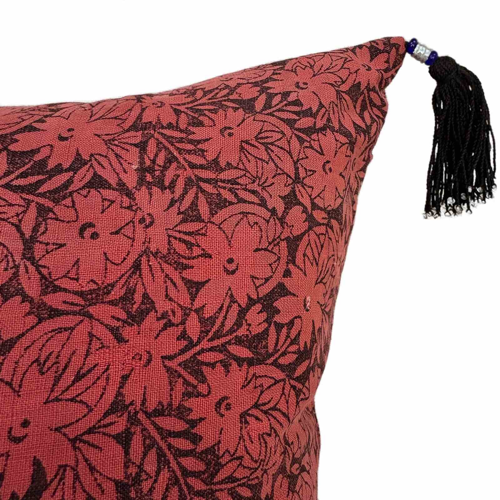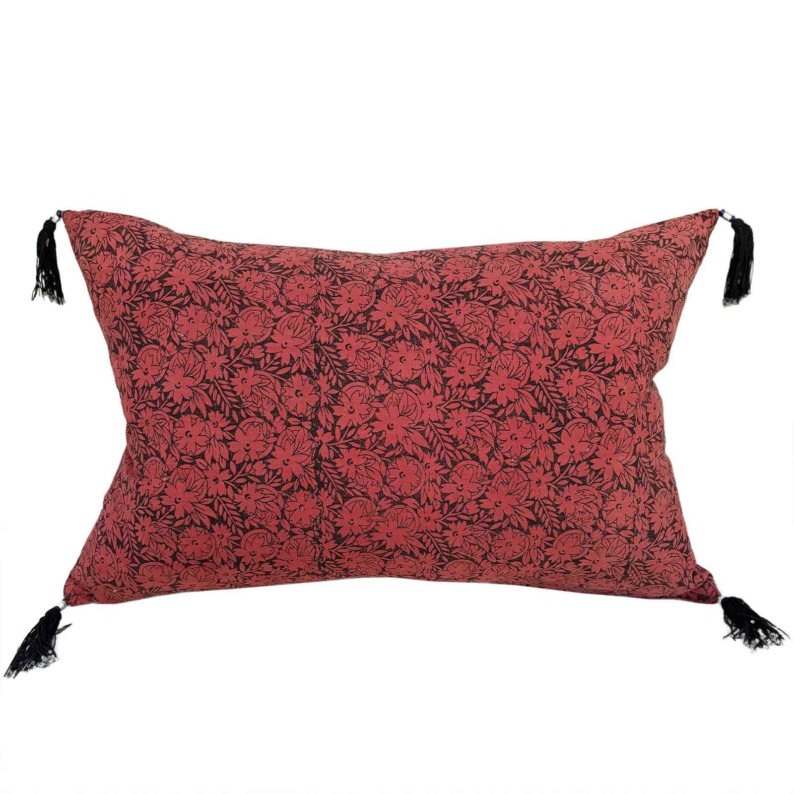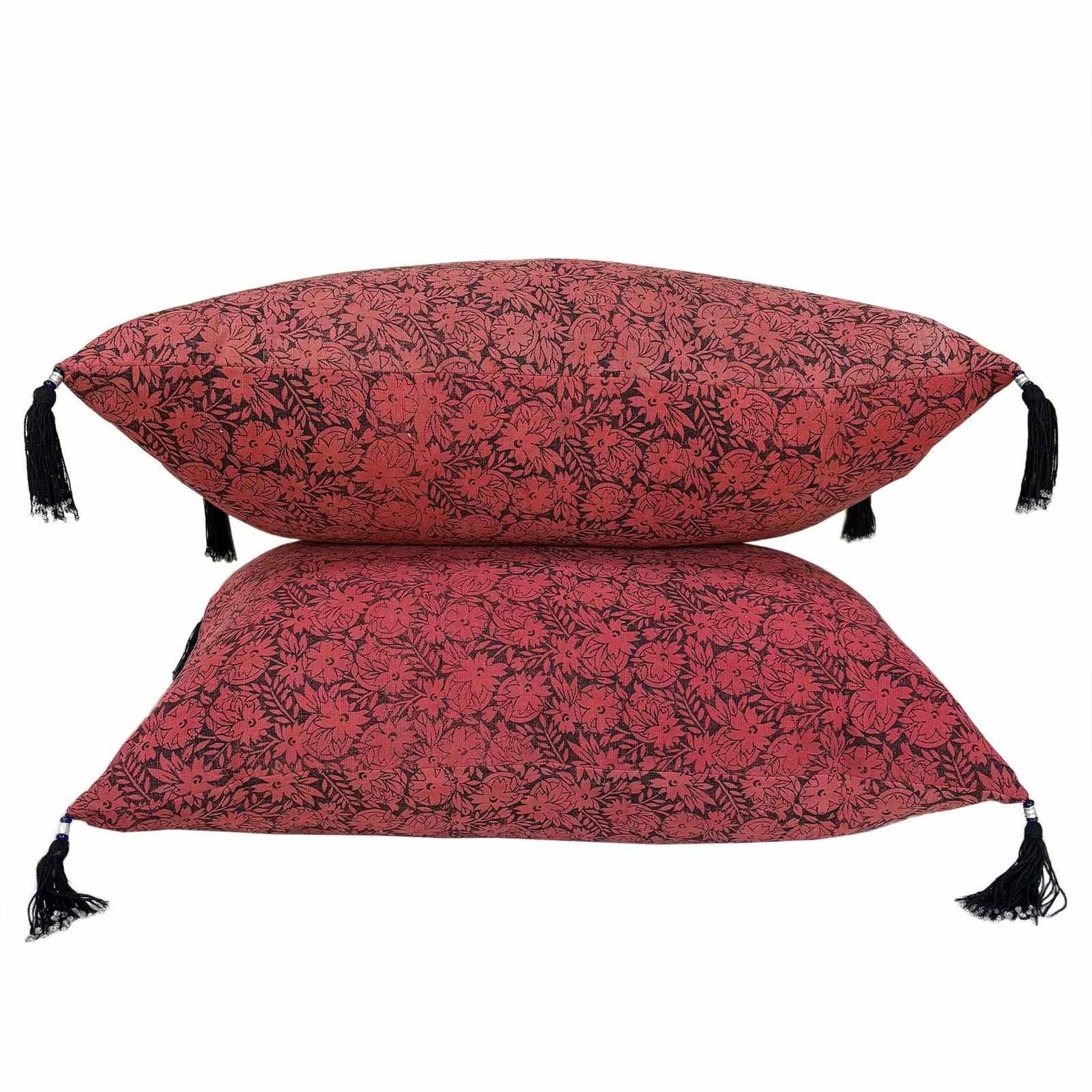 These striking pinky red cushions are made from a vintage quilt top for East China. The quilt was made of hand spun, hand loomed cotton which was then coloured with sienna red earth dye and block printed in black. The colours have faded to the lovely pinky red in the photos. I've added vintage beaded tassels in black and there are zip fasteners and deluxe feather pads.