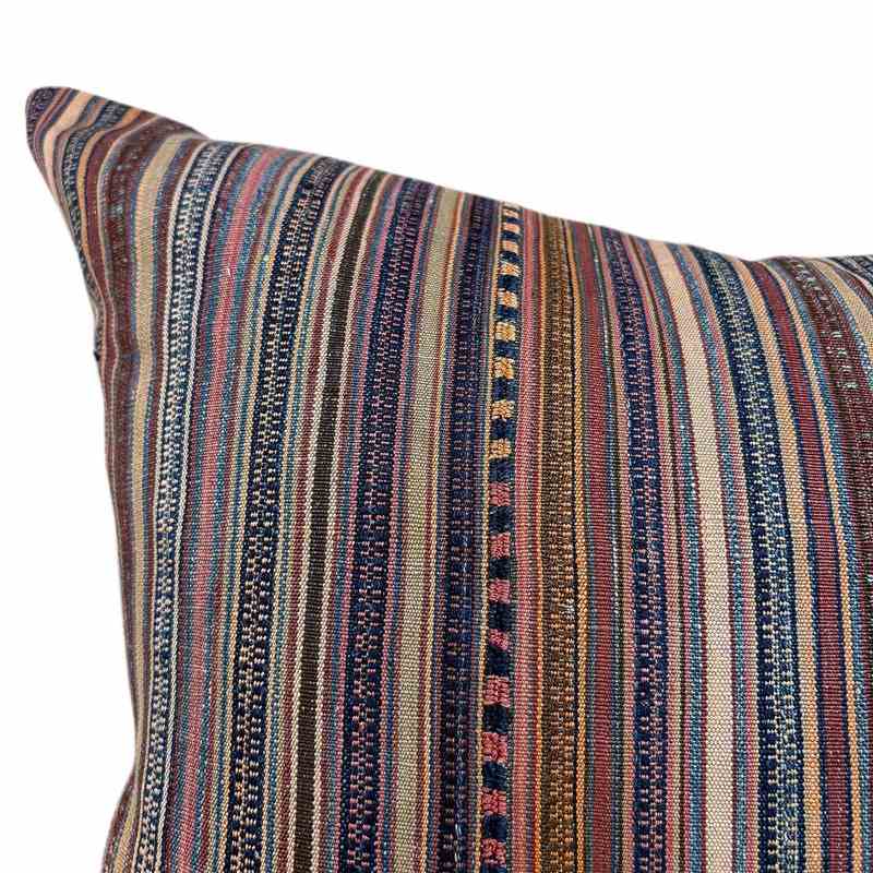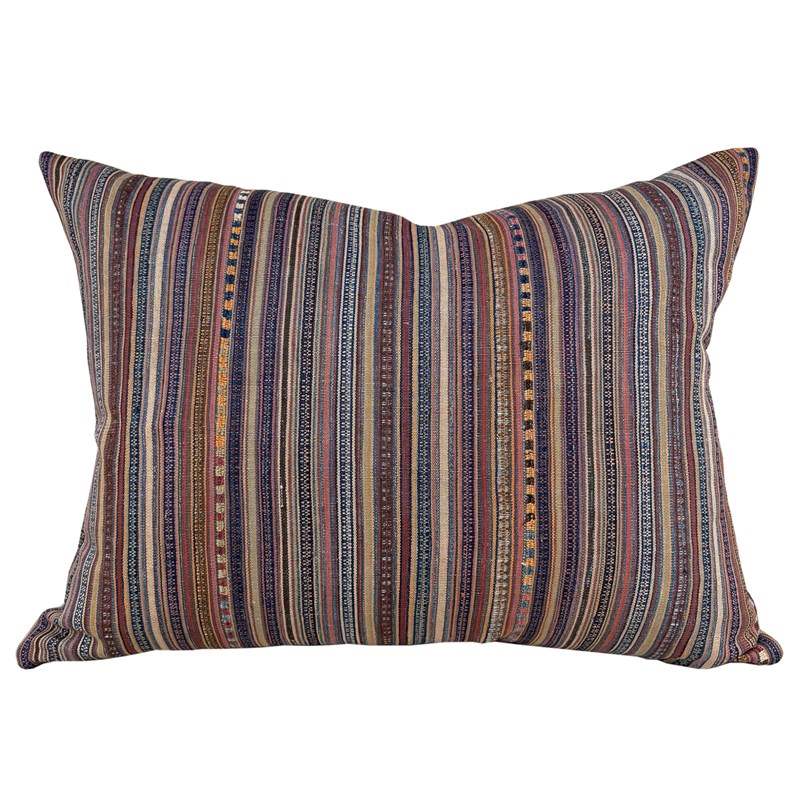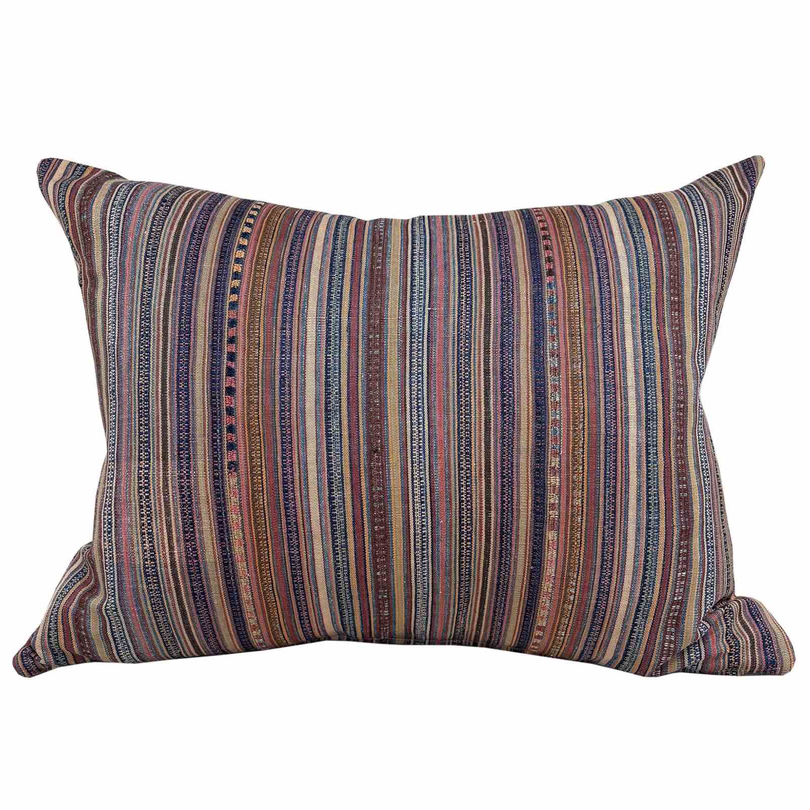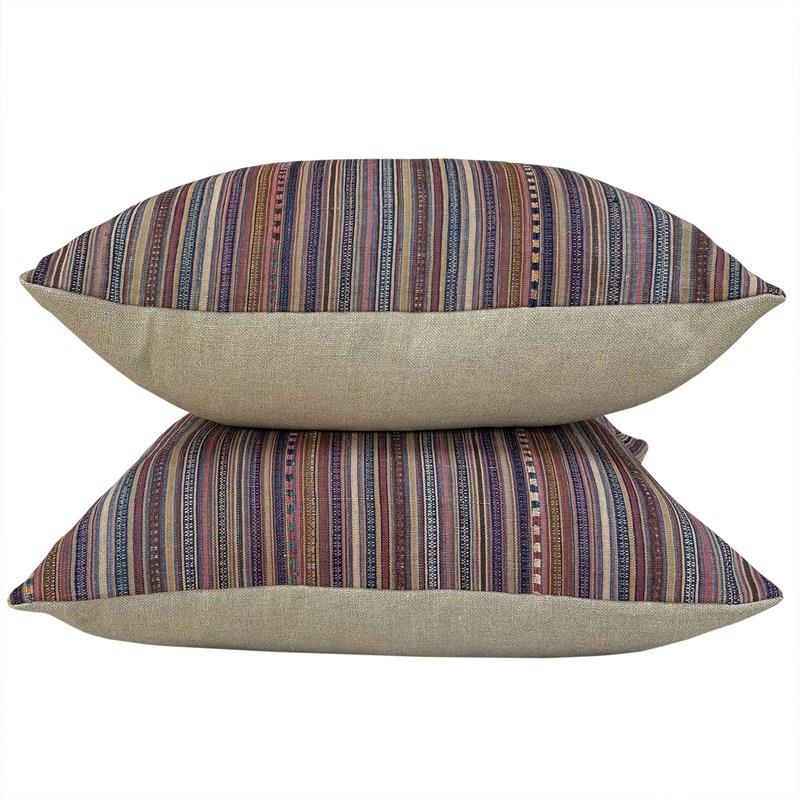 These cushions are made from a beautiful old silk jajim. The jajim dates to the first half C20 and is probably Persian. It was hand woven in thick silk yarns that have been coloured with natural dye. The colours are an exquisite mix of blue, browns and pink. I've backed the cushions with a heavyweight linen in natural and there are zip fasteners and deluxe feather pads.