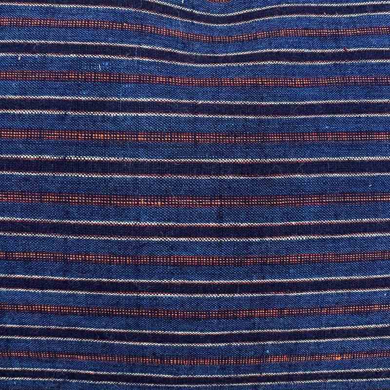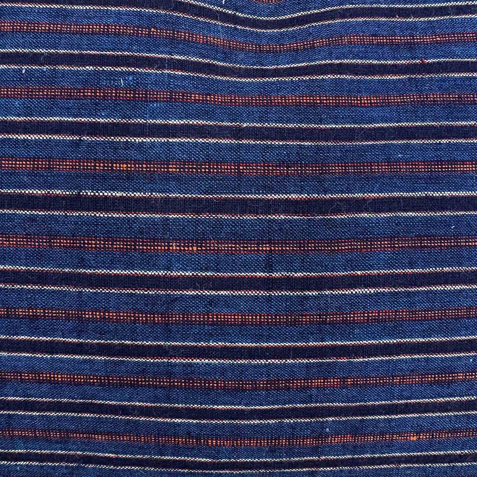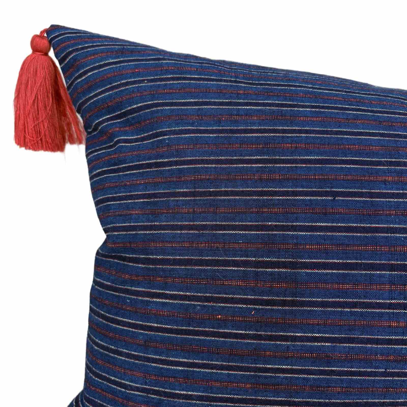 The hand loomed cotton textile dates to mid C20 and is from the Songjiang weaving districts of Shanghai. The textile has lots of texture from the hand spun cotton and knots in the weave. The colours are all natural, with tones of blue and off whie, with rust stripes. I've added rust coloured tassels and there are zip fasteners and deluxe feather inserts.