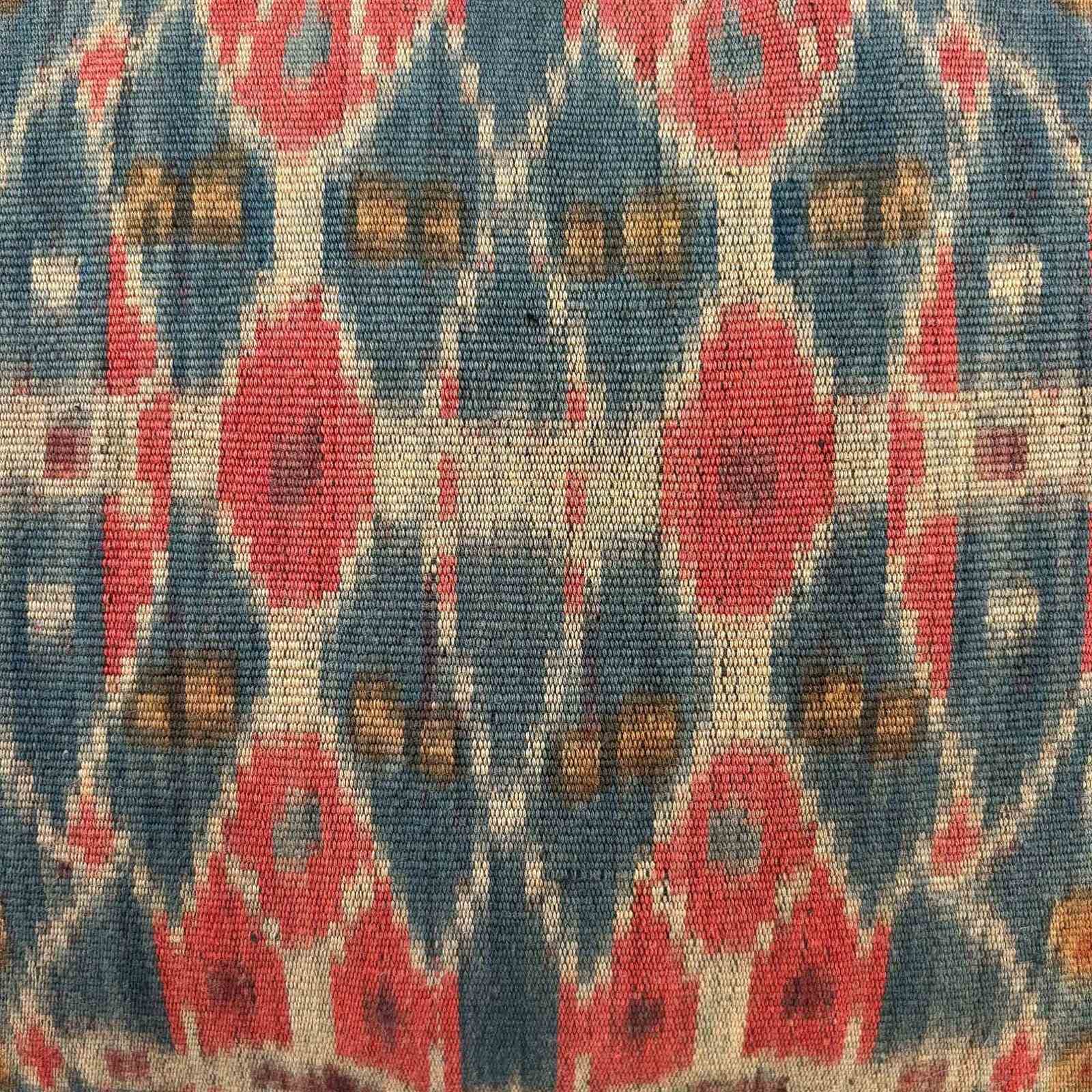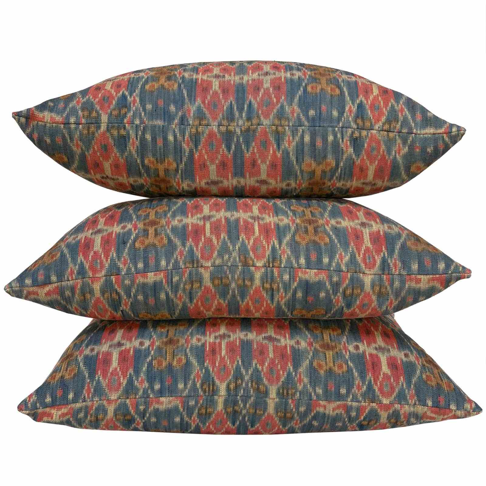 These gorgeous fat cushions are made from a hand woven ikat textile from Sumba, Indonesia. The ikat was woven in thick cotton yarn and coloured with natural dyes - Mainly morinder and indigo. The textile was a man's shoulder or hip cloth known as a hinggi. The colours have aged to a muddy palette of blue, rust and mustard. There are invisible zip fasteners and deluxe feather pads.