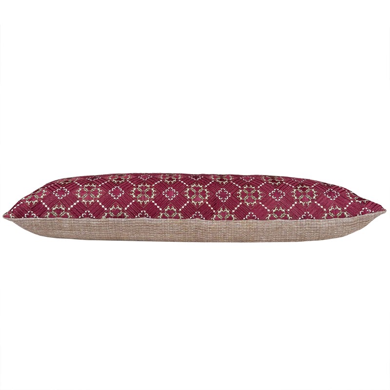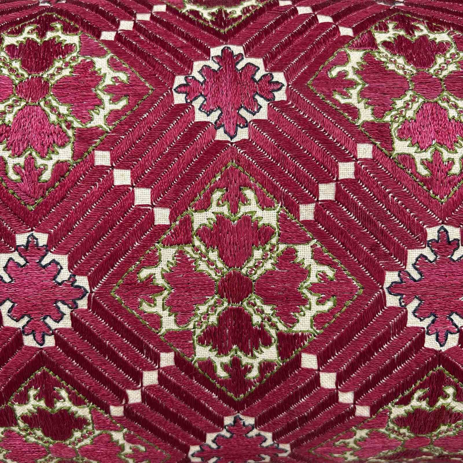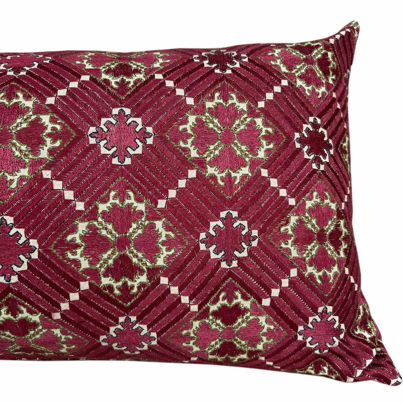 This exquisite long cushion is made from a vintage Swat shawl. The shawl is a madder coloured silk embroidery on a ground textile of hand spun and hand loomed cotton. There are accents of green silk outlining the red pattern. I've backed the cushion with a cotton textile from Java, also hand loomed with hand spun yarn in a caramel coloured basket weave. The cushion has a zip fastener and deluxe feather insert. Its a one off. The Swat embroideries tend to be in bright pink or red colours so i was very excited to get this madder colour.