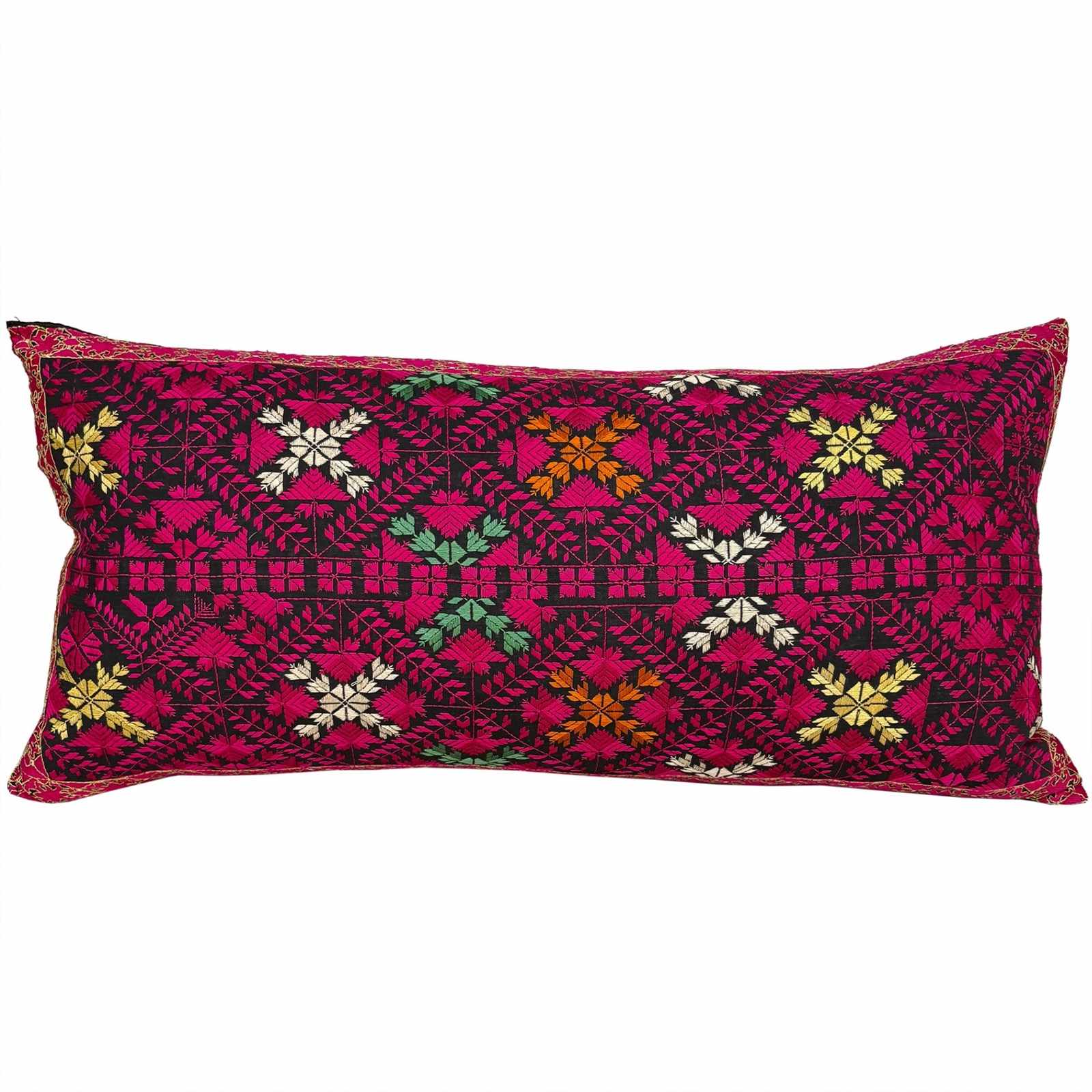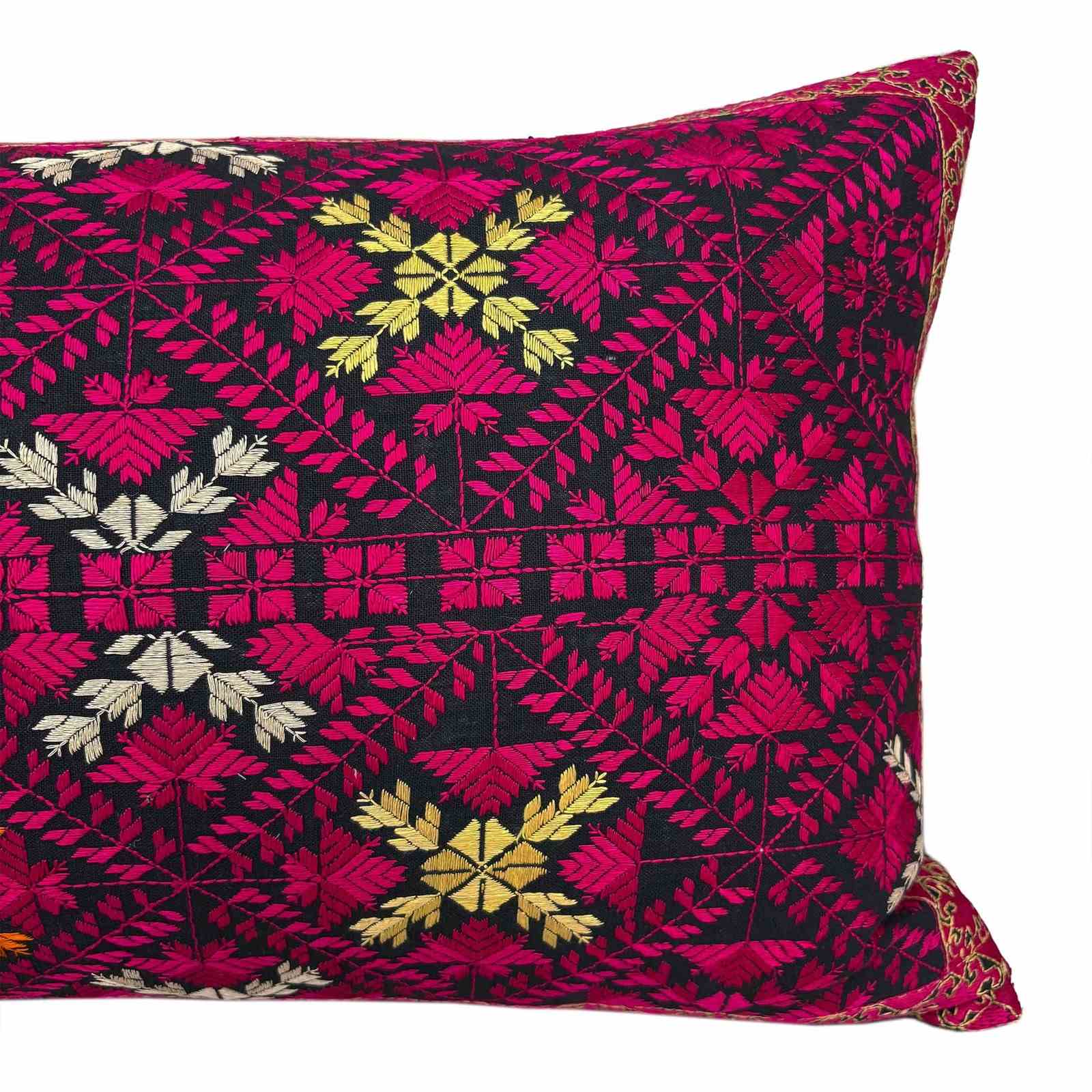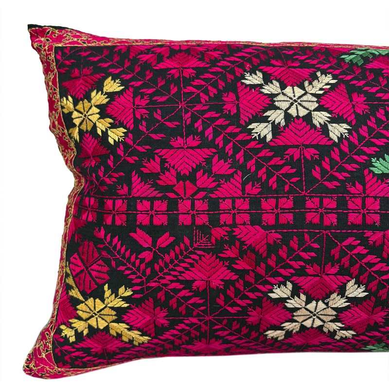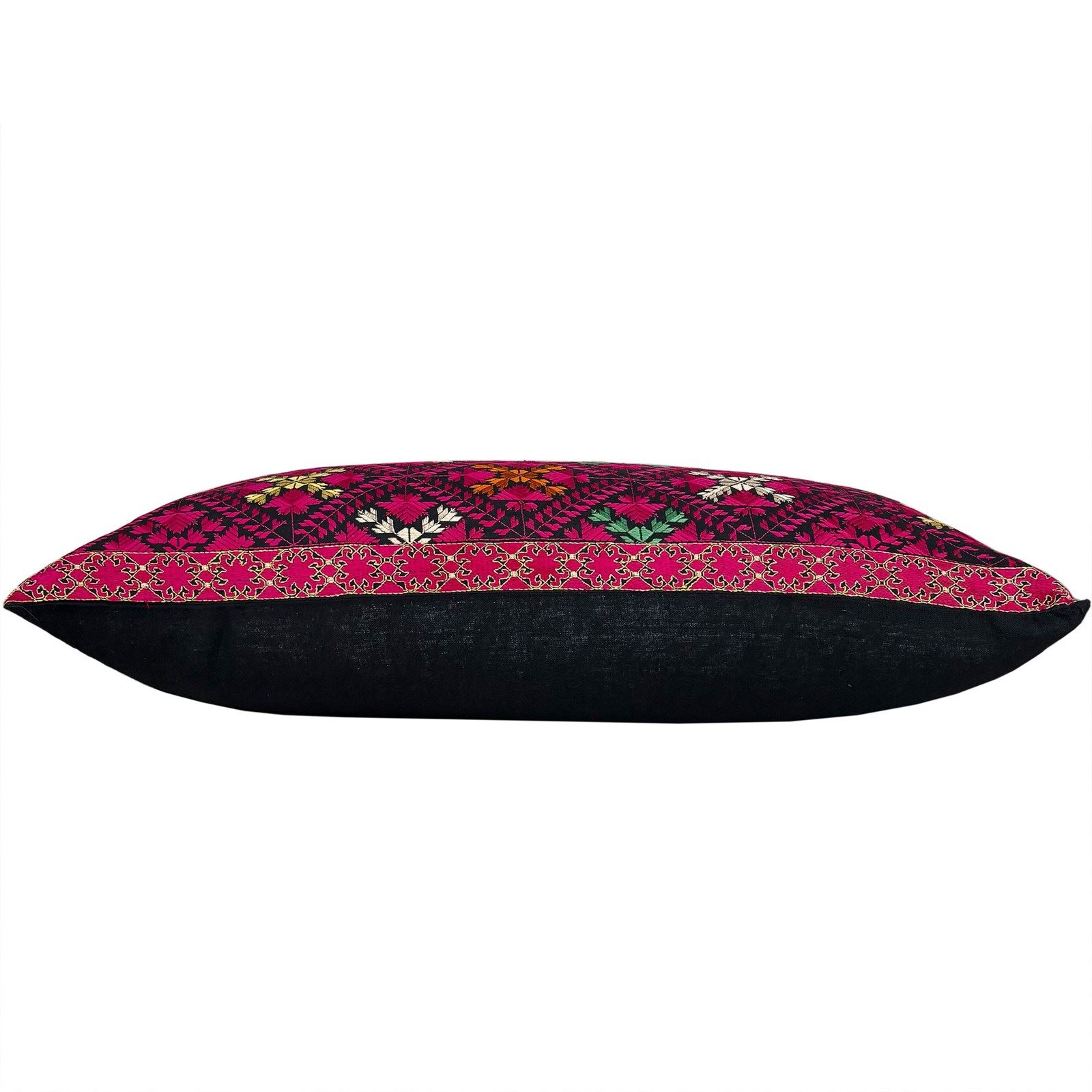 This lovely Swat marriage pillow is embroidered in pink, yellow, orange and green silk on a black cotton ground. Its in perfect condition. The reverse of the pillow is plain black. I've stuffed the pillow with a deluxe feather insert and the end is slip stitched closed.