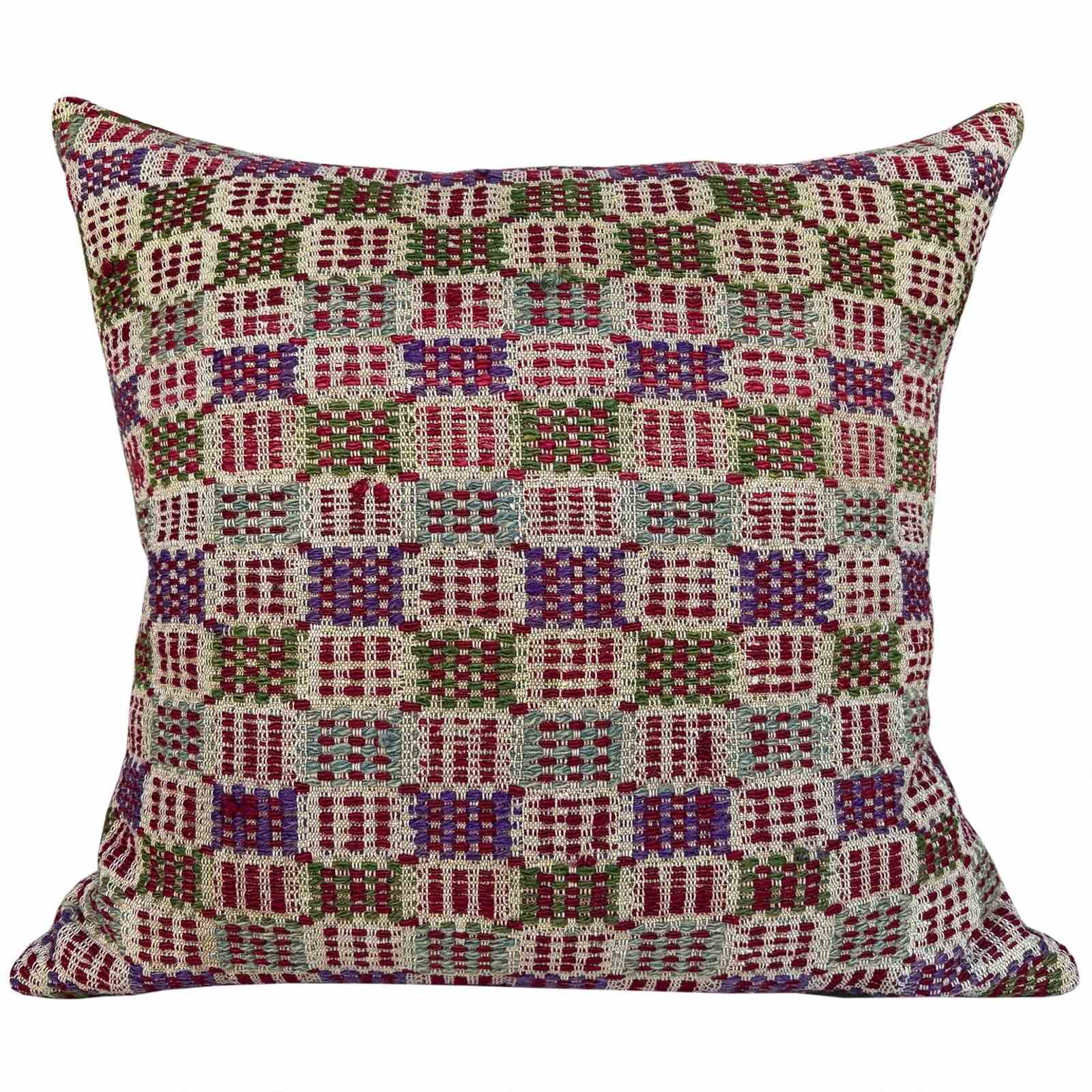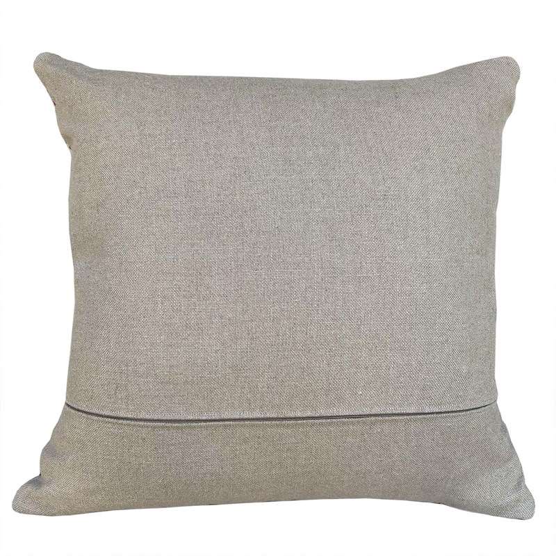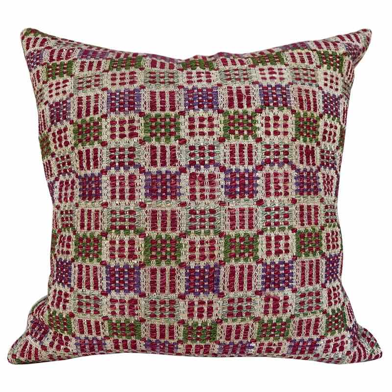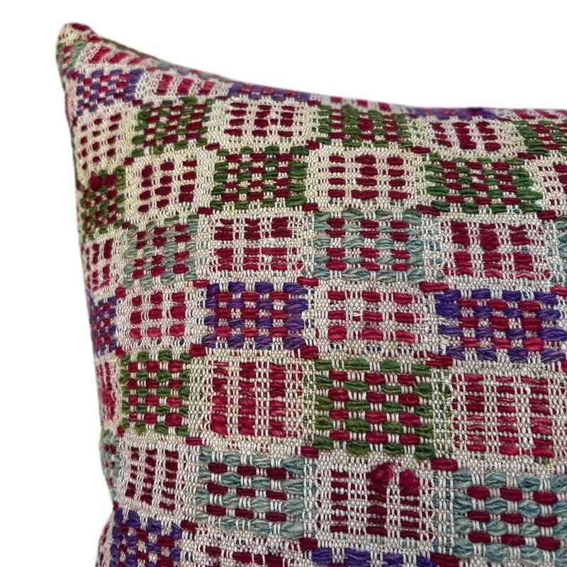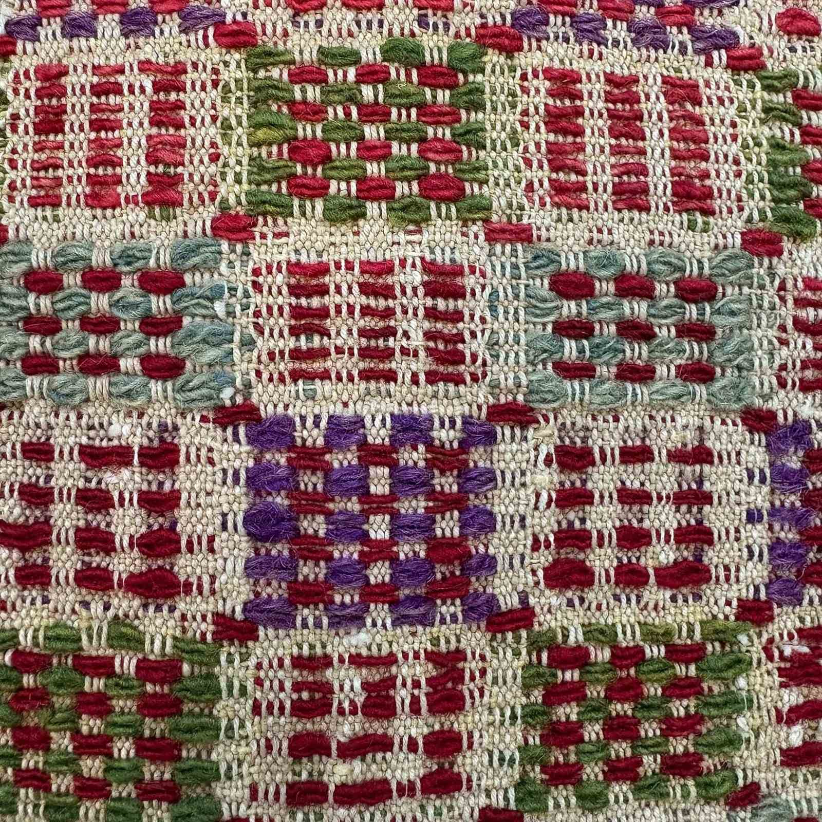 These lovely big fat cushions are made from a wonderful hand loomed Swedish textile. The textile was made on a narrow loom 24" wide, and several panels sewn together to make a bigger piece. It was used as a bed cover. The weave is a wool ground with floating supplementary weft stitches in thick floss silk in lovely natural toes of pink and green. The textile is thick and makes a robust and interesting cushion. I've backed the cushions with thick natural coloured linen and there are zip fasteners and deluxe feather pads.