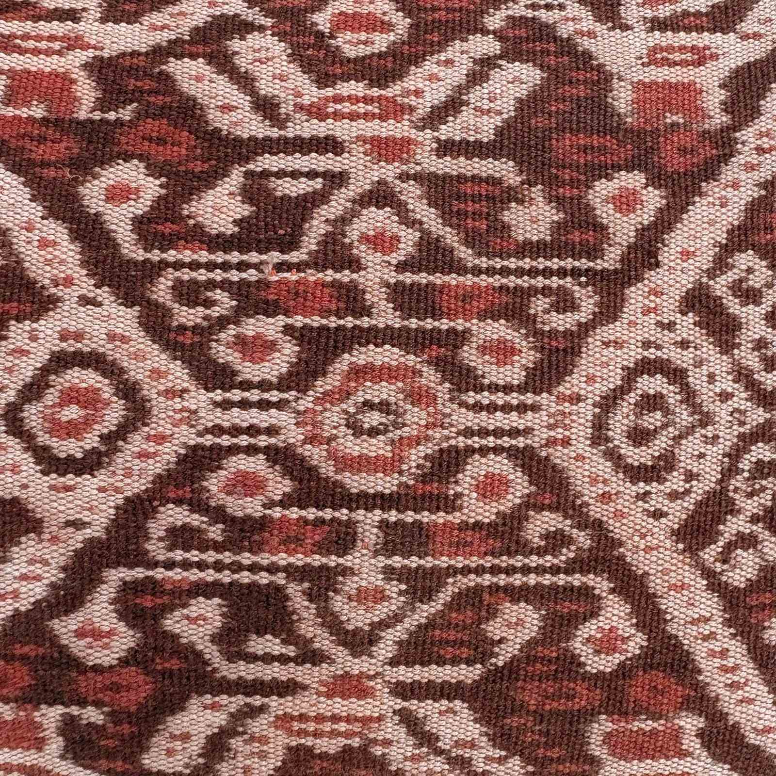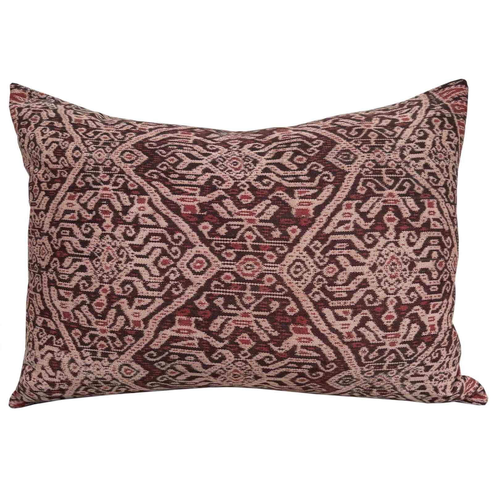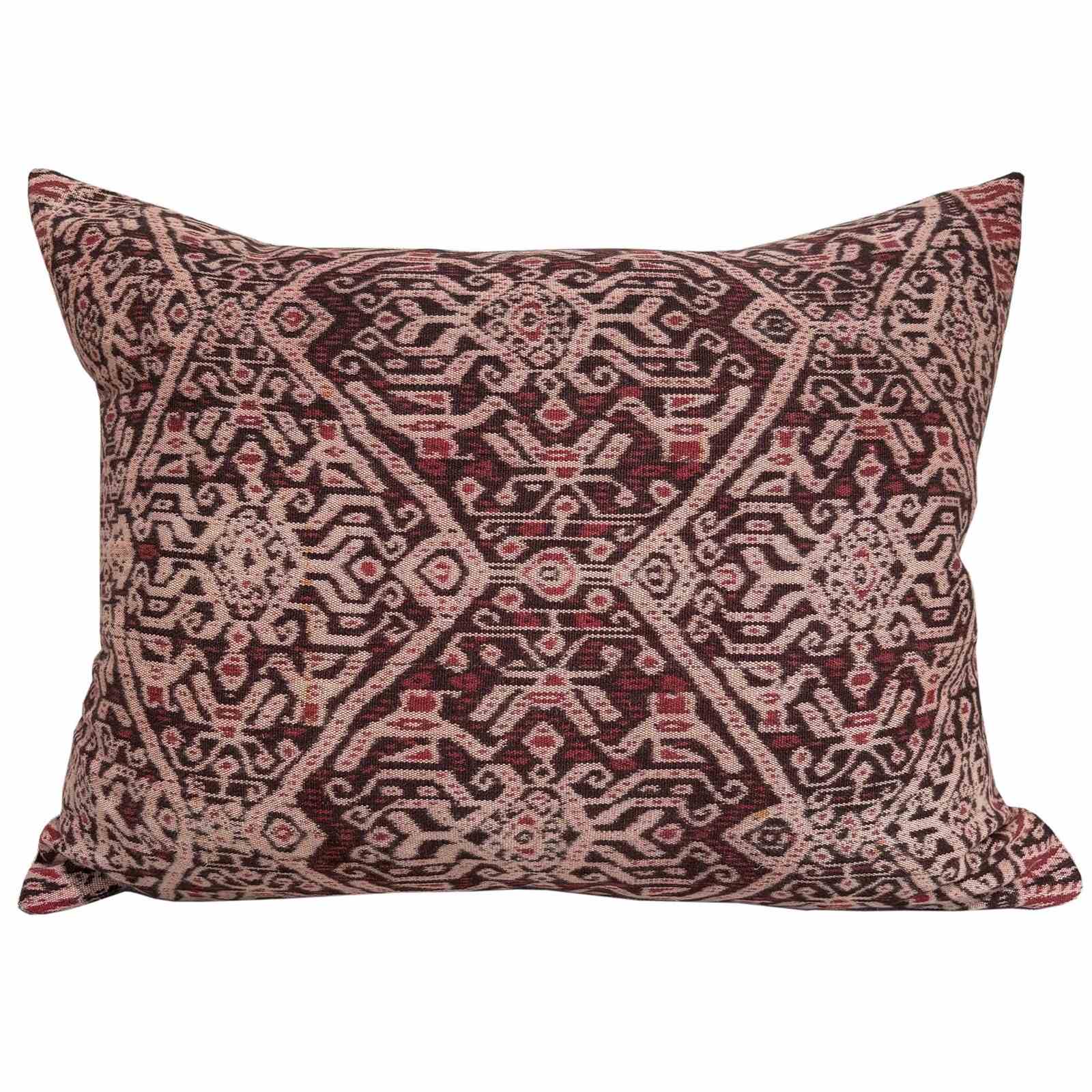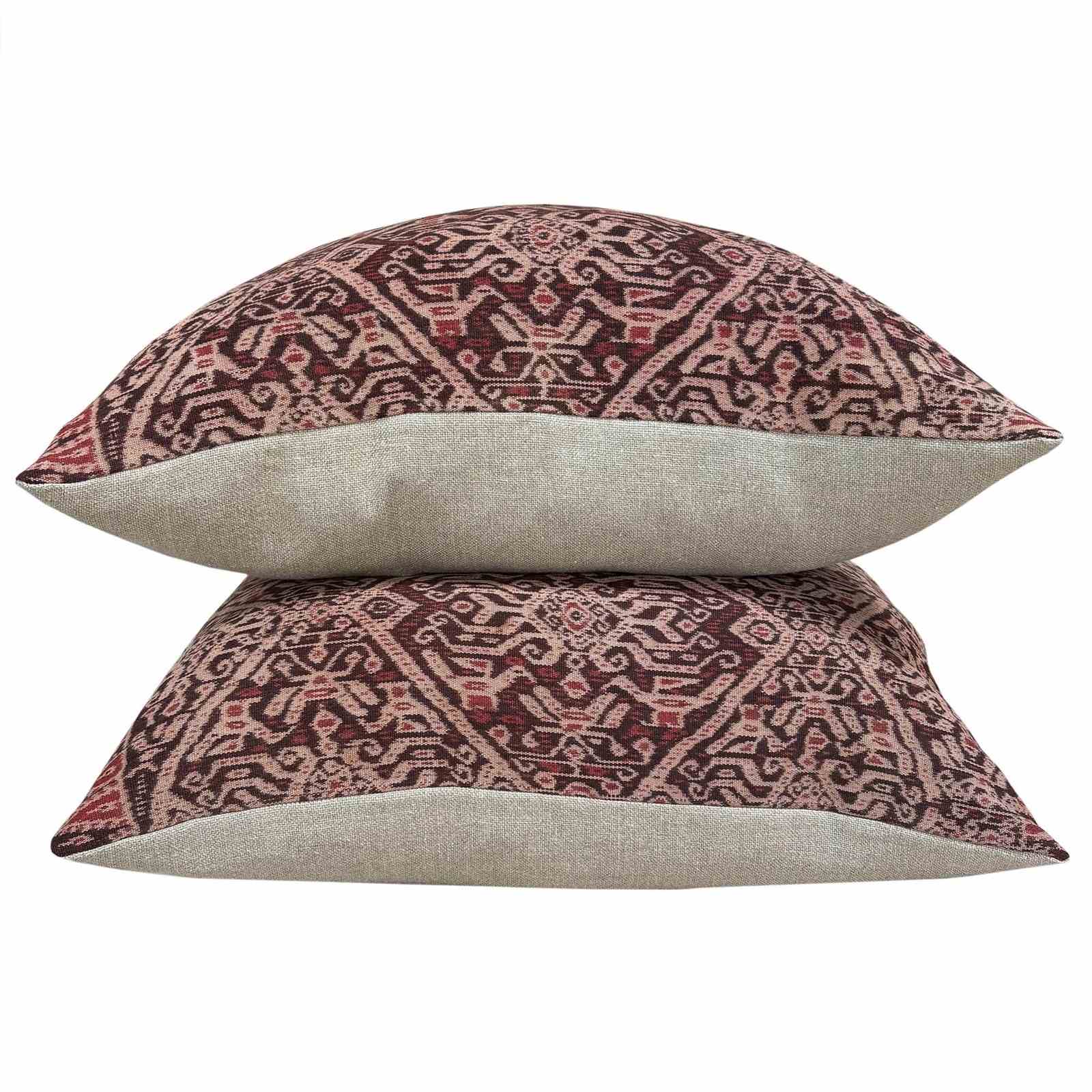 These cushions are made from a vintage handwoven ikat from Biboki, Timor. The ikat is coloured with natural dye, and is several shades of a beautiful reddy brown. It was probably coloured with morinder which is a relative of the madder plant. I've backed the cushions with a heavy linen in natural and there are zip fasteners and deluxe feather pads.