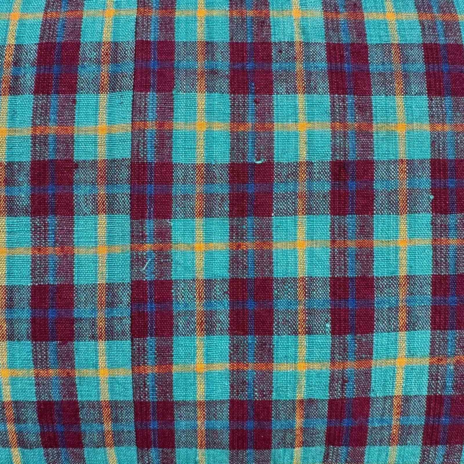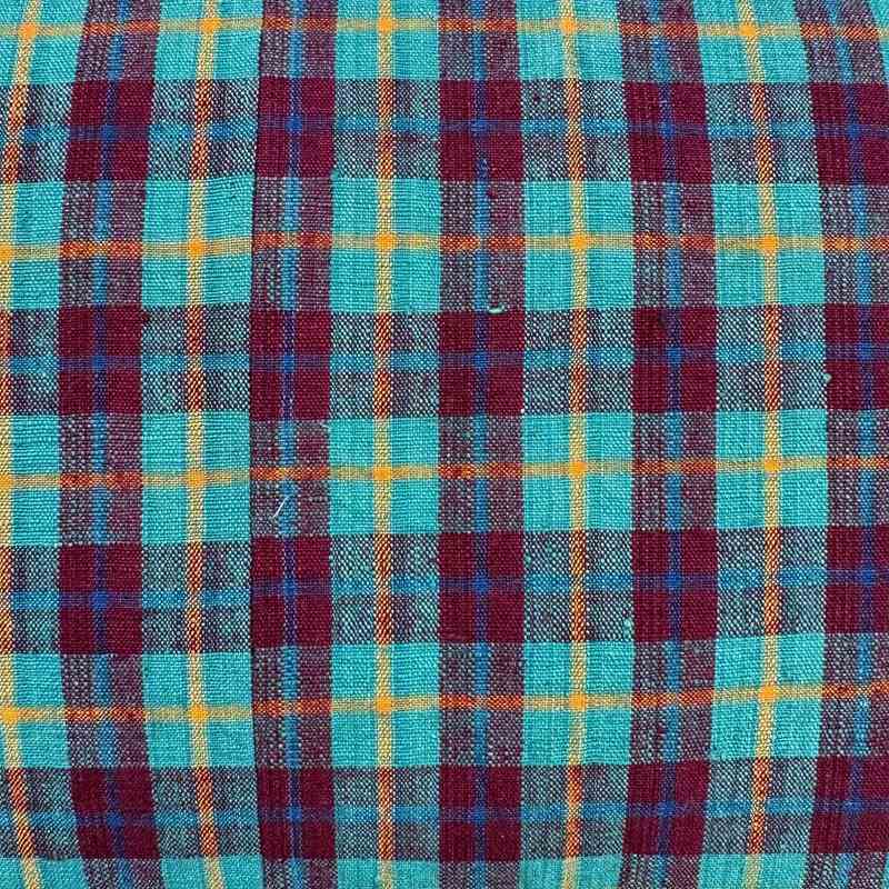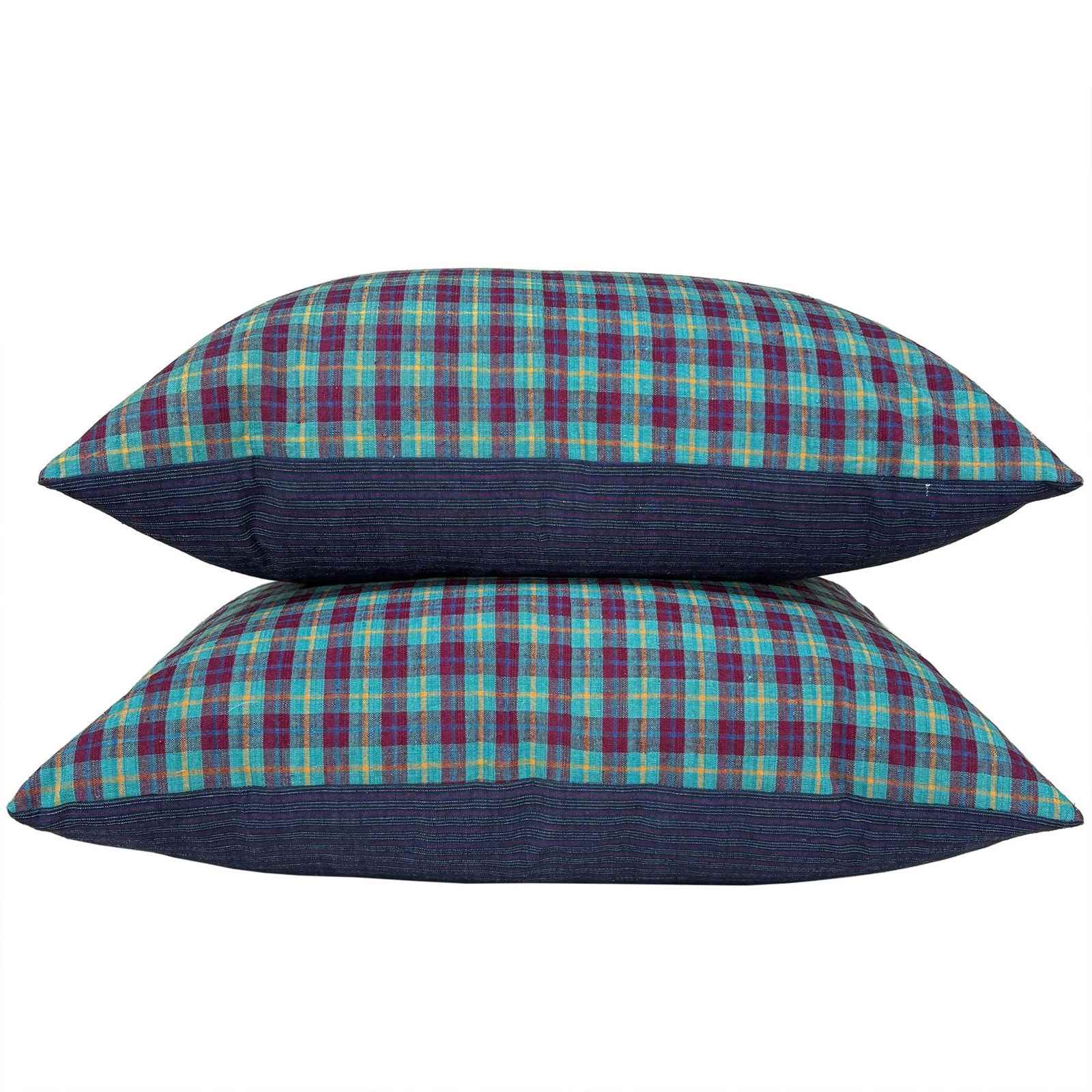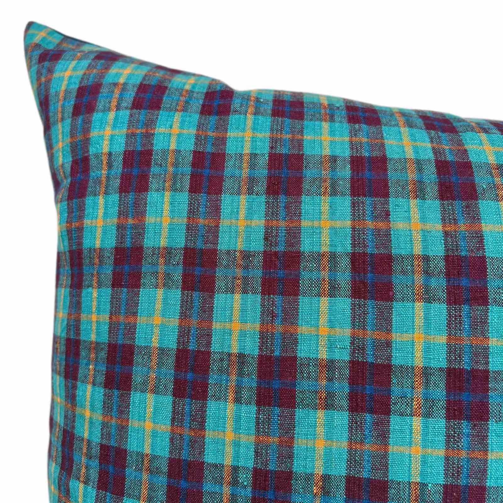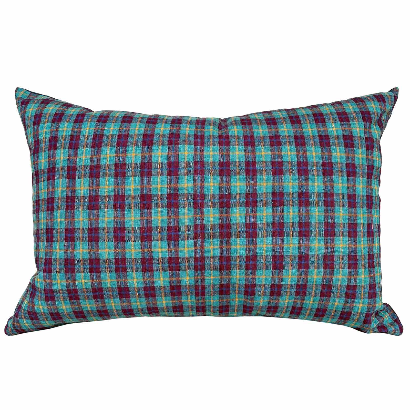 These cushions are made from vintage hand loomed cotton textiles from the weaving districts of Shanghai. The front textile is a wonderful turquoise and berry check with a yellow pinstripe running through it. The textile was woven on a narrow loom, only 13" wide so I've joined 2 pieces to get the desired width. The backs are also vintage and hand loomed, in a dark blue with turquoise and white pinstripes. The cushions have zip fasteners and deluxe feather inserts.