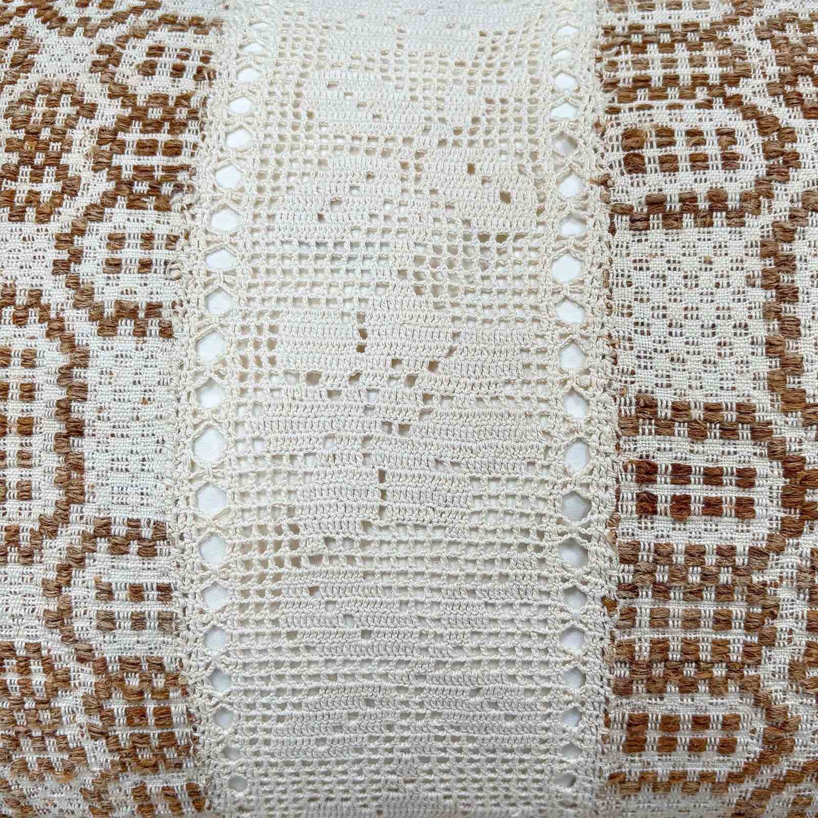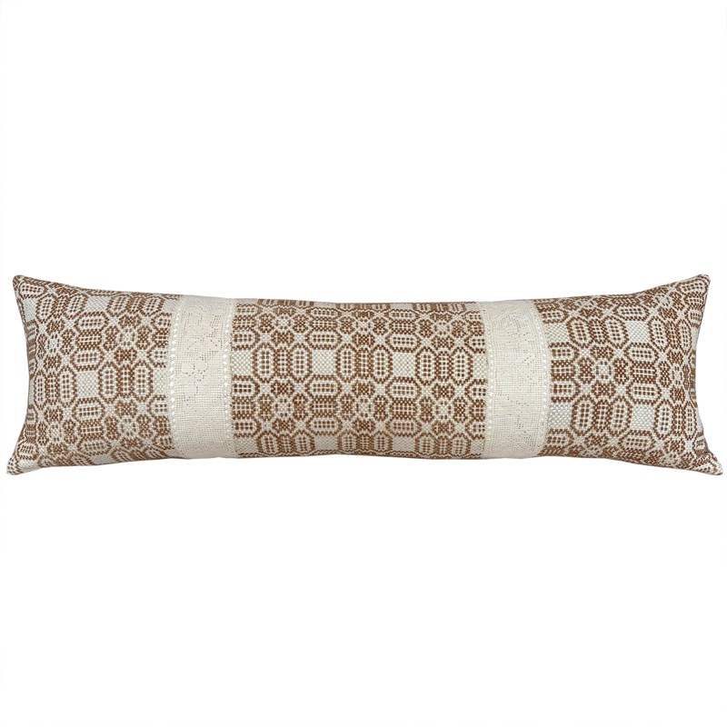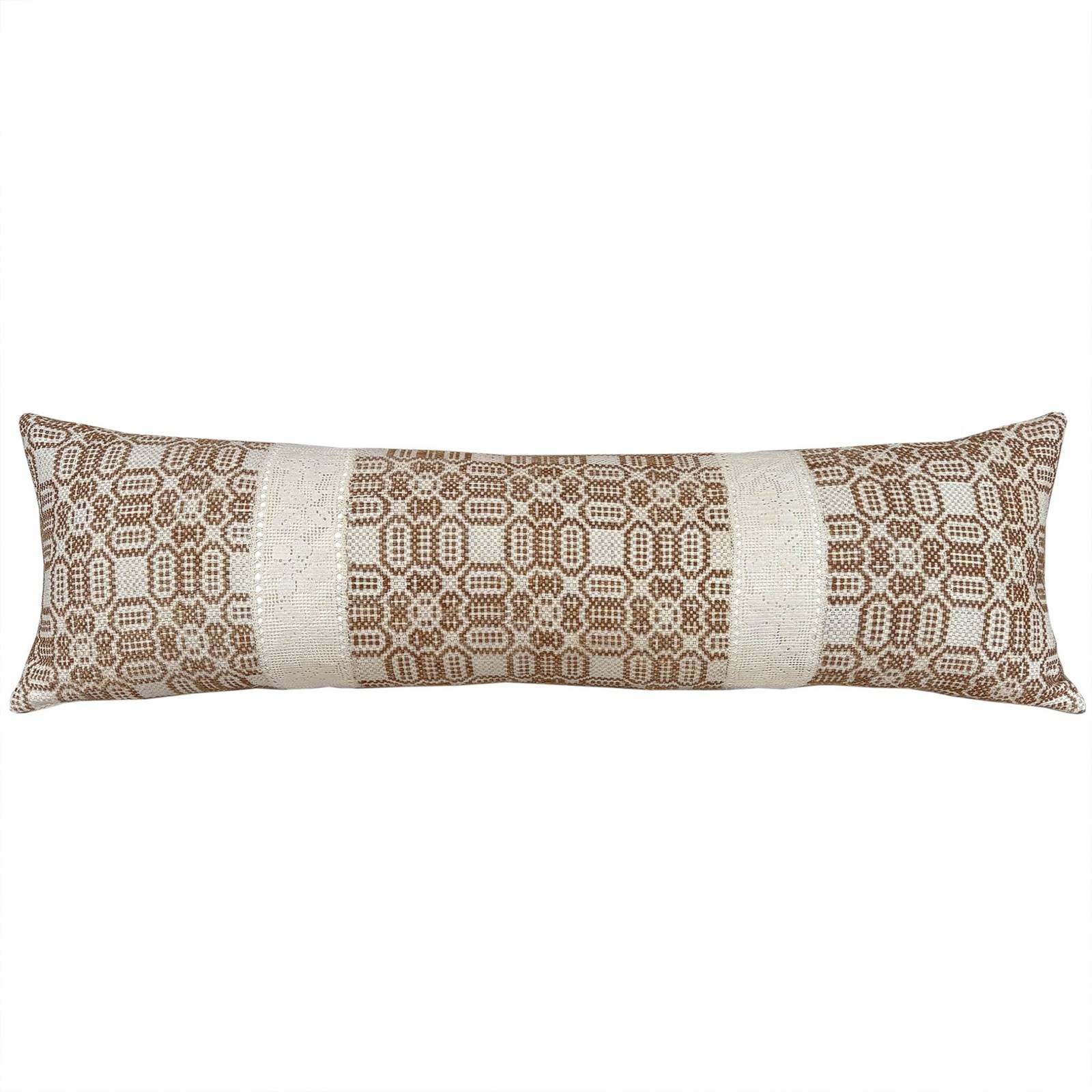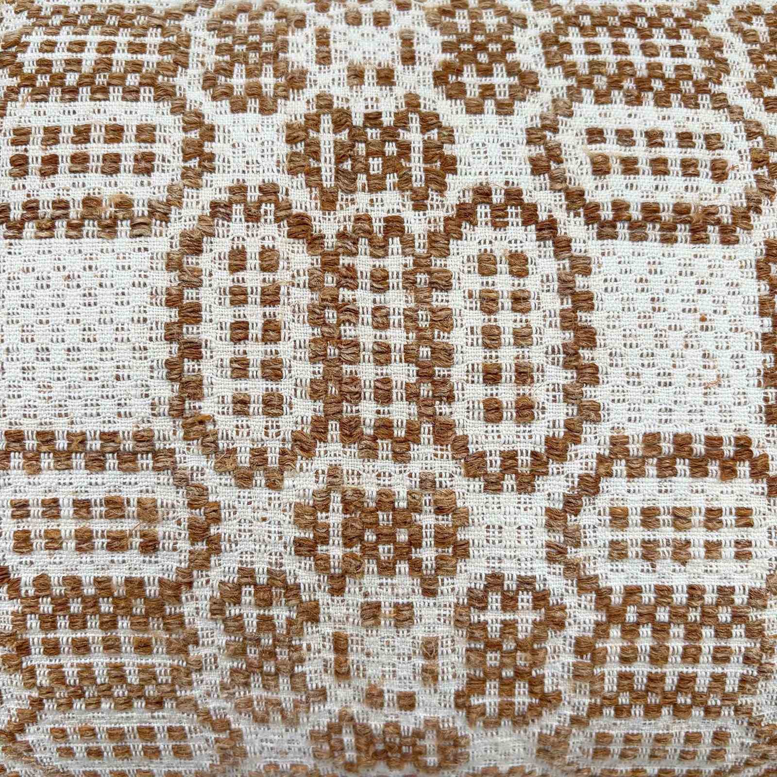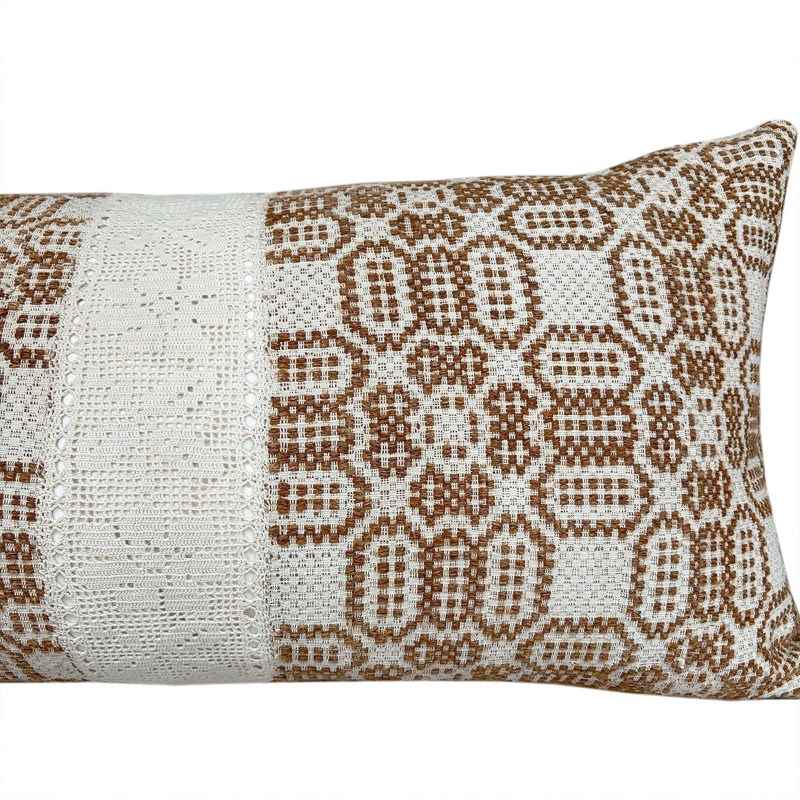 This stunning long cushion is made from an antique Transylvanian hand loomed textile. The textile is woven in linen and cotton and the pattern is exquisite. Its a lovely thick weave made on a narrow hand loom and pieces have been joined with macrame work in an off white cotton to make a bigger piece. Its a unique and interesting textile which ive made into a huge bolster cushion which would be perfect for a bed. There is an invisible zip fastener and feather pad.