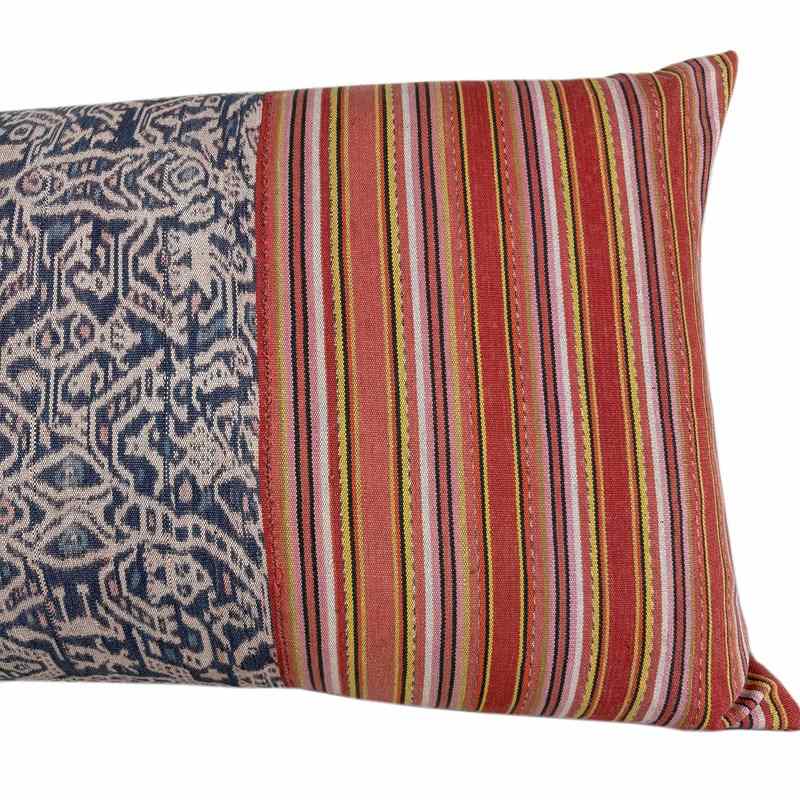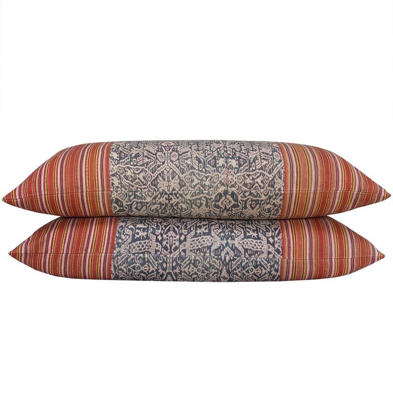 These gorgeous cushions are made from a vintage hand loomed textile from Timor, Indonesia. The textile was rescued from a tube skirt, of thick cotton, woven using the ikat technique. The colours are all natural and the middle pattern is known as futus. There are zip fasteners and deluxe feather inserts.