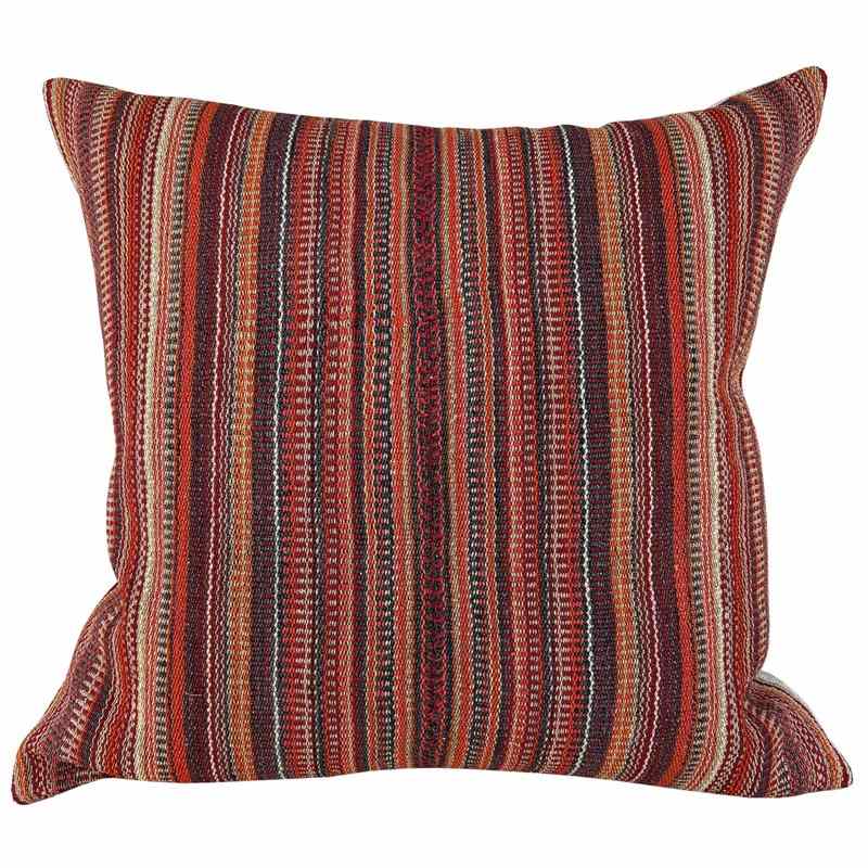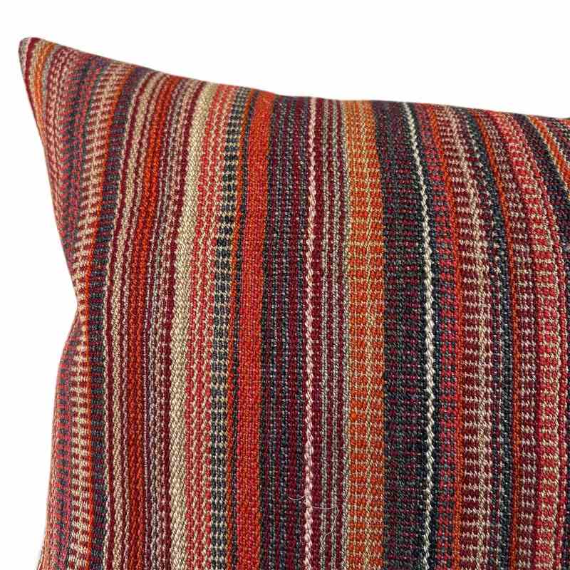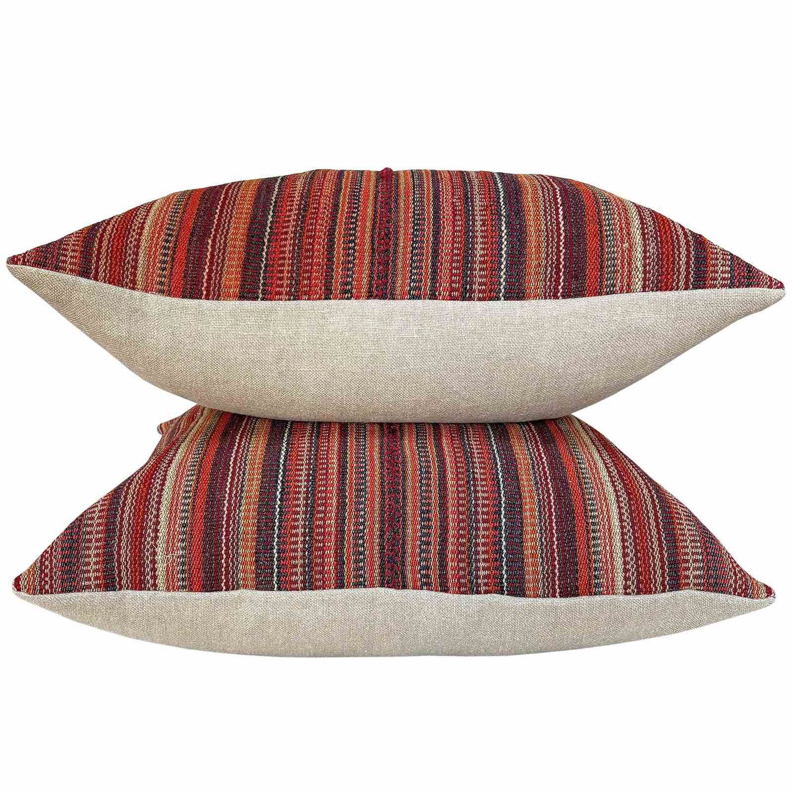 These cushions are made from a really beautiful vintage jajim from Yasukand, Iran. Jajims have a wonderful drape and were traditionally used in nomadic households to cover or store belongings. They were hand loomed on narrow looms and the panels sewn together to make a larger textile. This jajim is woven from coarse wool with a really lovely palette of natural colours in tones of rust and brown, and makes beautiful and robust cushions. I've backed the cushions with a heavy natural coloured linen and there are zip fasteners and deluxe feather pads.