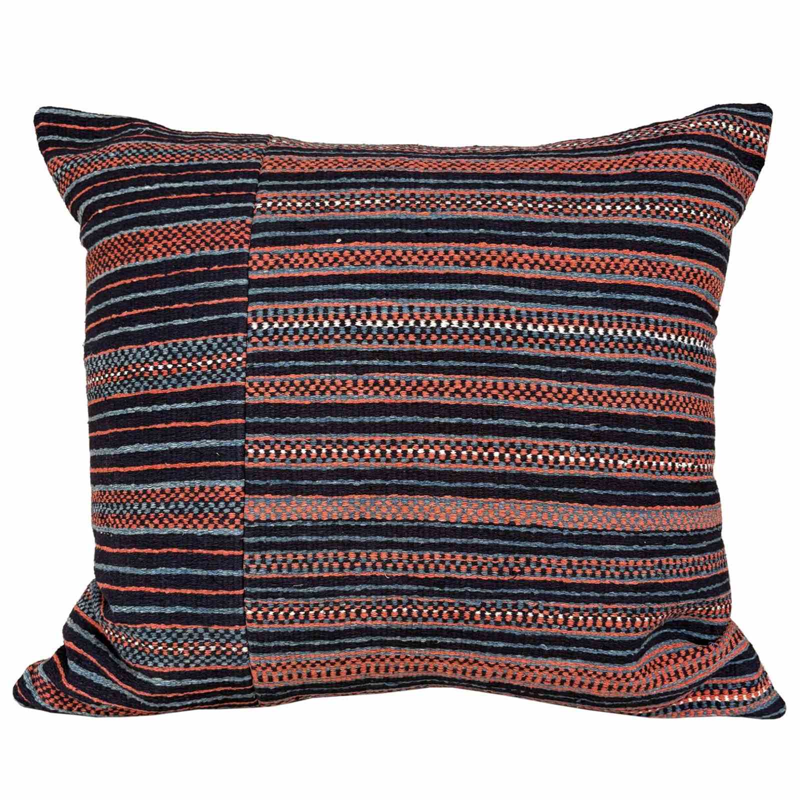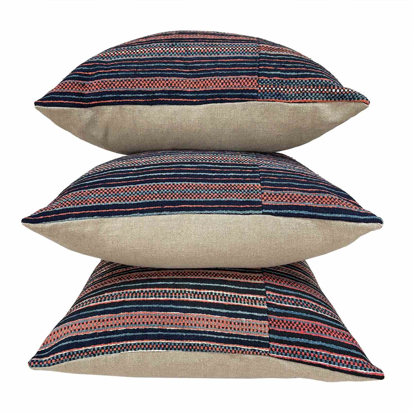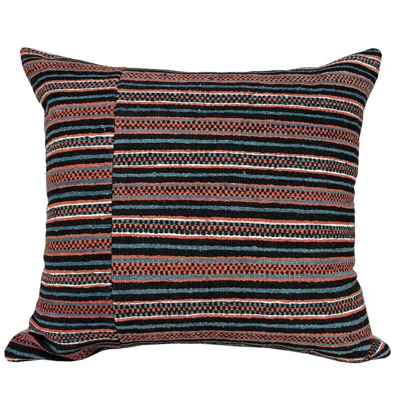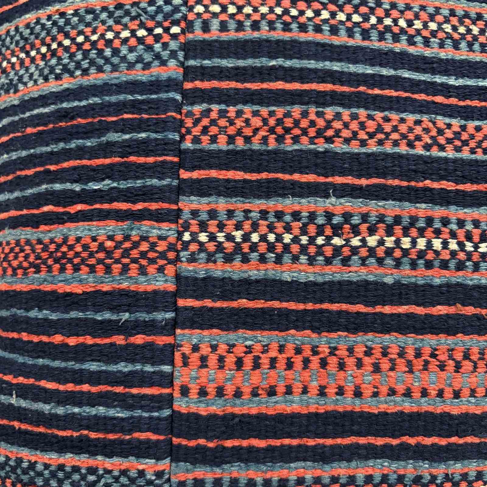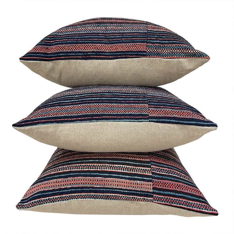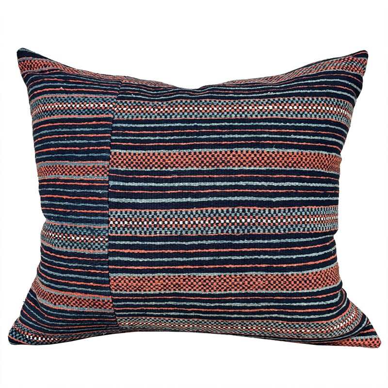 These cushions are made from a vintage Zhuang Nung wedding blanket. The blanket is hand loomed in thick cotton and has an iconic design from the Nung ethnic group within the Zhuang minority. It is known as salt and pepper. I absolutely love it and have bought several blankets in different colours. The colours on this blanket are light indigo, black, rust and off white. The blankets are woven on narrow looms, around 15" wide so the larger cushions have the seam of 2 panels to give a larger front. The cushions are backed with plain linen, and there are zip fasteners and deluxe feather pads.