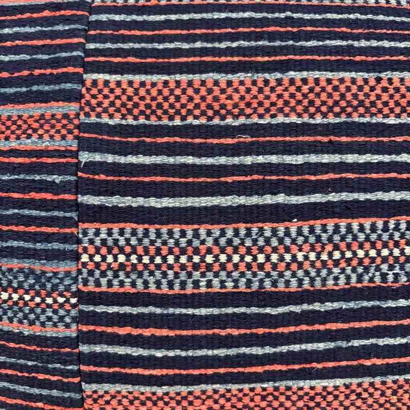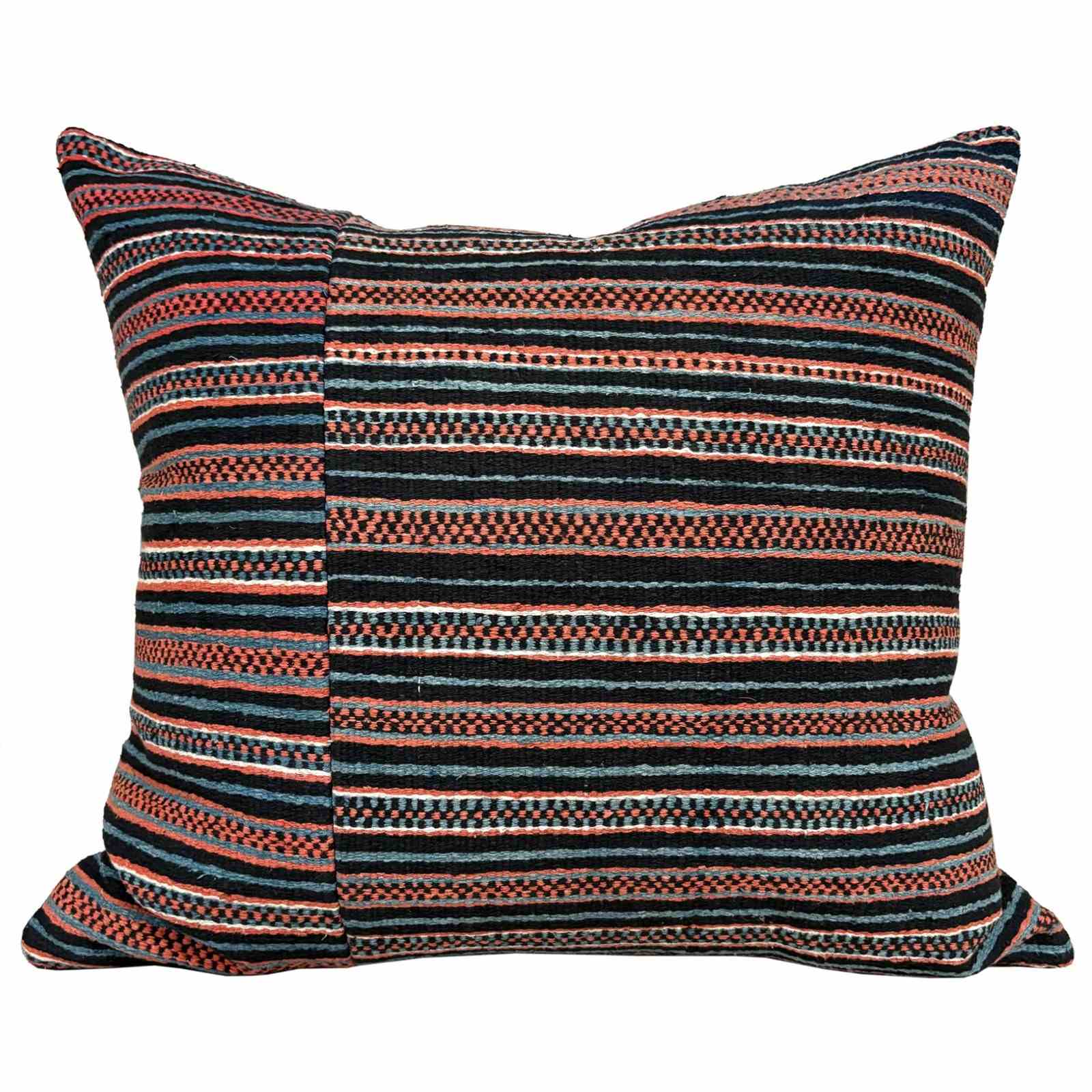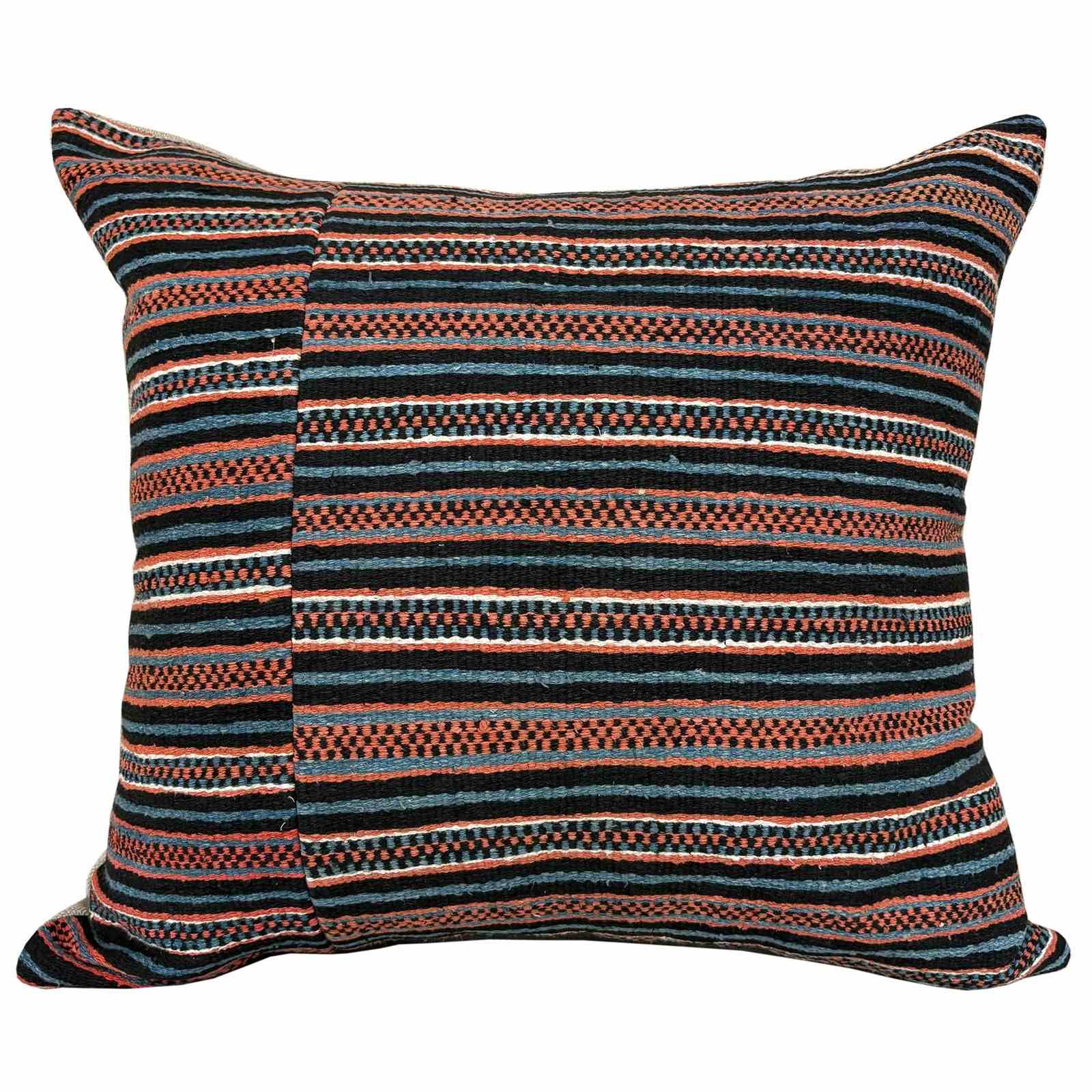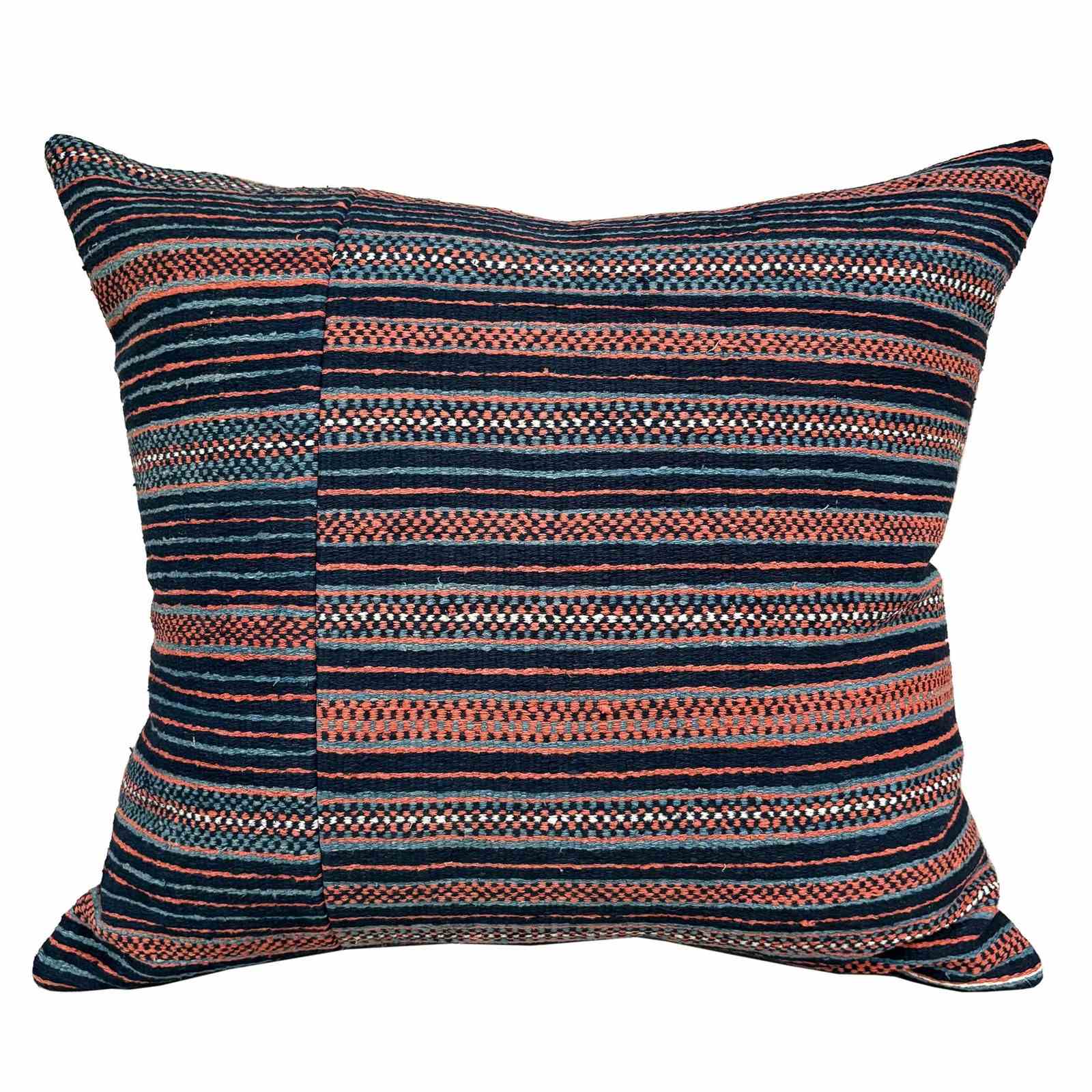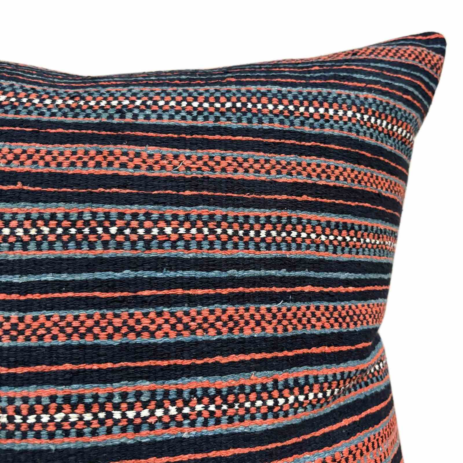 These cushions are made from a vintage Zhuang Nung wedding blanket. The blanket is hand loomed in thick cotton and has an iconic design from the Nung ethnic group within the Zhuang minority. It is known as salt and pepper. I absolutely love it and have bought several blankets in different colours. The colours on this blanket are light indigo, black, rust and off white. The blankets are woven on narrow looms, around 15" wide so the larger cushions have the seam of 2 panels to give a larger front. The cushions are backed with plain linen, and there are zip fasteners and deluxe feather pads.