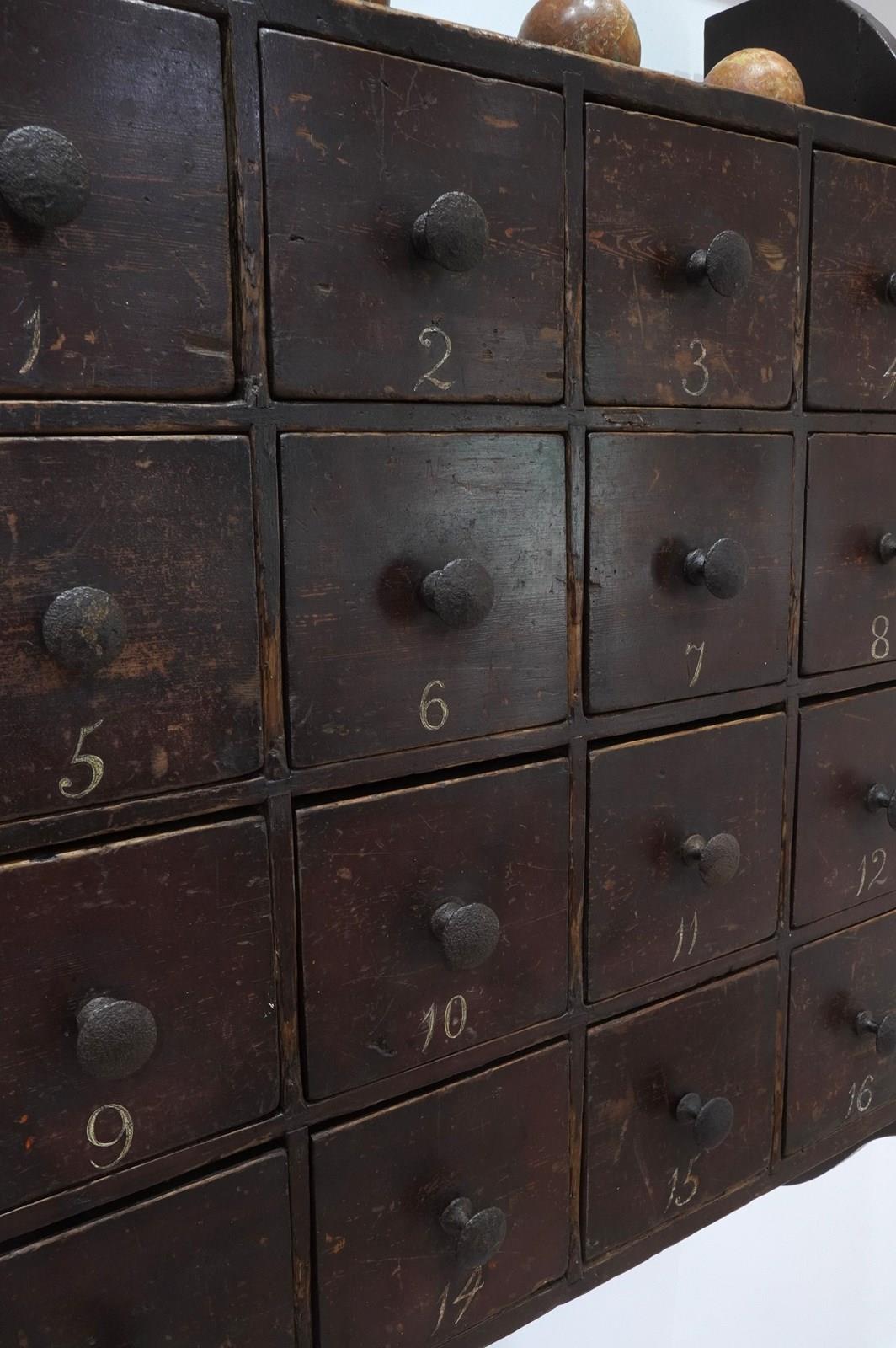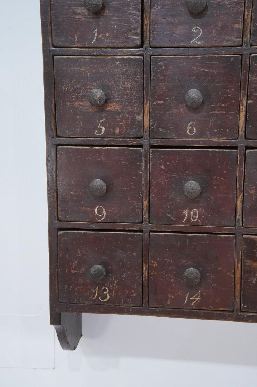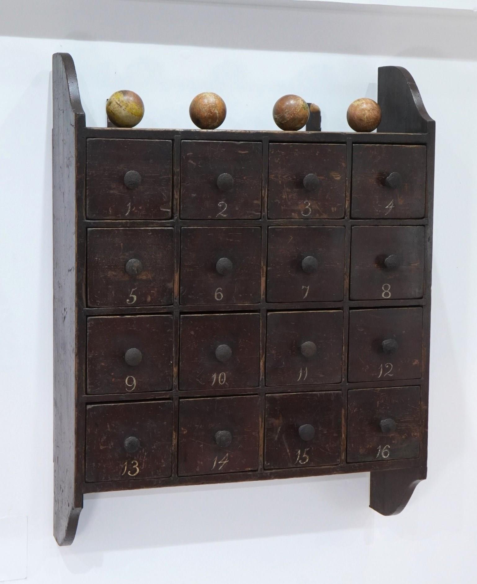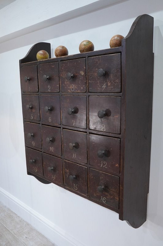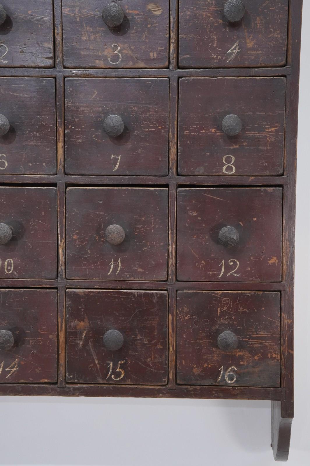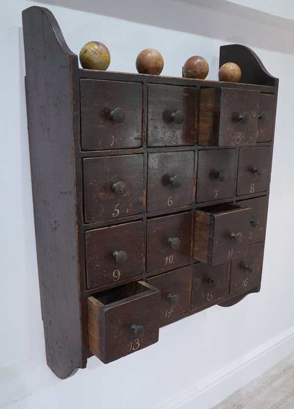 A large bank of sixteen 19th century English pine drawers all housed within their original hanging unit. Made in solid pine over a century ago then painted to replicate smarter mahogany suggests it may have been used in an office for documents or possibly a chemists. The painted surface has worn a little over the past century and more only adding to its mystique and history. The drawers are numbered 1 - 16 also in original paint, these were revealed whilst cleaning. The iron handles are the originals and complete this super cool bank of drawers. Original solid pine back boards. English pine drawers circa 1880.