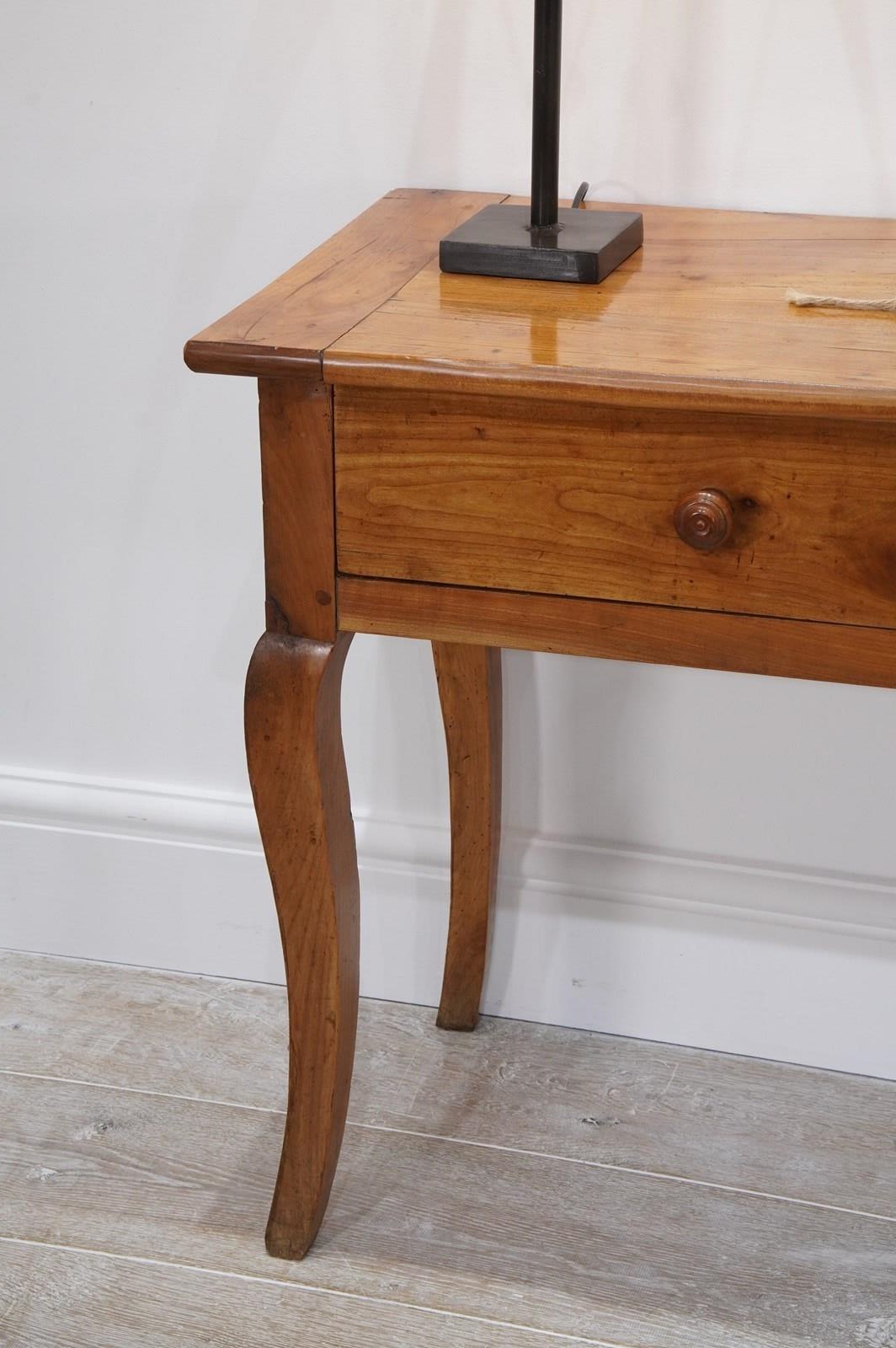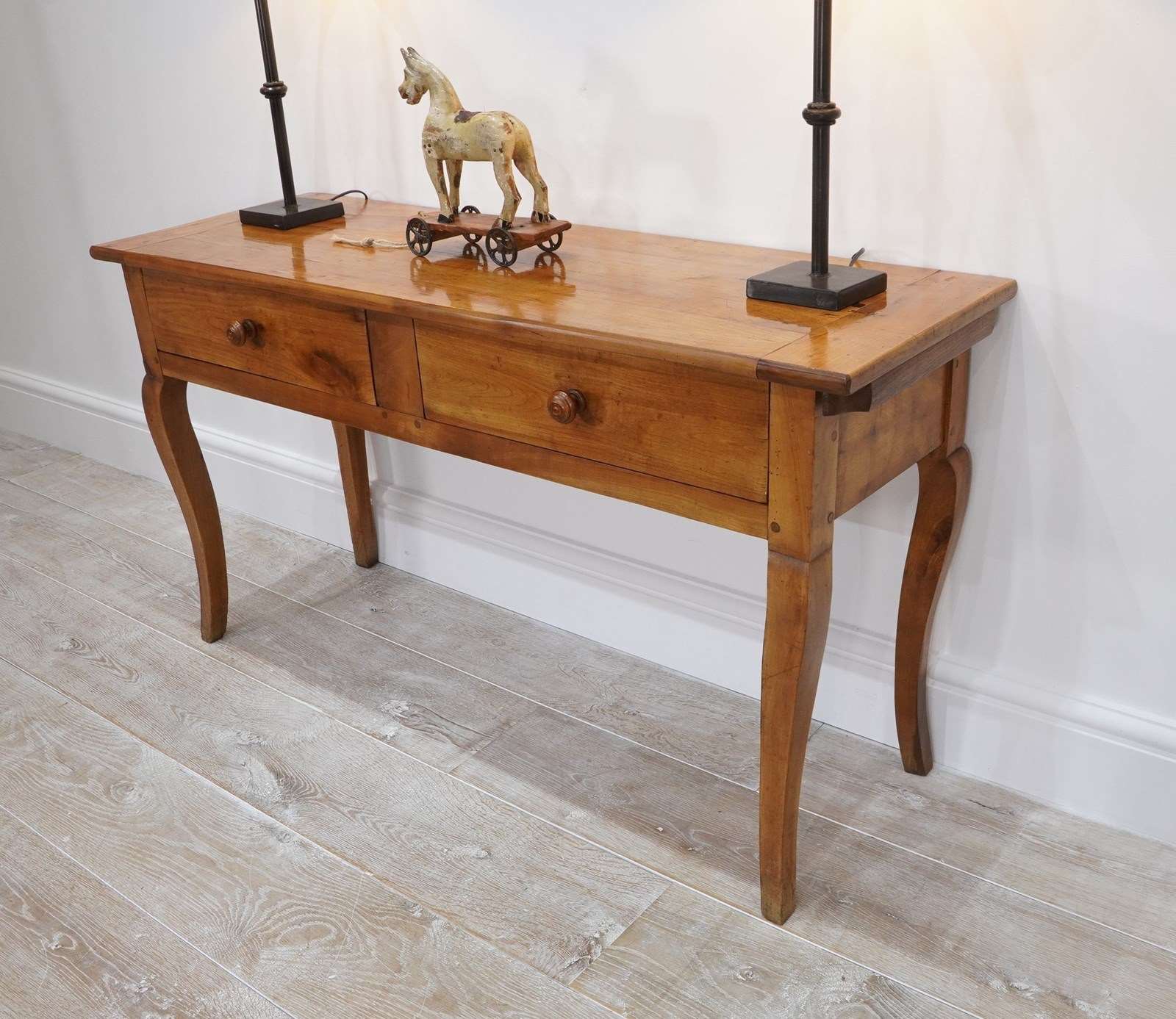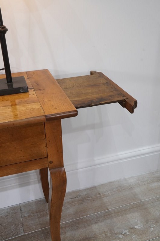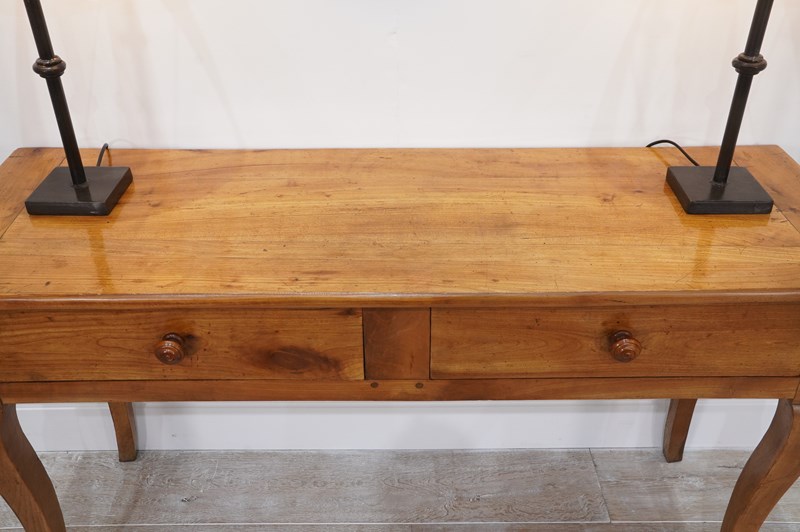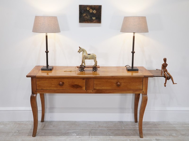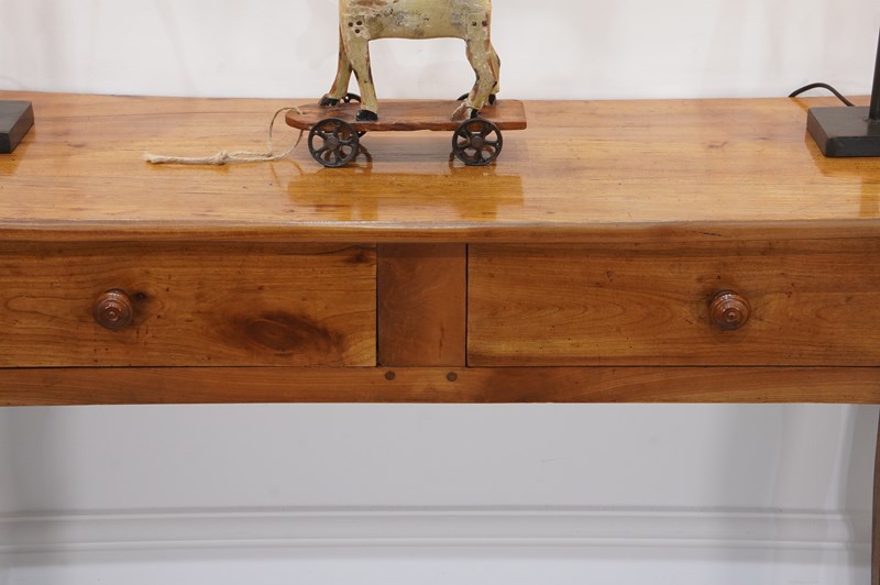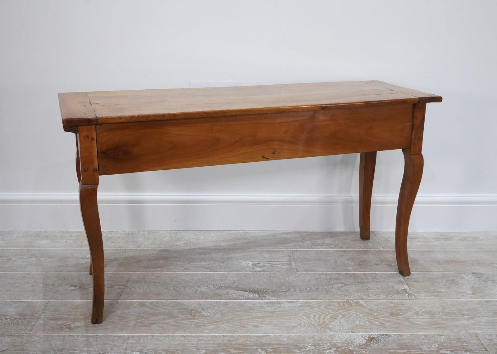 A 19th century French cherrywood console table. The neat size to this pretty table is such that will stand comfortably in any room or behind the sofa as a lamp table. The polished fruitwood top has the benefit of a bread slide to one end which in turn sits above two wide drawers, both with original turned wood handles all raised on elegant cabriole legs. Perfect for the period or contemporary home. Super pale honey colour.
