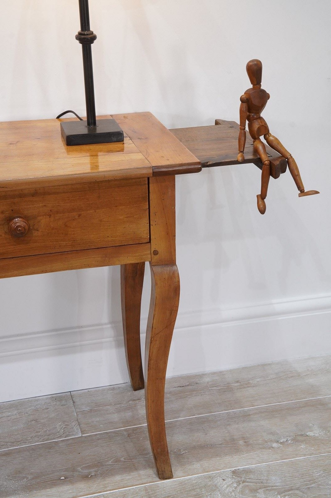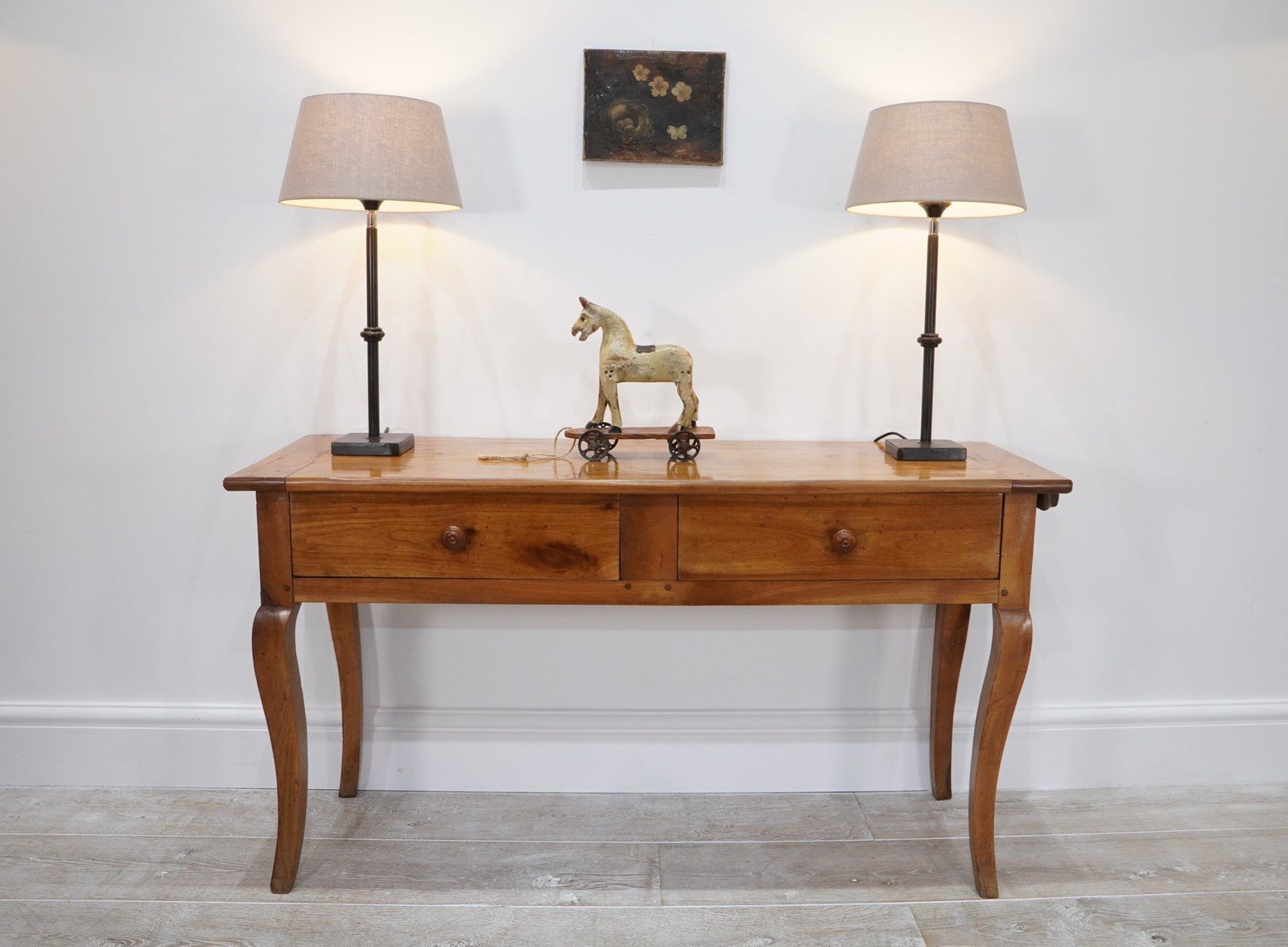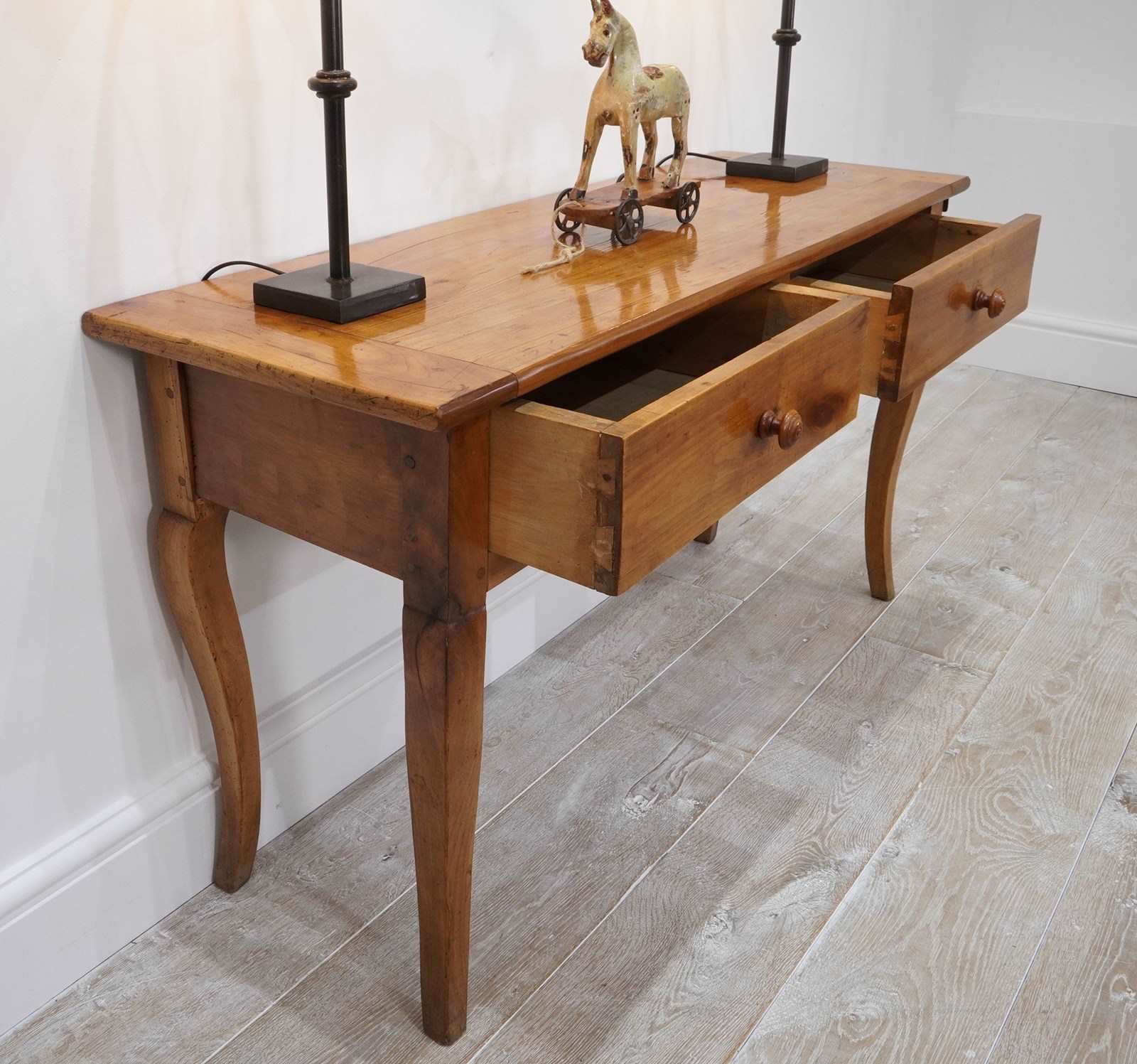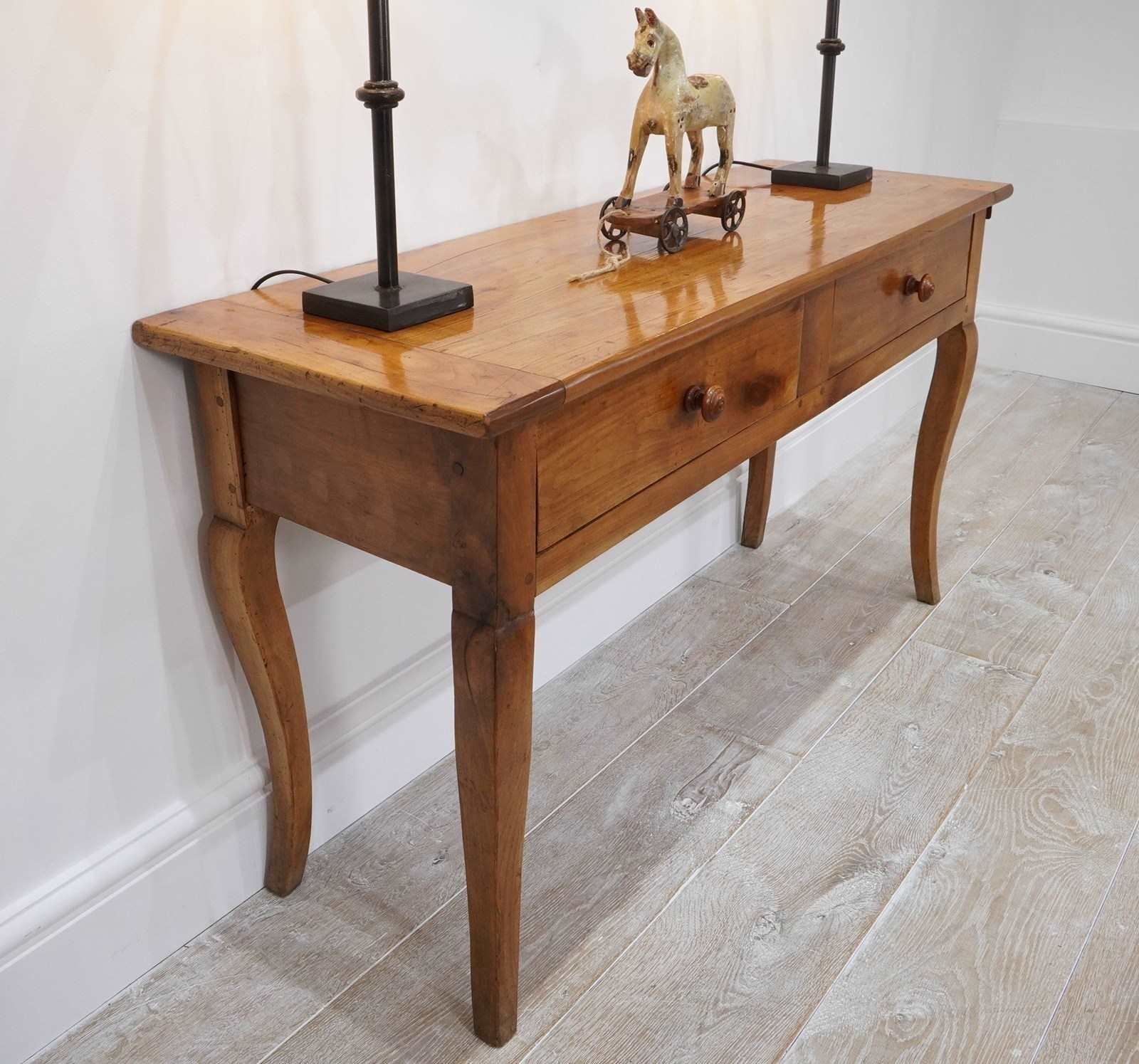 A 19th century French cherrywood console table. The neat size to this pretty table is such that will stand comfortably in any room or behind the sofa as a lamp table. The polished fruitwood top has the benefit of a bread slide to one end which in turn sits above two wide drawers, both with original turned wood handles all raised on elegant cabriole legs. Perfect for the period or contemporary home. Super pale honey colour.