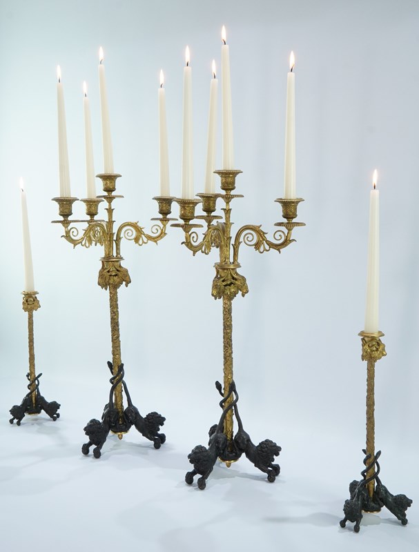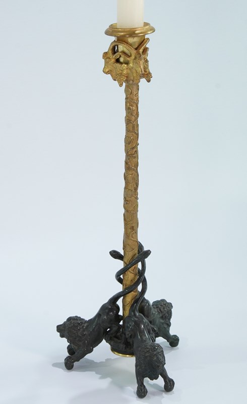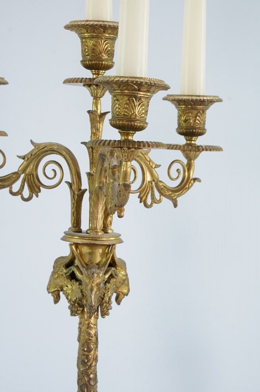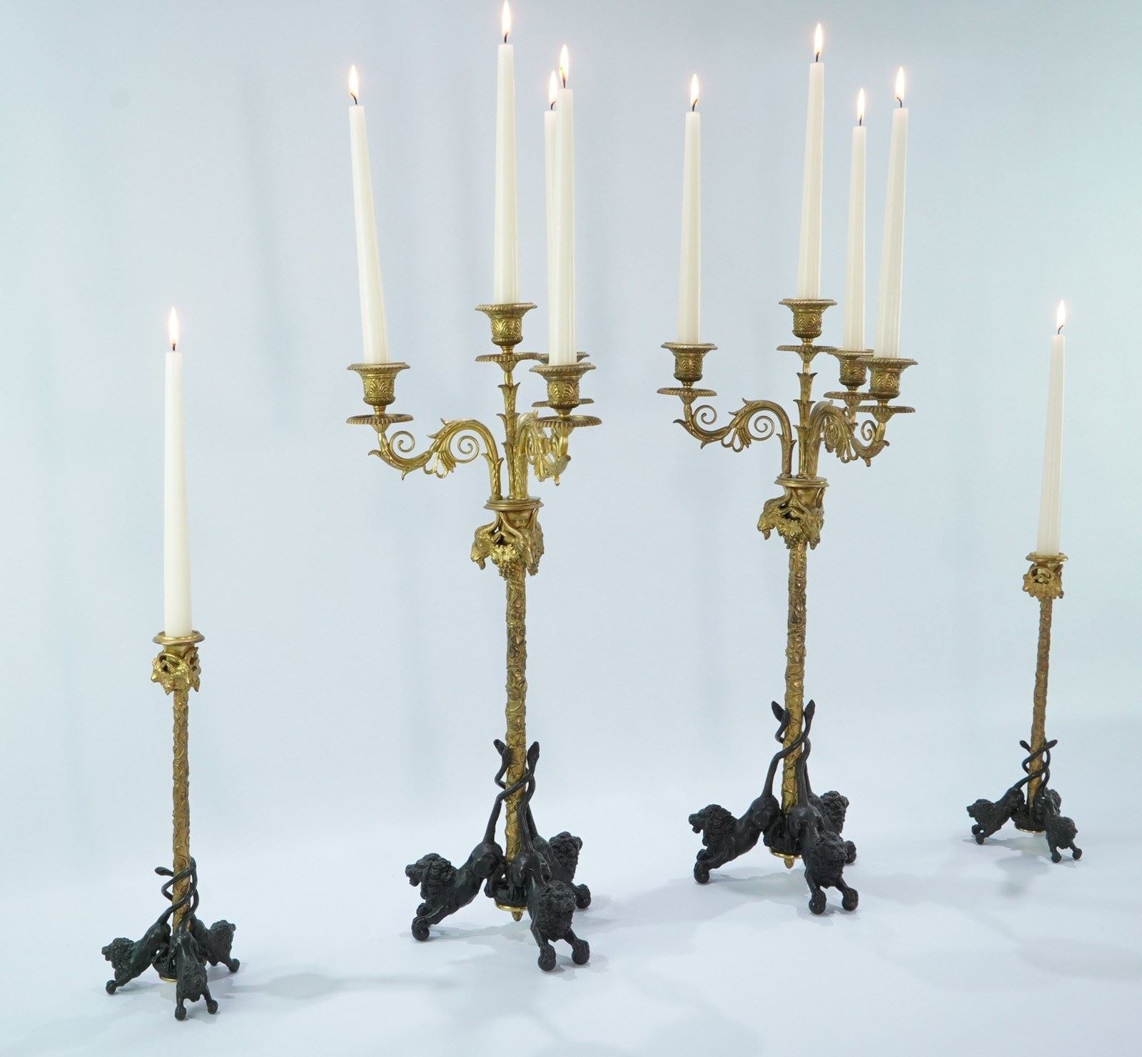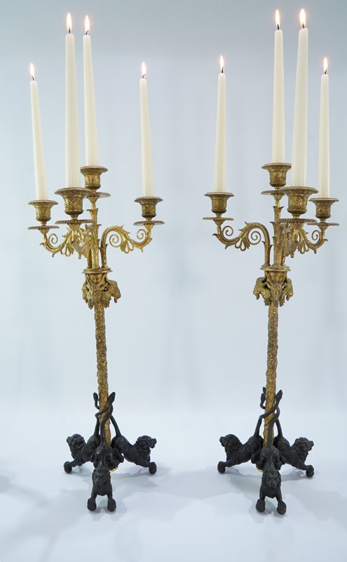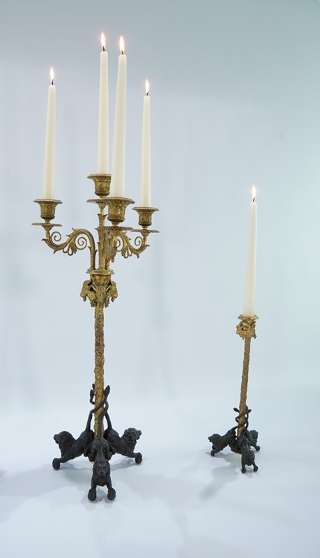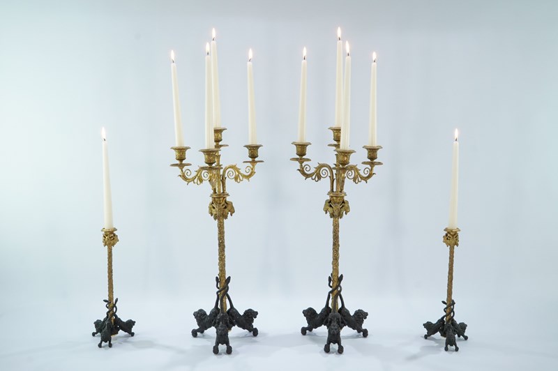 The most opulent and impressive English Regency patinated bronze and ormolu four branch candelabra and single candlesticks. Vine clad stems rise above three Lions their tails entwined and hinds raised. Small bunches of grapes can be found nestling between three rams heads giving the illusion of supporting intricate scrolling branches, each branch terminating with a candle holder and drip tray. A stem of acanthus leaves support the fourth candle holder above. The crisp chased detail is clean and precise indicating the highest quality. We know a little of the history behind these magnificent candelabra and candlesticks which have been within the same family for many years in a town house in East Sussex. Early 19th century candelabra, perfect for formal dining or mantle shelf.