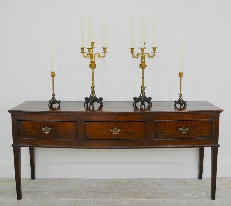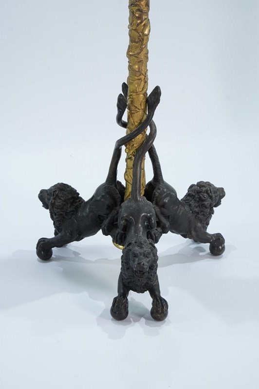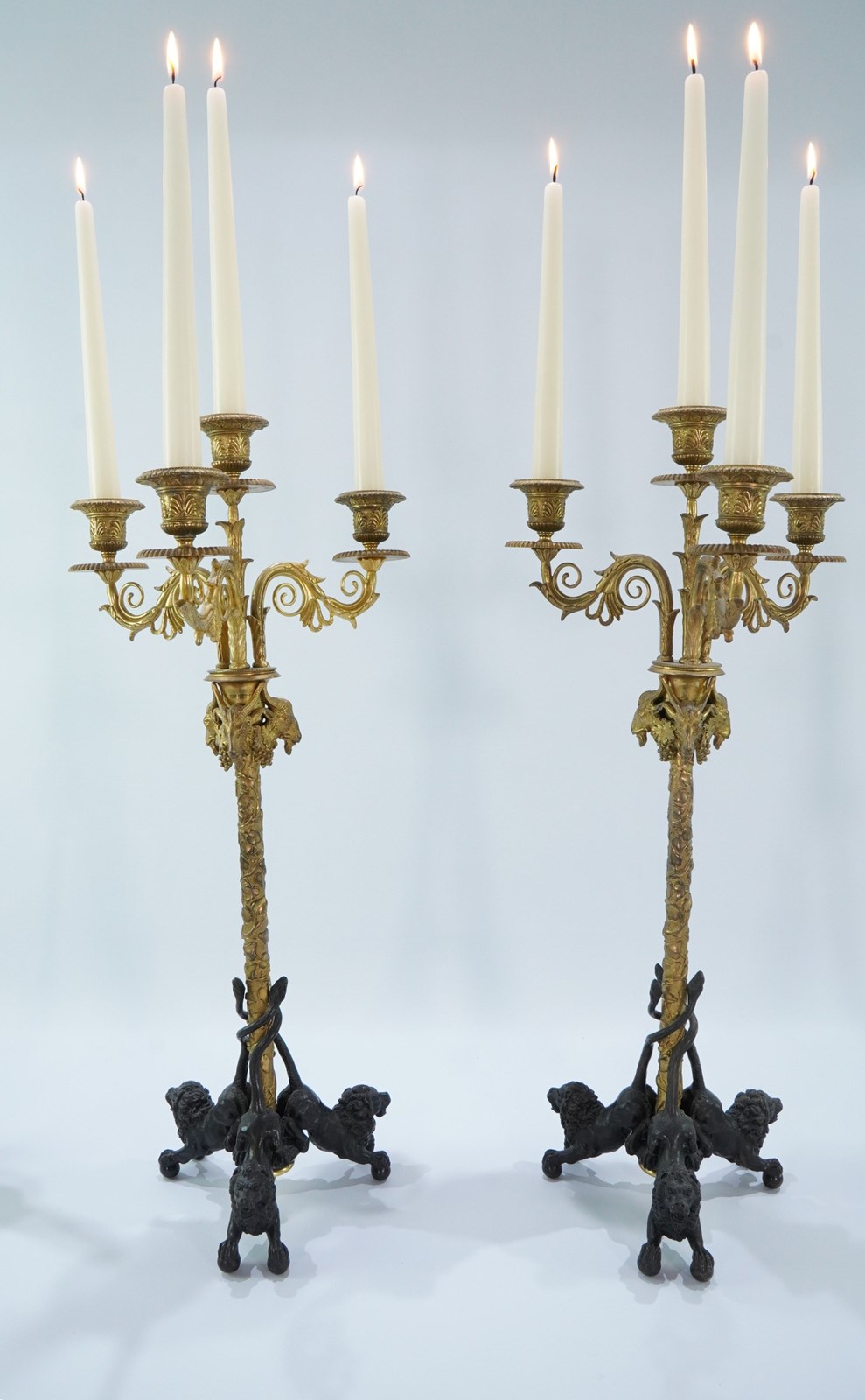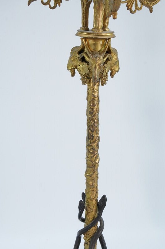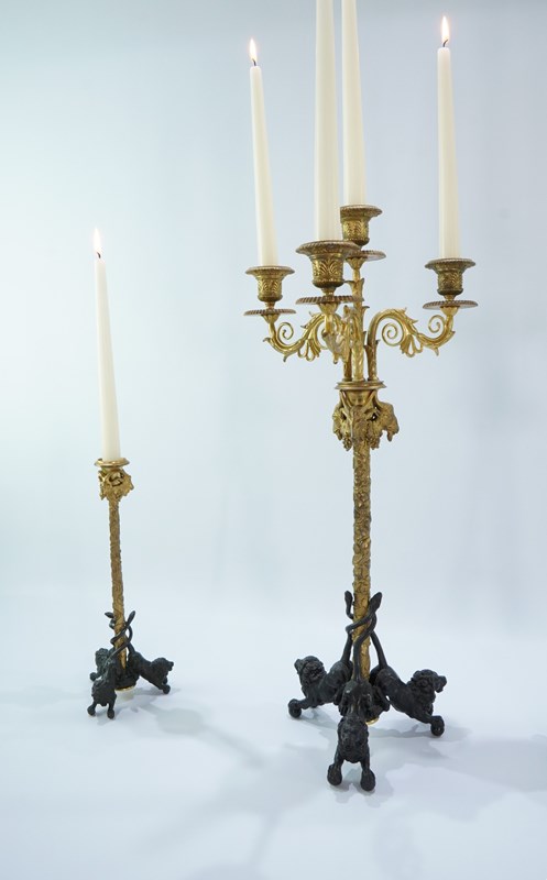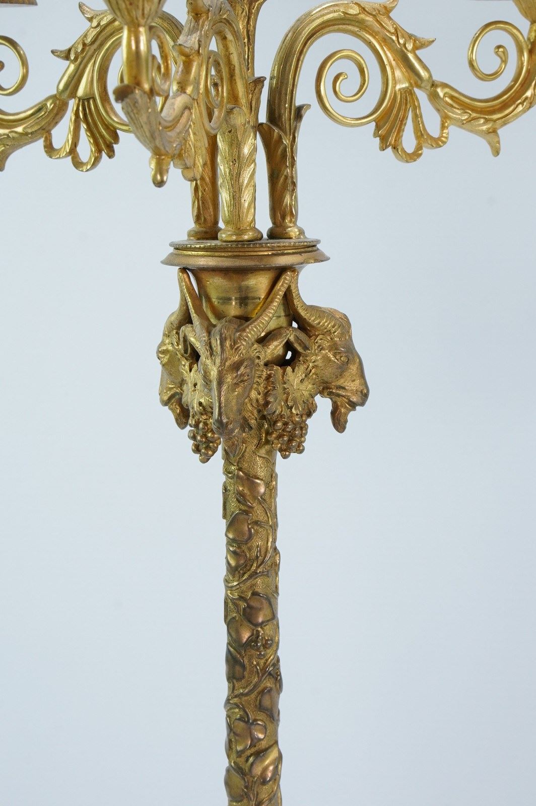 The most opulent and impressive English Regency patinated bronze and ormolu four branch candelabra and single candlesticks. Vine clad stems rise above three Lions their tails entwined and hinds raised. Small bunches of grapes can be found nestling between three rams heads giving the illusion of supporting intricate scrolling branches, each branch terminating with a candle holder and drip tray. A stem of acanthus leaves support the fourth candle holder above. The crisp chased detail is clean and precise indicating the highest quality. We know a little of the history behind these magnificent candelabra and candlesticks which have been within the same family for many years in a town house in East Sussex. Early 19th century candelabra, perfect for formal dining or mantle shelf.