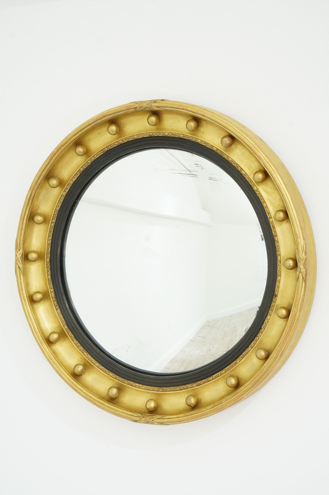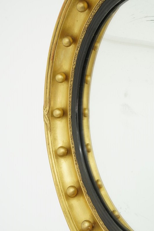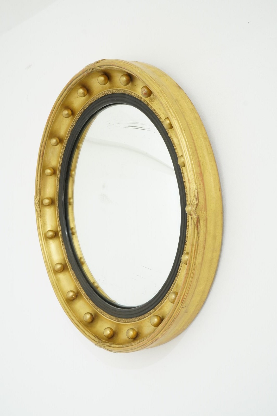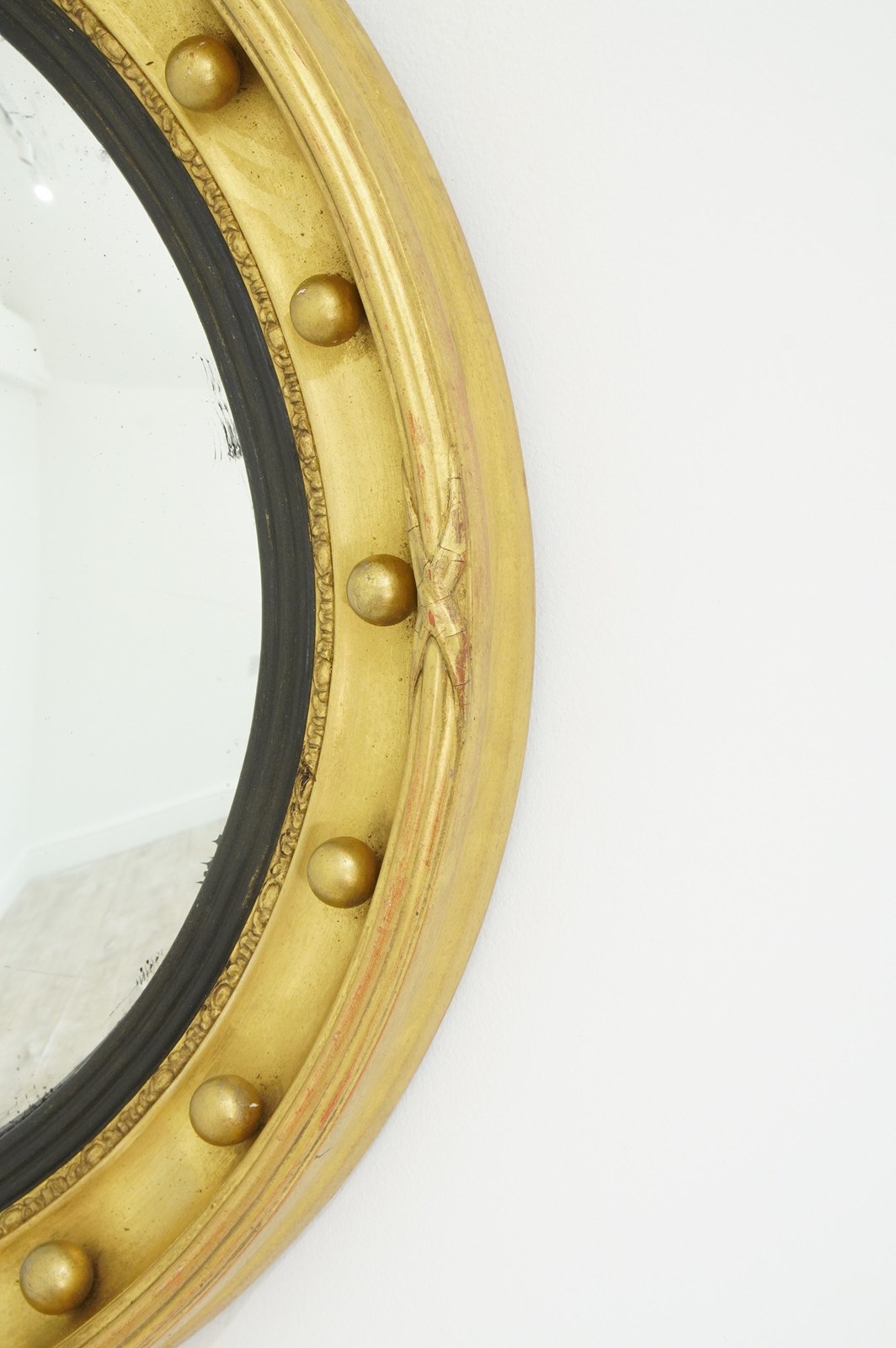 A large 19th century circular convex wall mirror. The wide frame to this iconic mirror is decorated with a series of twenty gilded spheres all arranged around the original convex mirror plate. The mirror is set behind a reeded ebonised slip. The original gilded surface is deep and lustrous with just a few rubs revealing the pinkish basecoat. Some minor surface marks to the mirror plate. English convex mirror circa 1880.
