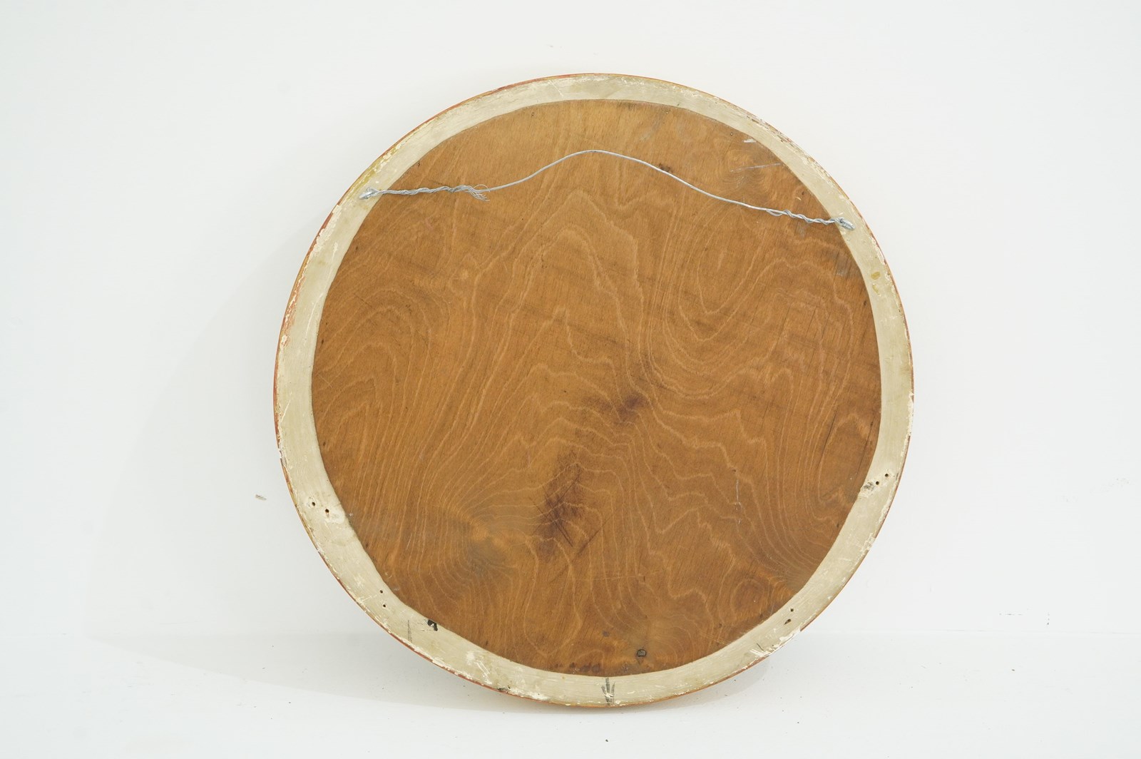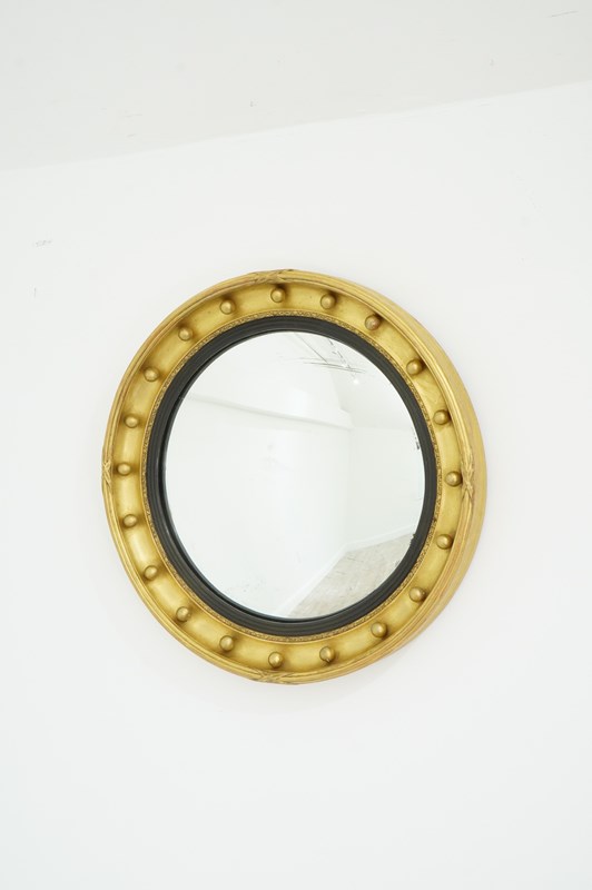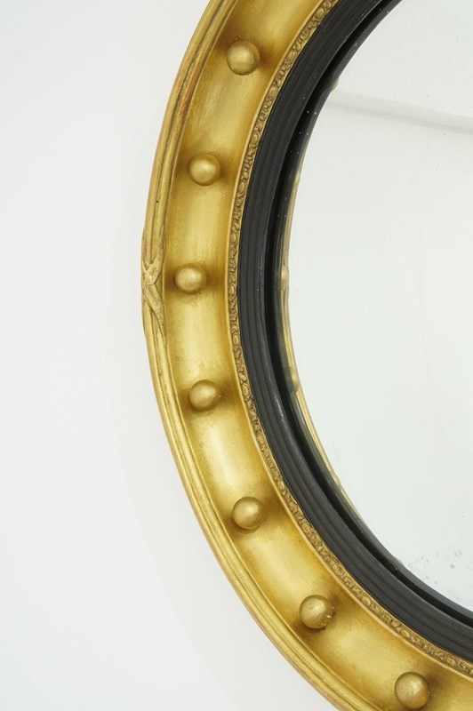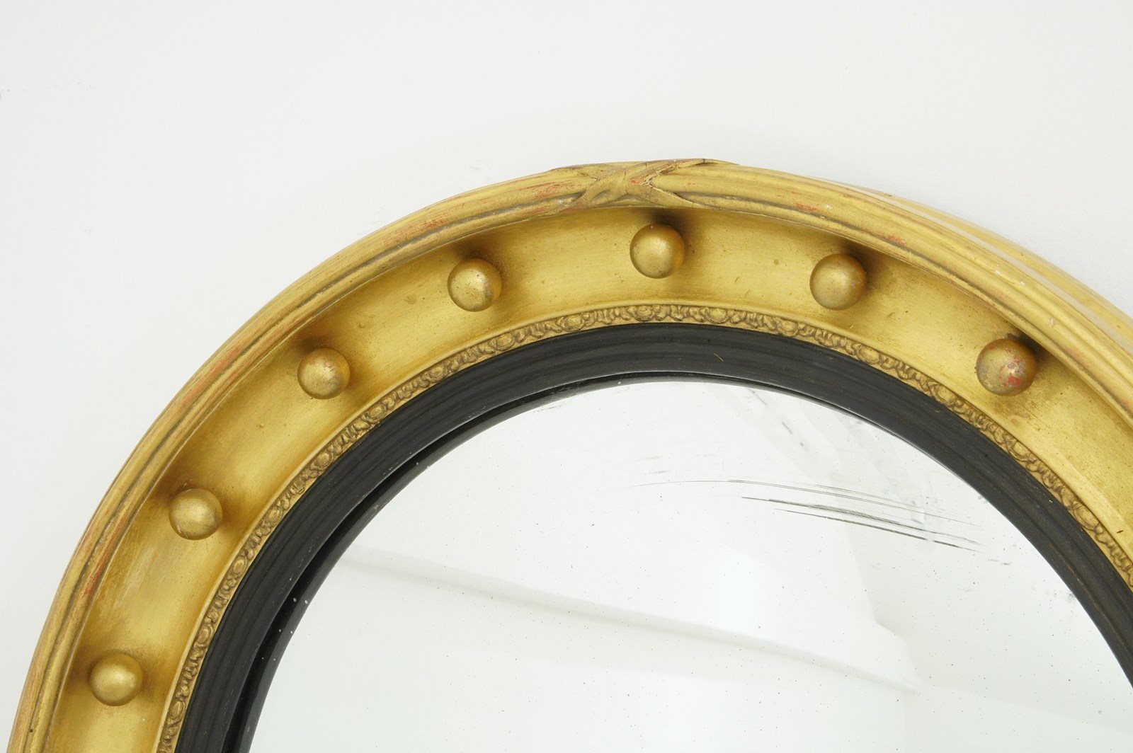 A large 19th century circular convex wall mirror. The wide frame to this iconic mirror is decorated with a series of twenty gilded spheres all arranged around the original convex mirror plate. The mirror is set behind a reeded ebonised slip. The original gilded surface is deep and lustrous with just a few rubs revealing the pinkish basecoat. Some minor surface marks to the mirror plate. English convex mirror circa 1880.