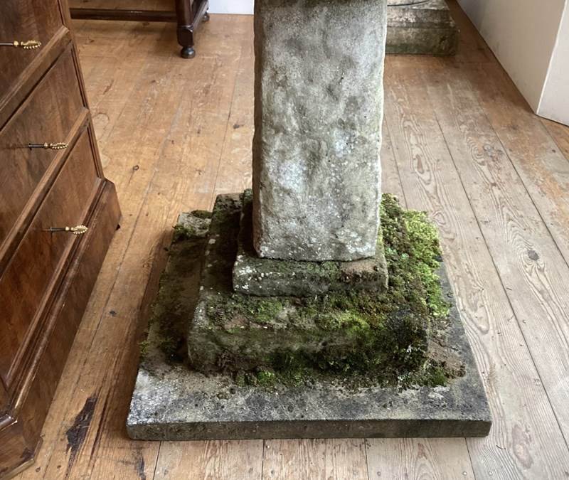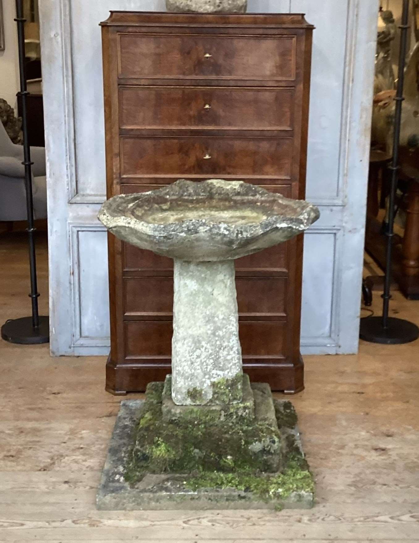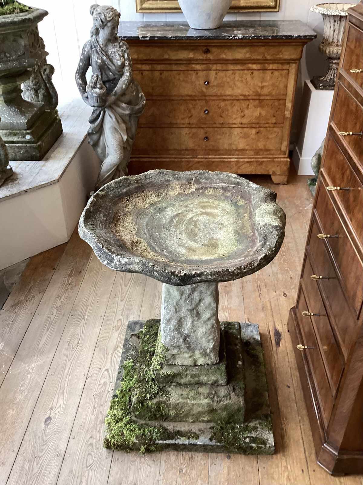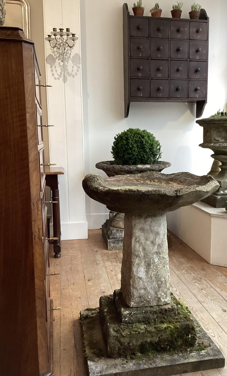 A mid century composite bird bath of unusually large scale. This stunning centre piece bird bath has rested in a beautiful garden known to us for over fifty years, in that time it has developed a wonderfully lush mossy surface to the base. The bath itself is in the form of a large shallow clam shell. The shell sits upon a substantial column raised on three square graduating flagstones. Large English weathered bird bath. Circa 1960.