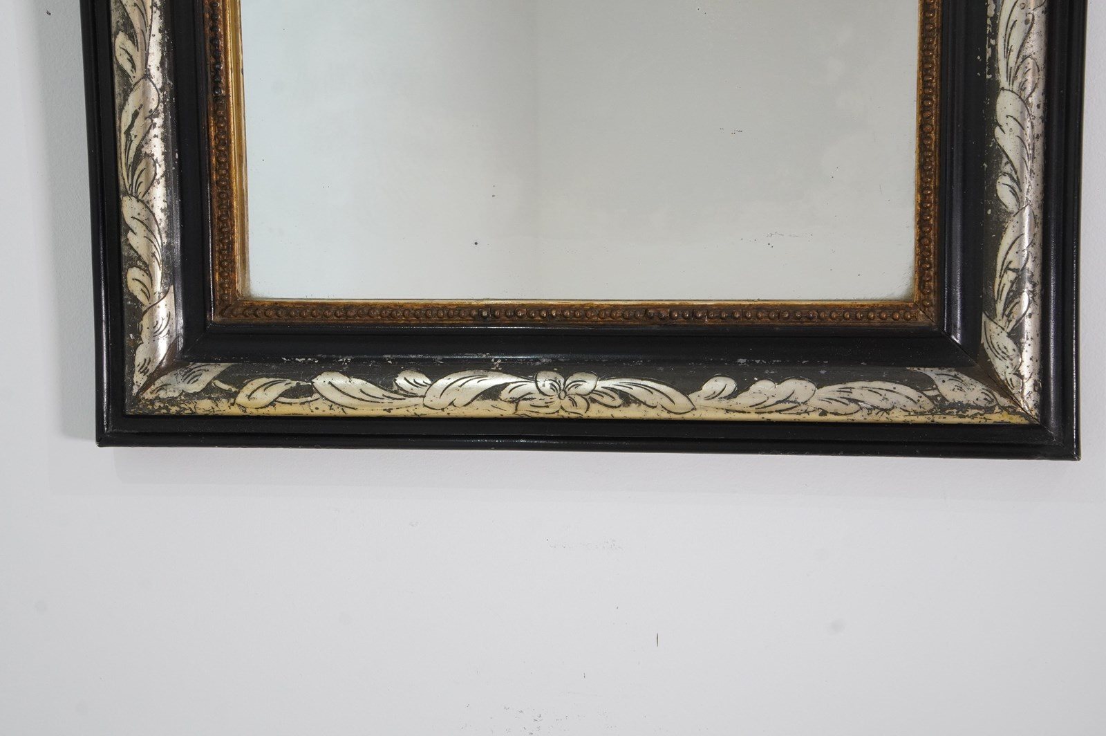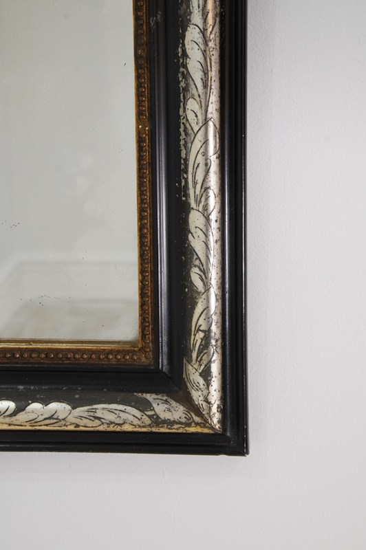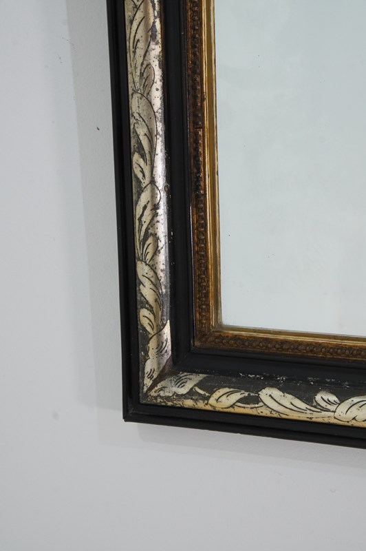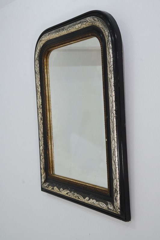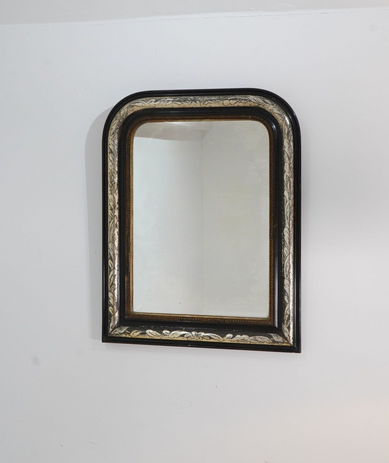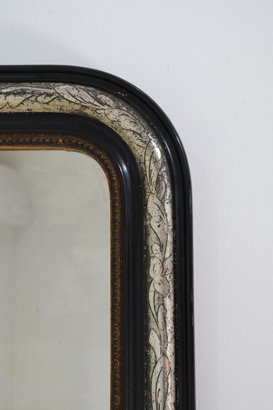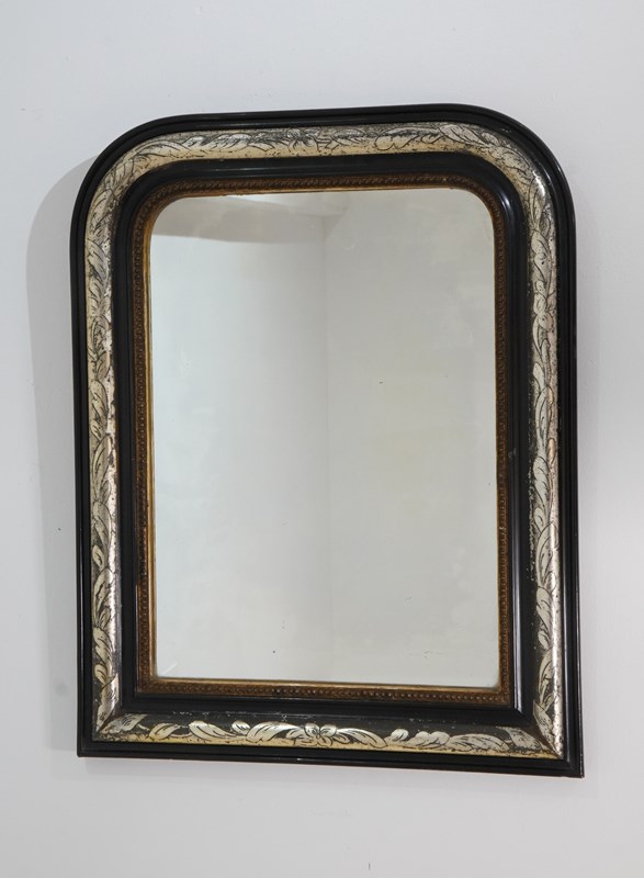 A small 19th century silver leaf powder room mirror. The silver leaf is decorated with an etched design of flowers and leaves entwining around the entire frame. The silver surround is complimented by an ebonised black border to either side with a neat row of tiny gilded gesso beads to the edge of the original mirror plate. Original backboards. Some natural historical wear only adding to its charm.