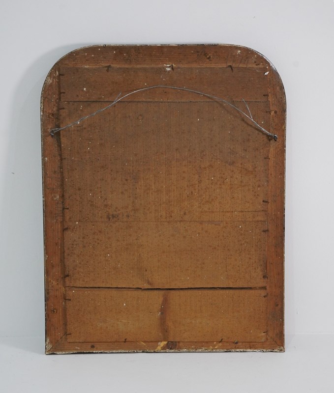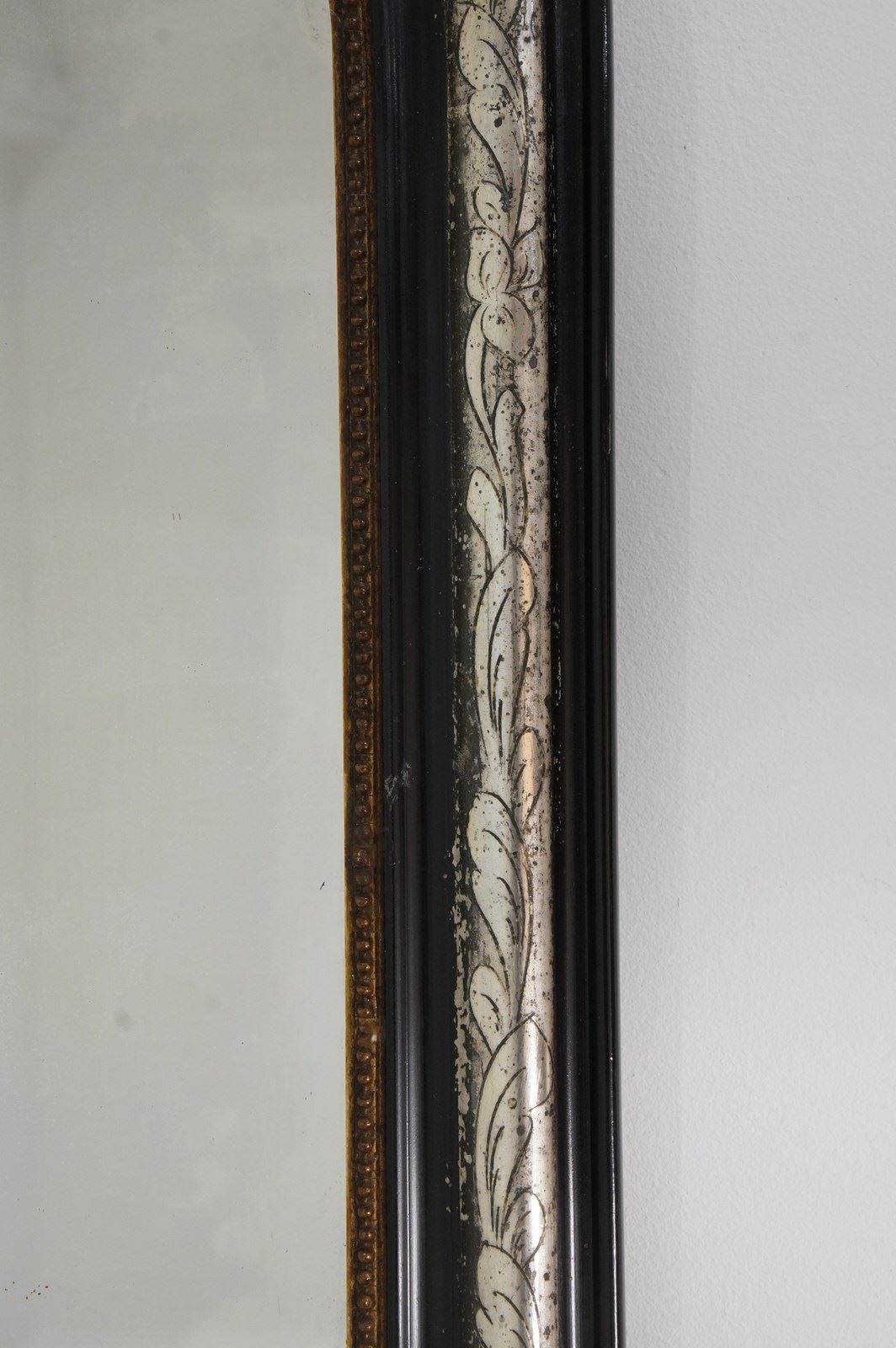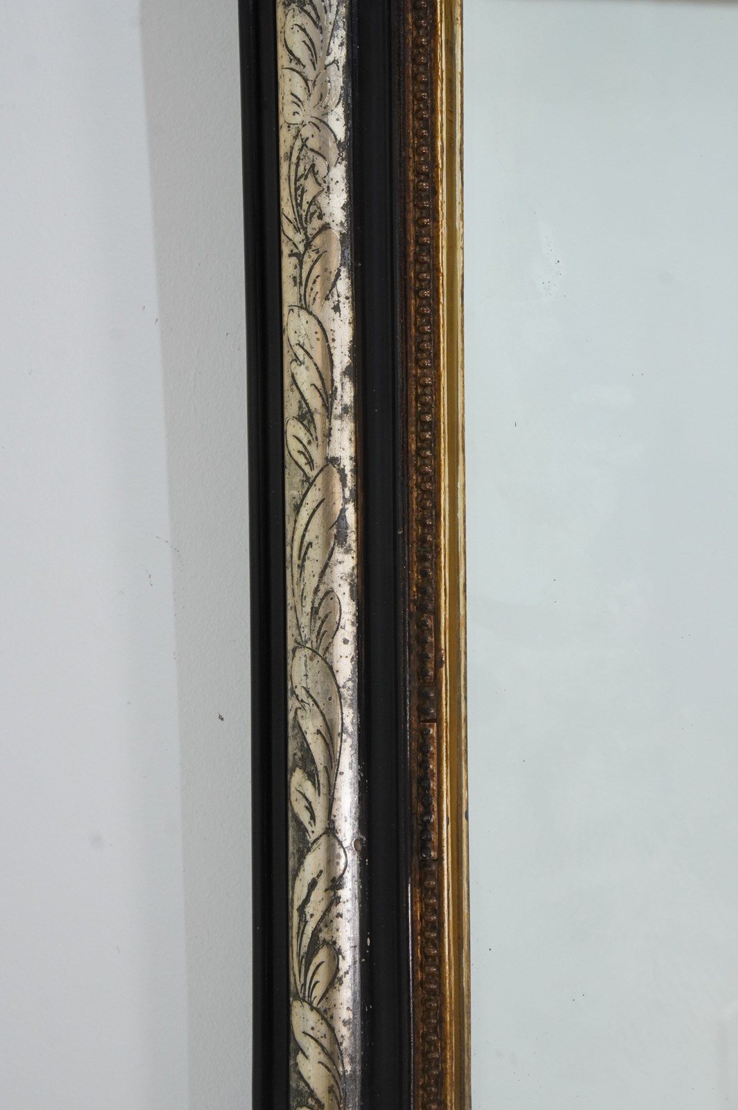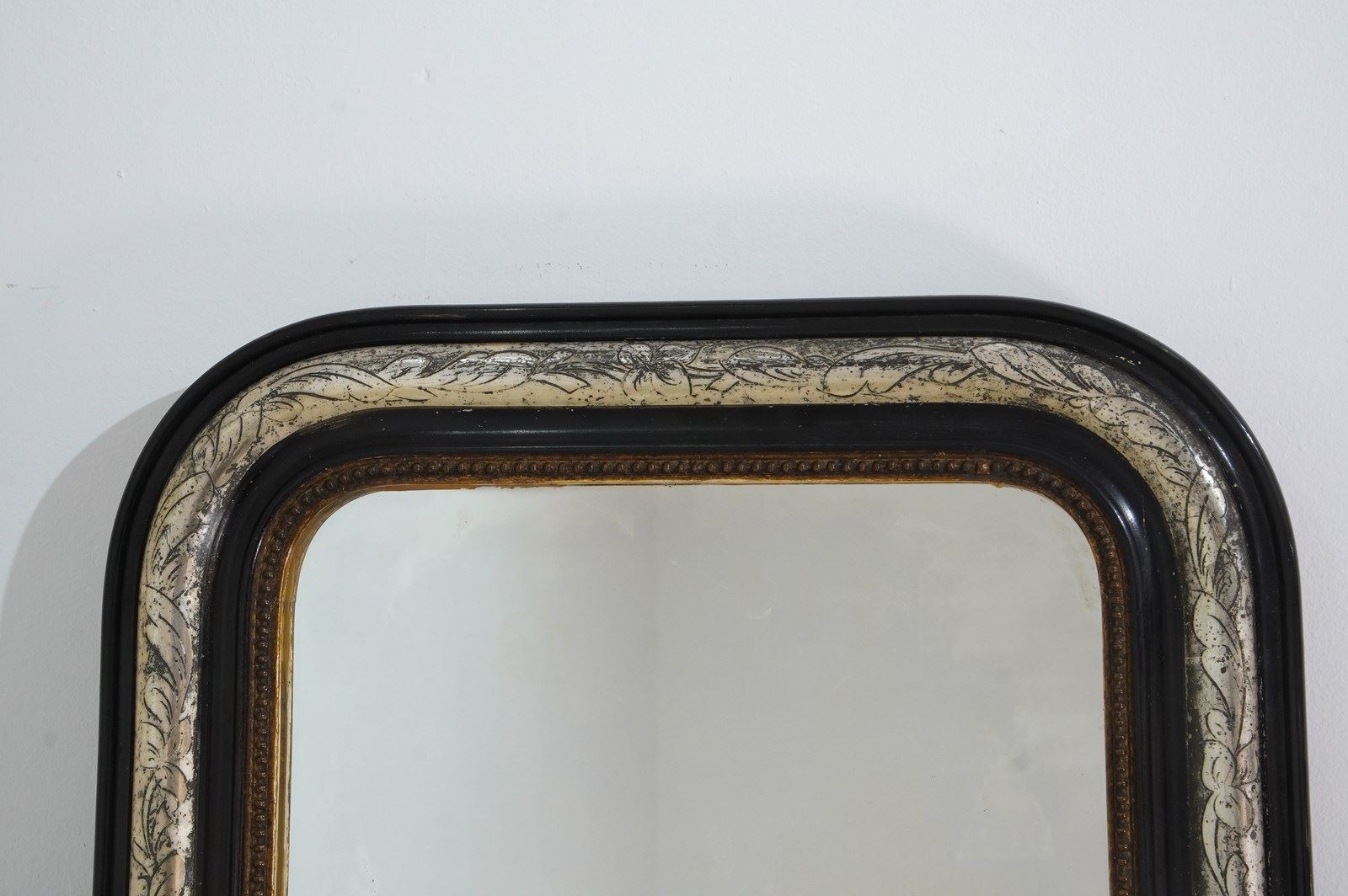 A small 19th century silver leaf powder room mirror. The silver leaf is decorated with an etched design of flowers and leaves entwining around the entire frame. The silver surround is complimented by an ebonised black border to either side with a neat row of tiny gilded gesso beads to the edge of the original mirror plate. Original backboards. Some natural historical wear only adding to its charm.